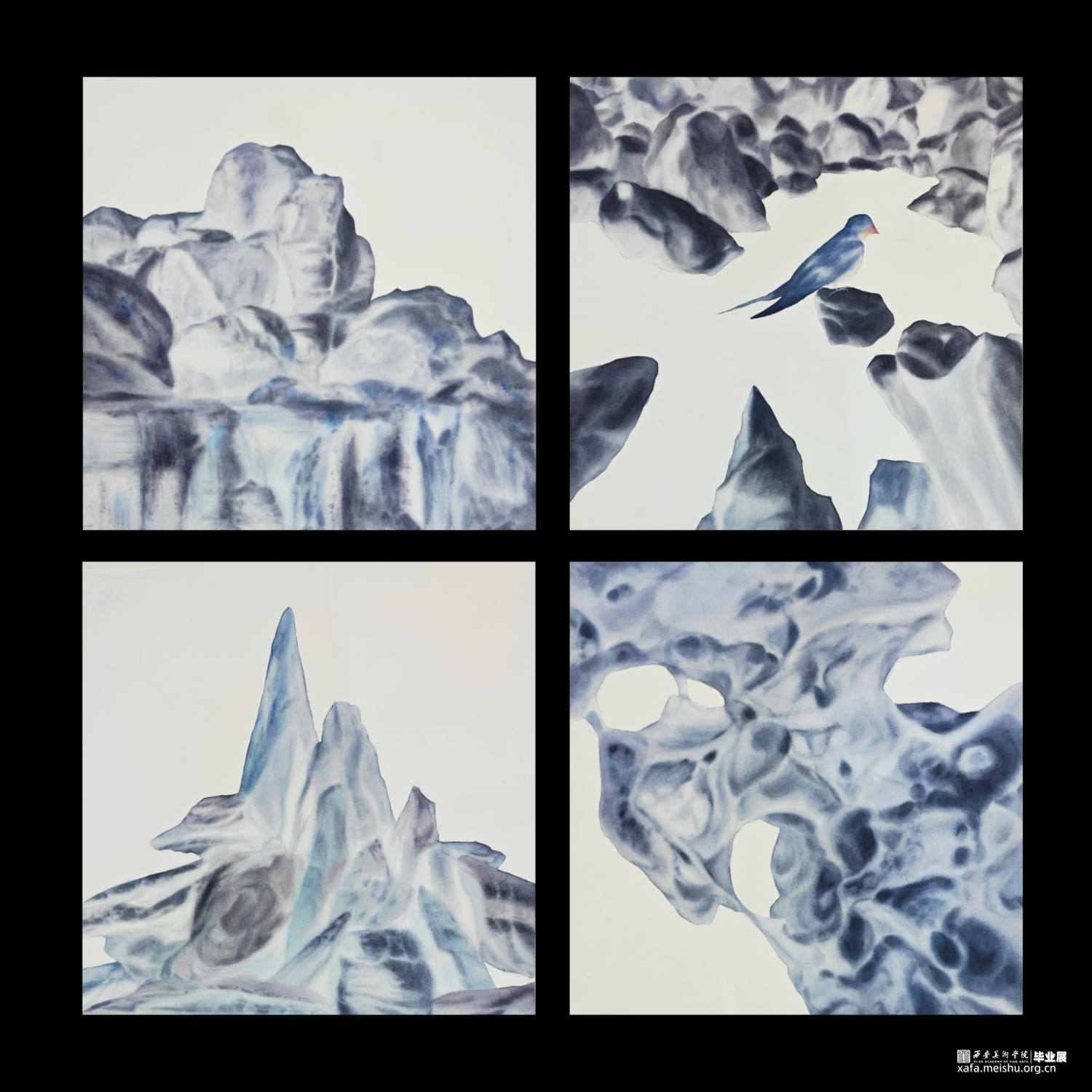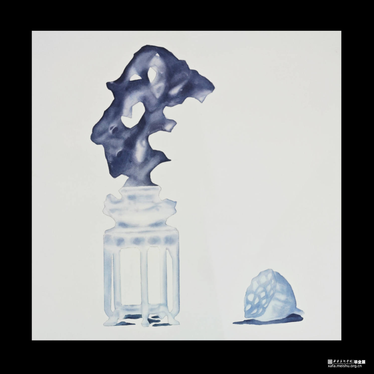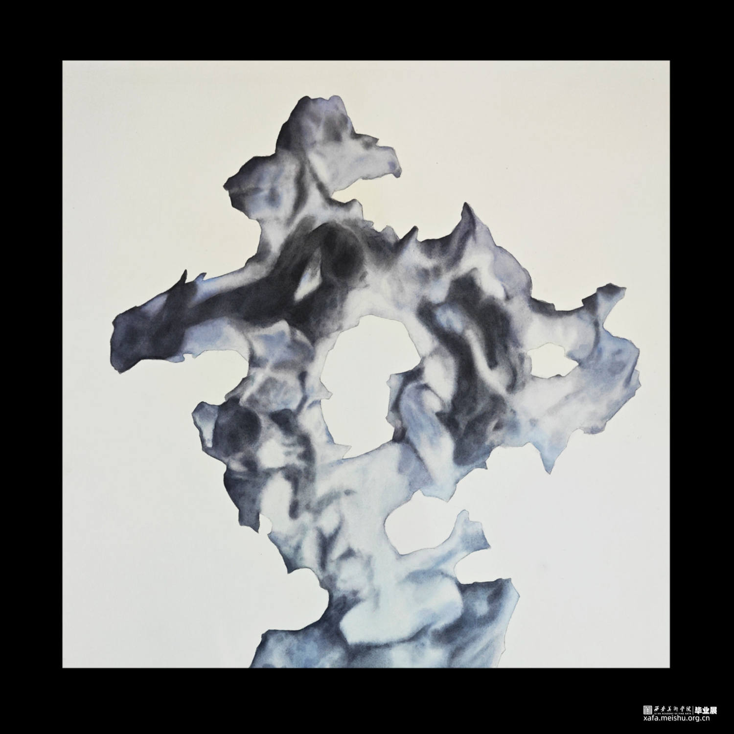 石头,在中国传统文化中是一种别致的意象,他们用凝固的时间让我们见证了山水的故事,风的从前,而在此作中采用了留白和写意的手法,展现了每一块石头在时间风雨的雕刻下展现出的独一无二的重生。