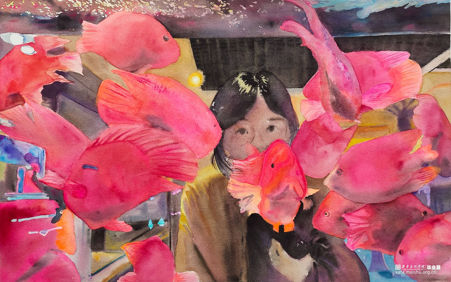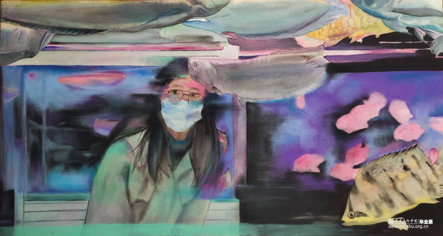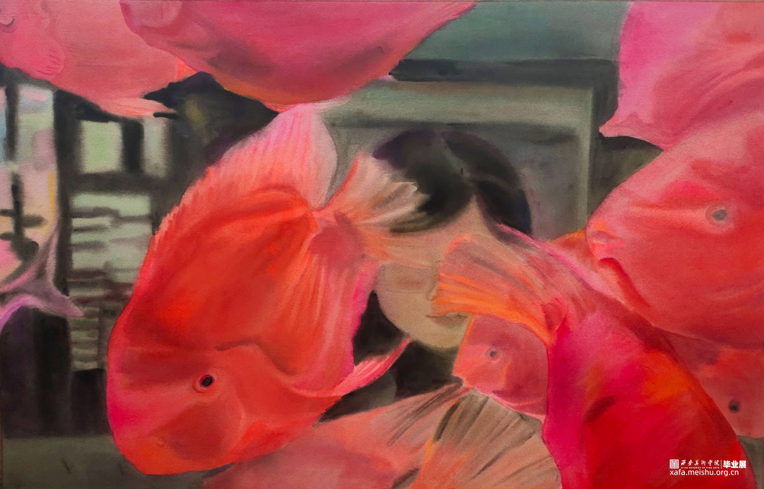 这一系列作品是以游动的鱼和人的互动为主题,画中一群红色的游动的鱼象征着人们无限的勇气和对未来的向往与期盼,而在后面透过玻璃想前方看去的模糊人影,则体现了一种人们对于未知的未来已经模糊的思想的一种远大的目光和追求,更加形象的表达出了对美好未来的大胆想象和无限憧憬。