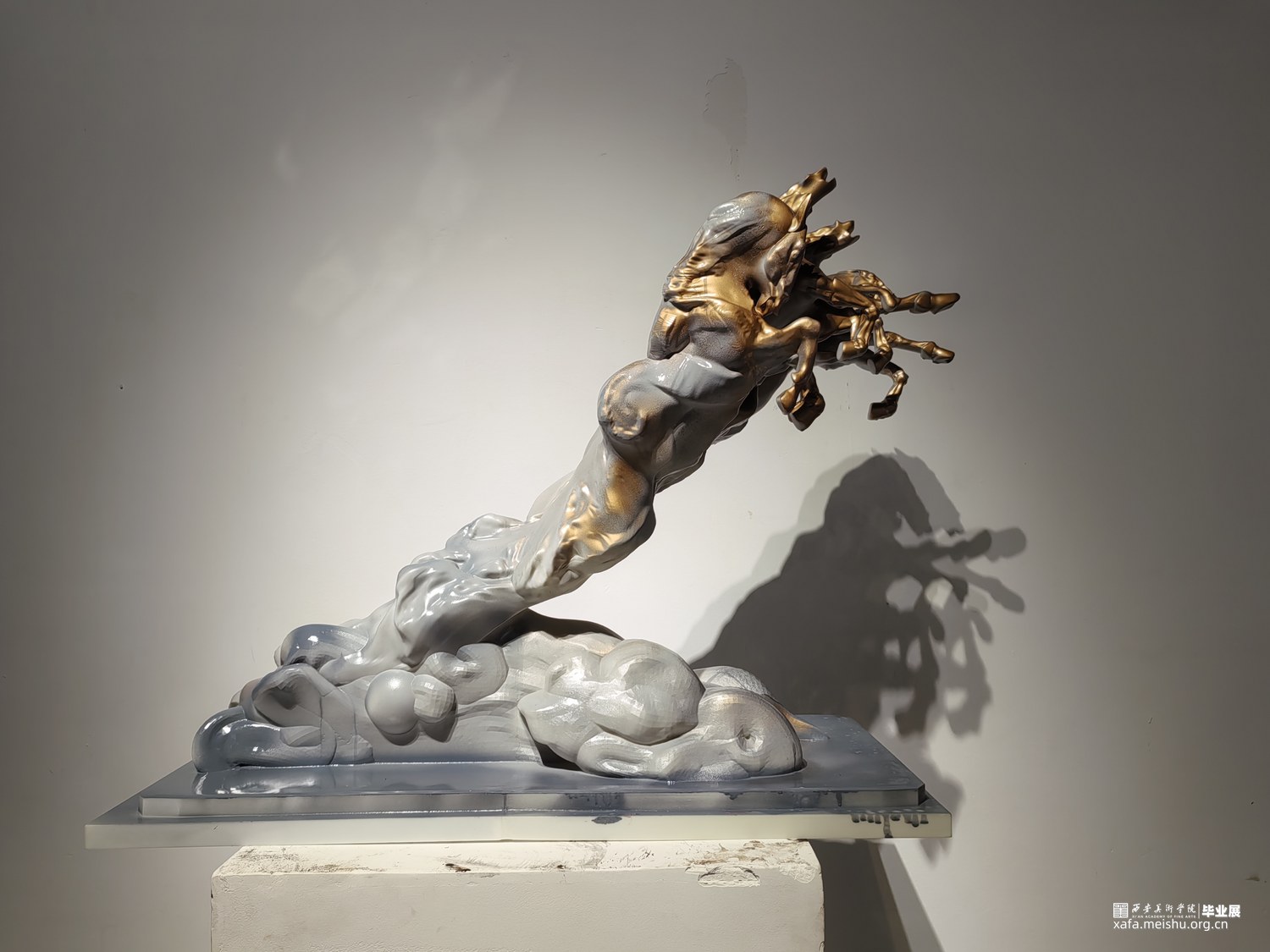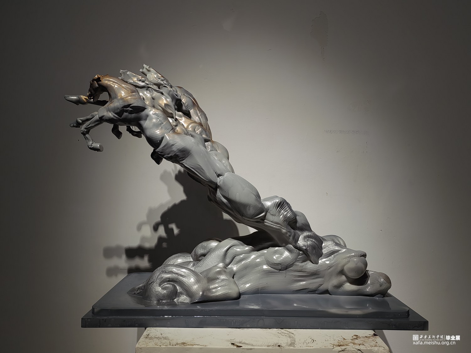 雕塑2 破云 我所做的事 四匹破云而出的骏马各是奔跑扬蹄的动态,各具特色,奋勇向前,豪气破云。第一层象征着4匹骏马扬蹄踏来带着青年的朝气与勇气不惧怕失败与困难将青春纵情燃烧,大放异彩。而他们又姿态各不相同。第二,相互竞争,充满竞技,兼容并蓄,共同发展进步。