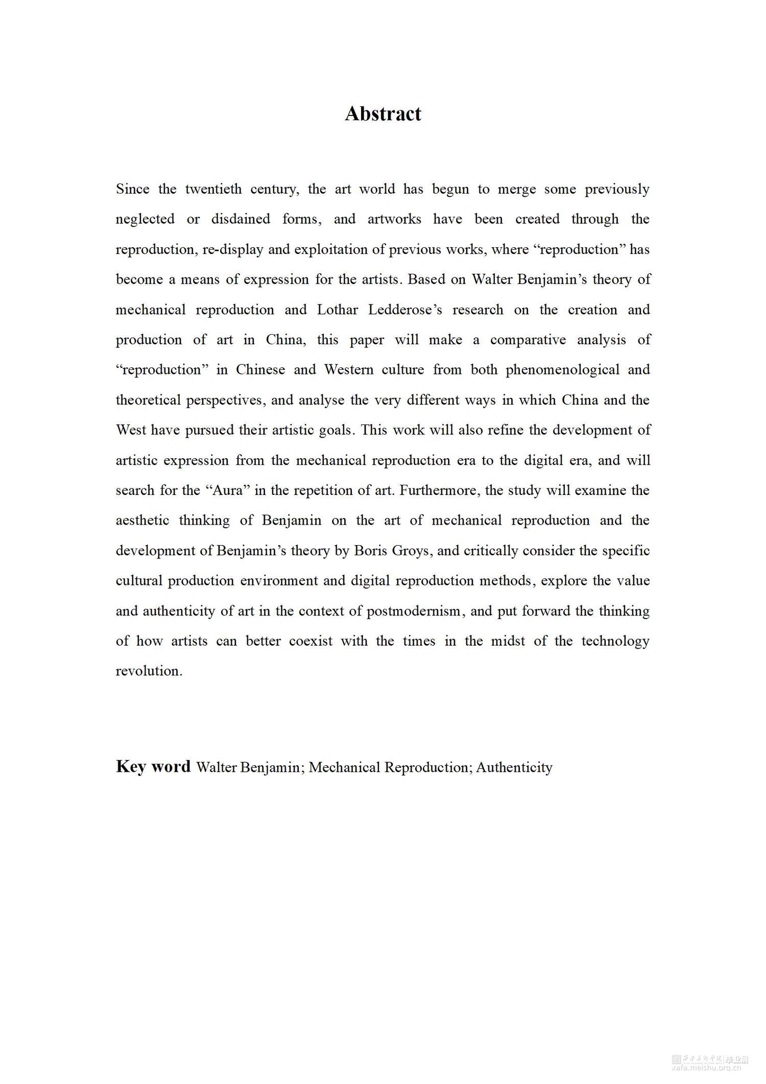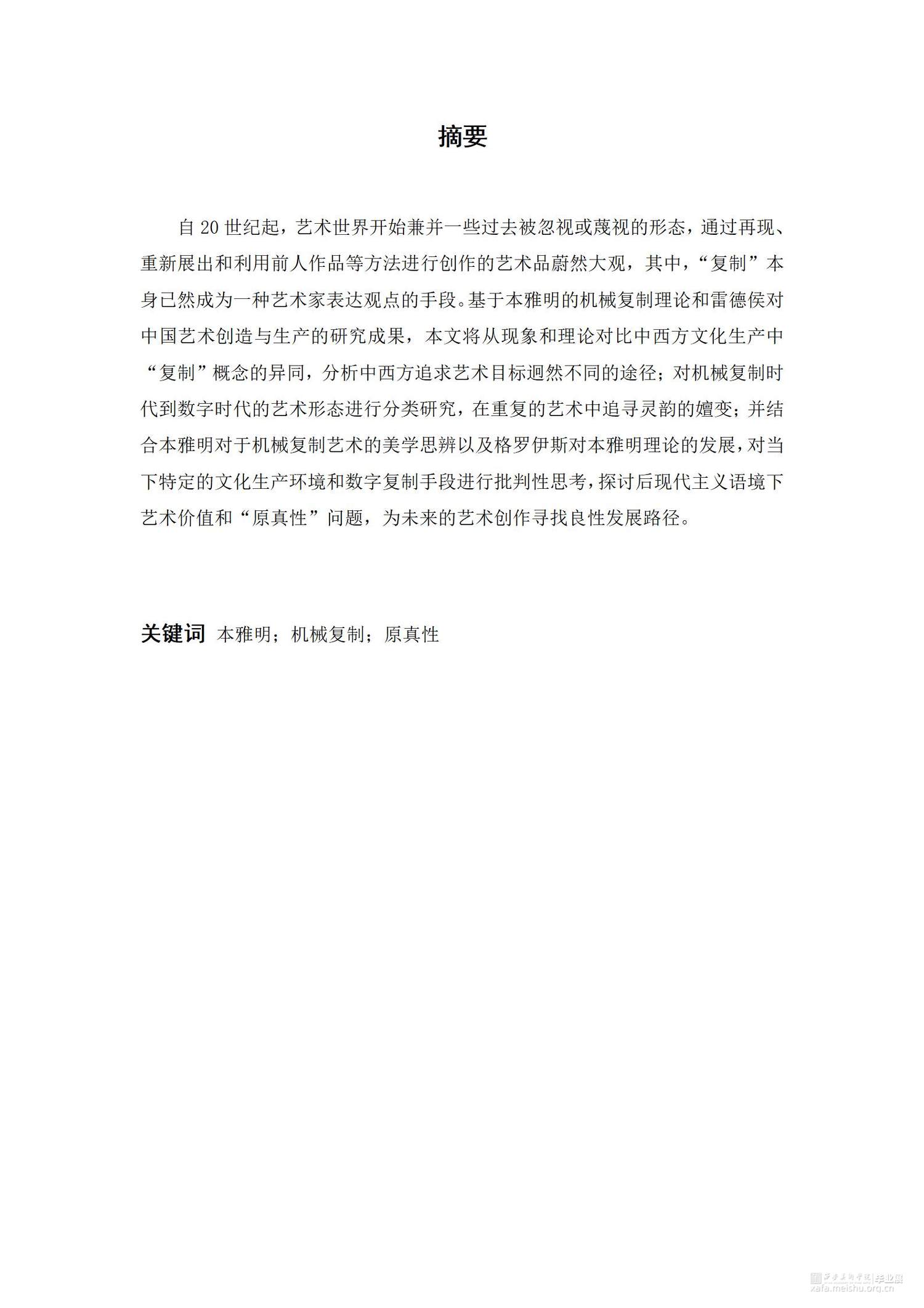第二章对再现、模仿和复制的概念进行厘清,以本雅明的机械复制理论、雷德侯对中国艺术创造与生产的研究成果等为理论基础,对比分析中西方文化生产中“复制”概念的异同,由此界定“艺术复制”的概念;
