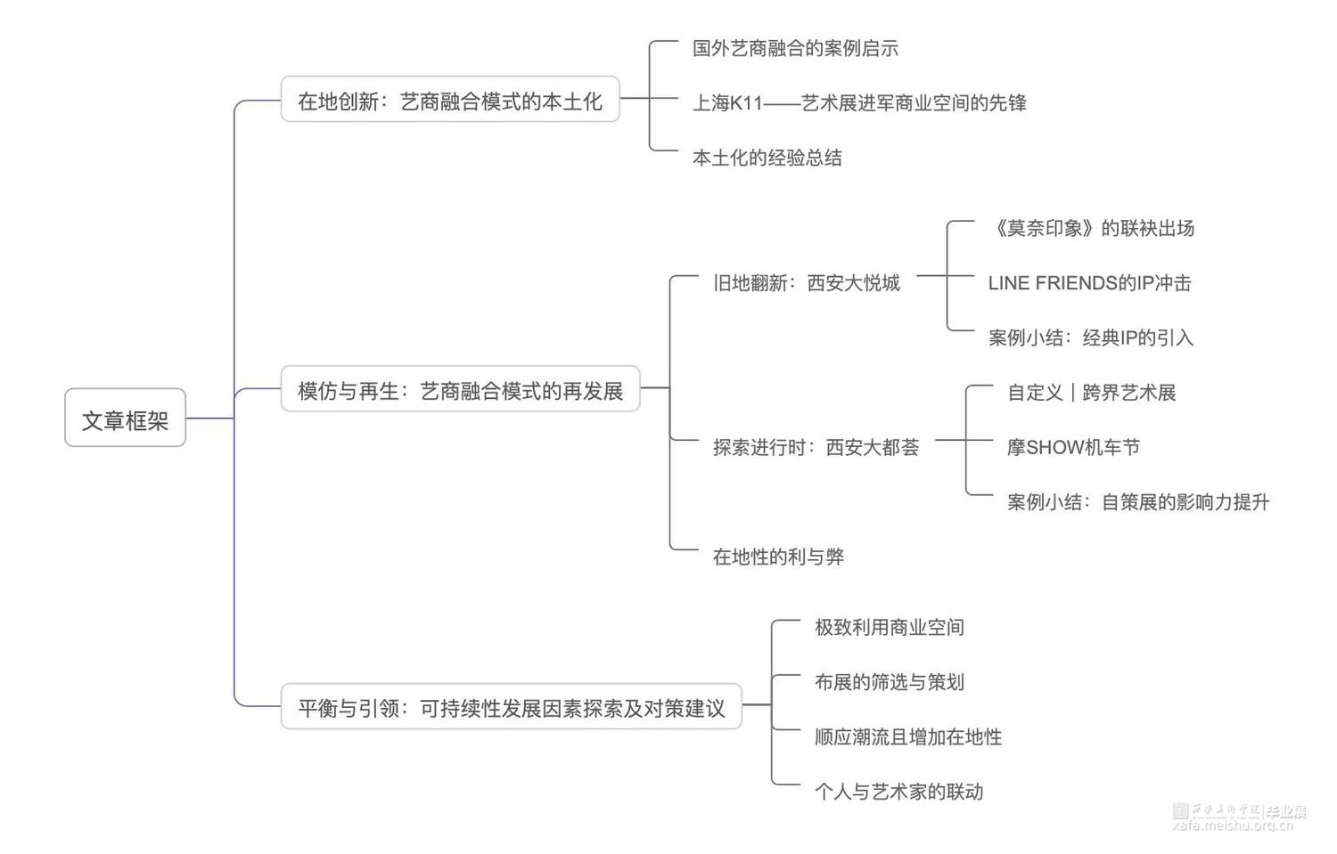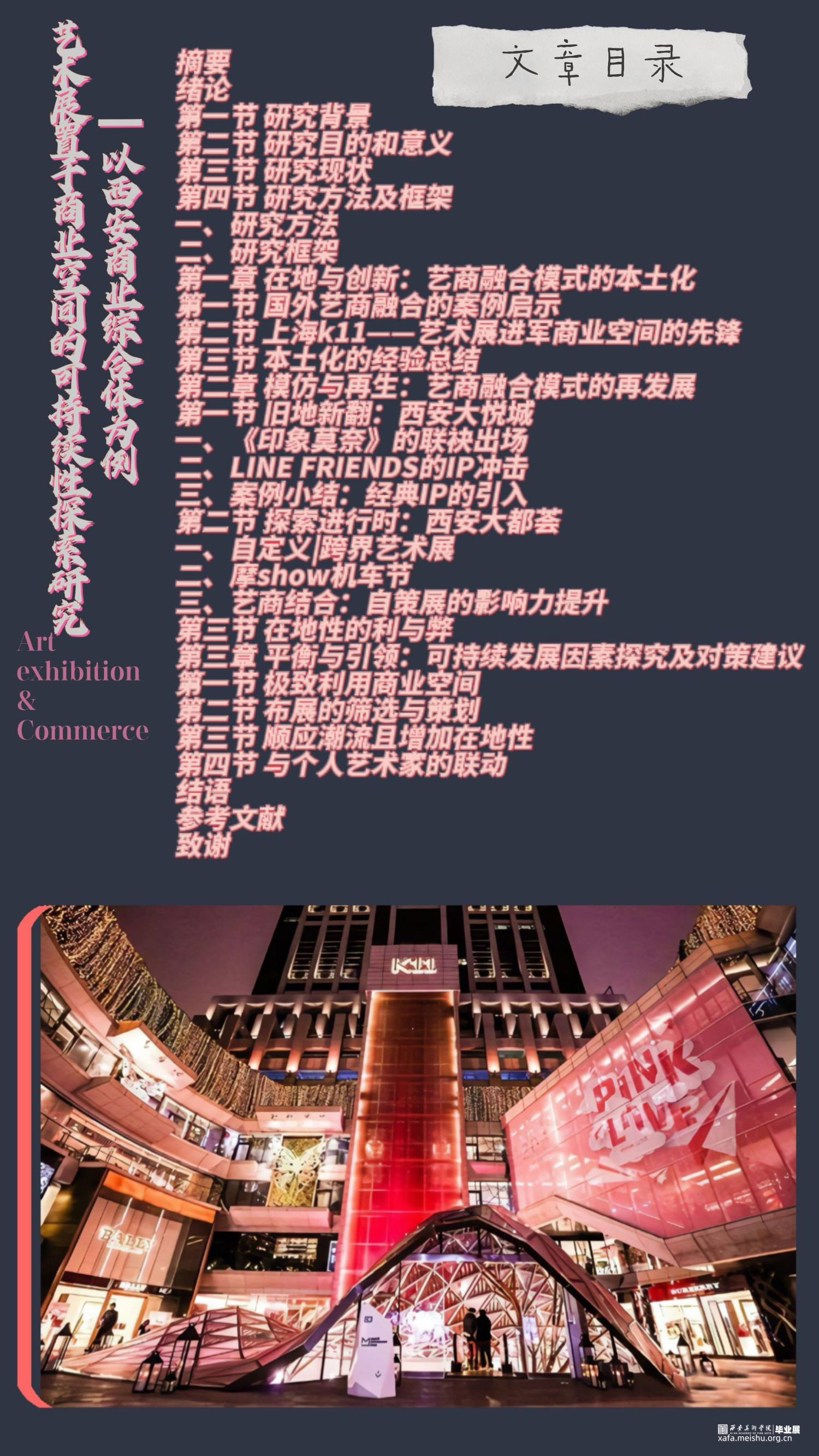 从发展模式来看,艺术与商业的融合开辟了消费文化与艺术展示的一片新天 地。商业空间作为城市人群生活的重要聚集地,理应是忙碌的都市人休闲与放松的 精神栖息地。通过陈列各类绘画,公共艺术,雕塑等方式来将二者达到结合,产生 互动。众所周知,购物和欣赏艺术一定程度上都能帮助人们放松,起着调节负面情 绪的作用。这种相伴相依,相互融合的发展模式关注了彼此的共性,守护了彼此的个 性。