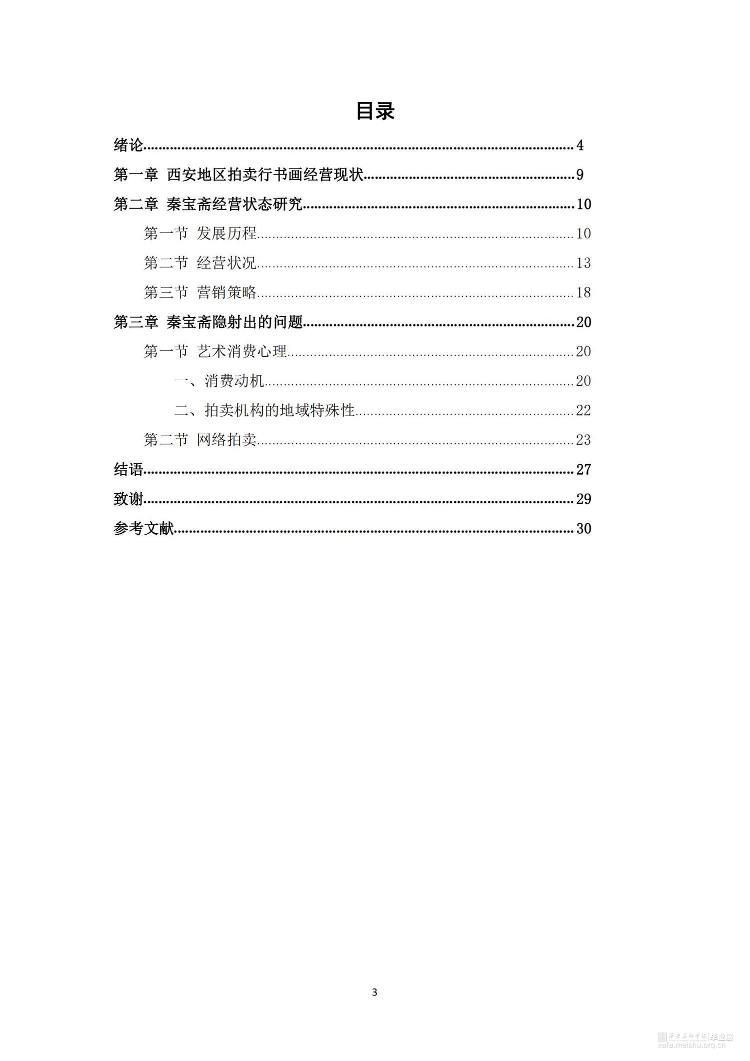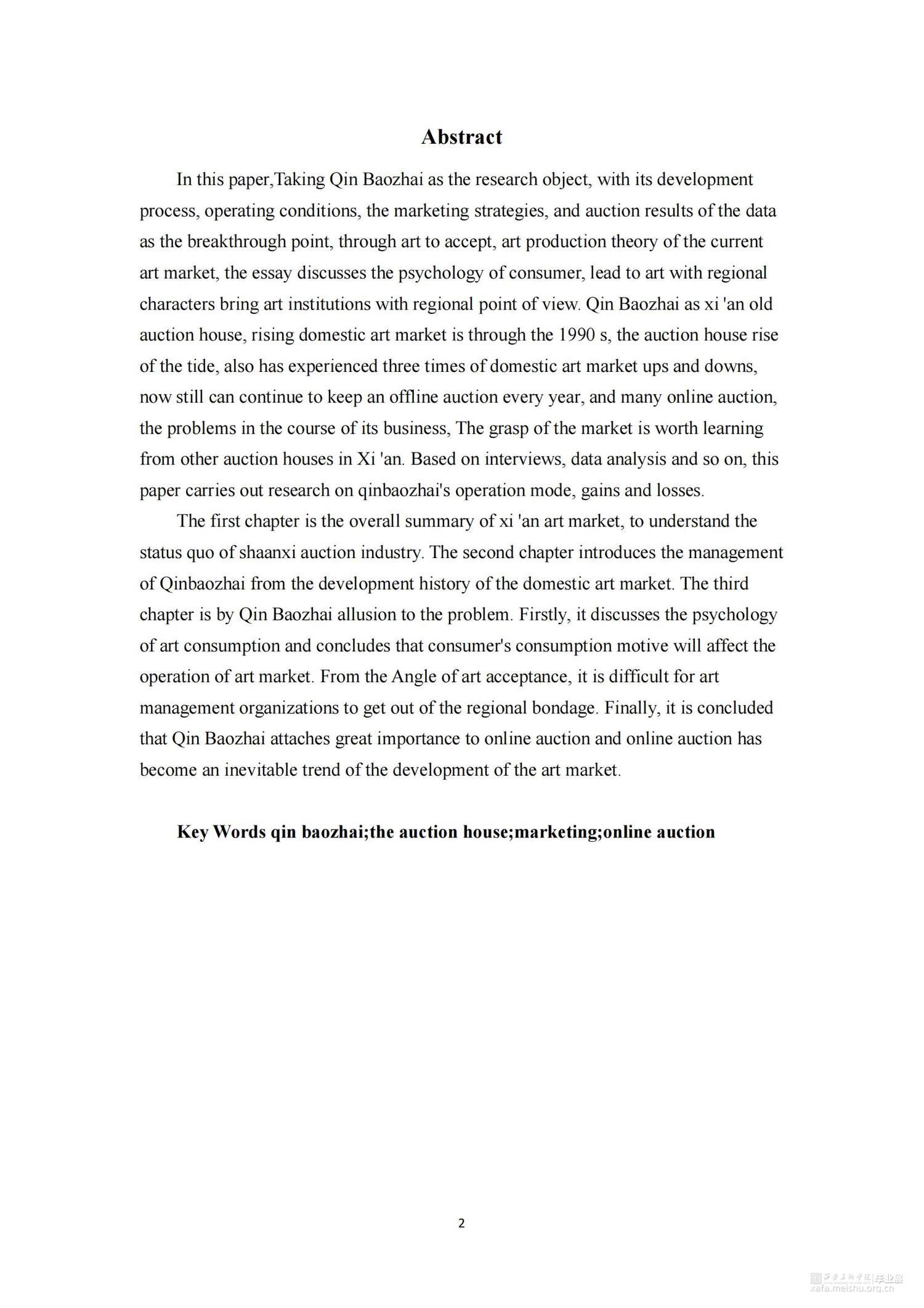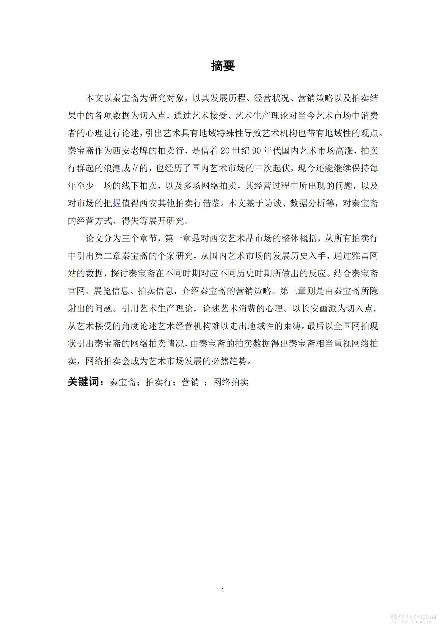 论文分为三个章节,第一章是对西安艺术品市场的整体概括,从所有拍卖行中引出第二章秦宝斋的个案研究,从国内艺术市场的发展历史入手,通过雅昌网站的数据,探讨秦宝斋在不同时期对应不同历史时期所做出的反应。结合秦宝斋官网、展览信息、拍卖信息,介绍秦宝斋的营销策略。第三章则是由秦宝斋所隐射出的问题。引用艺术生产理论,论述艺术消费的心理。以长安画派为切入点,从艺术接受的角度论述艺术经营机构难以走出地域性的束缚。最后以全国网拍现状引出秦宝斋的网络拍卖情况,由秦宝斋的拍卖数据得出秦宝斋相当重视网络拍卖,网络拍卖会成为艺术市场发展的必然趋势。