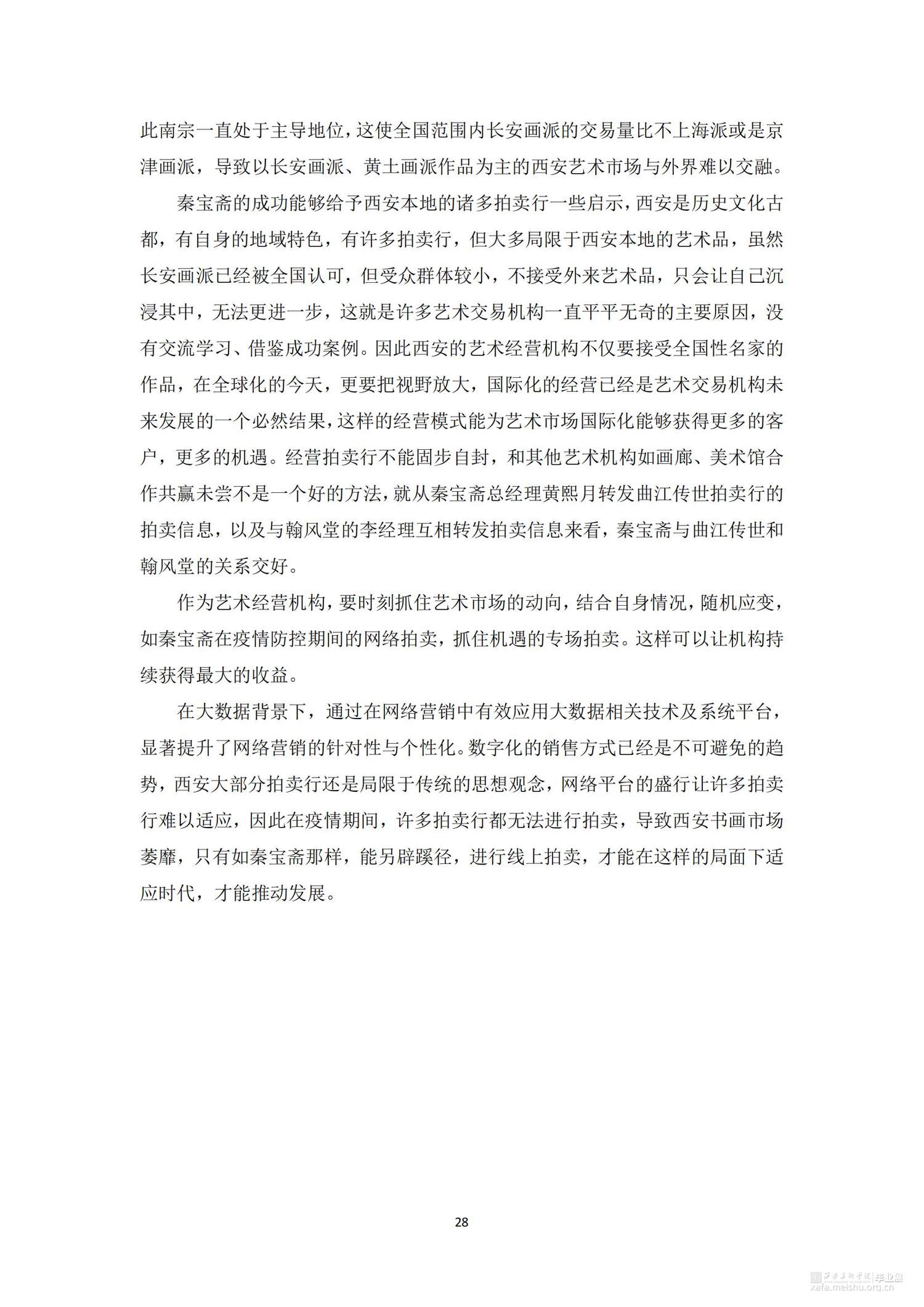 在大数据背景下,通过在网络营销中有效应用大数据相关技术及系统平台,显著提升了网络营销的针对性与个性化。数字化的销售方式已经是不可避免的趋势,西安大部分拍卖行还是局限于传统的思想观念,网络平台的盛行让许多拍卖行难以适应,因此在疫情期间,许多拍卖行都无法进行拍卖,导致西安书画市场萎靡,只有如秦宝斋那样,能另辟蹊径,进行线上拍卖,才能在这样的局面下适应时代,才能推动发展。