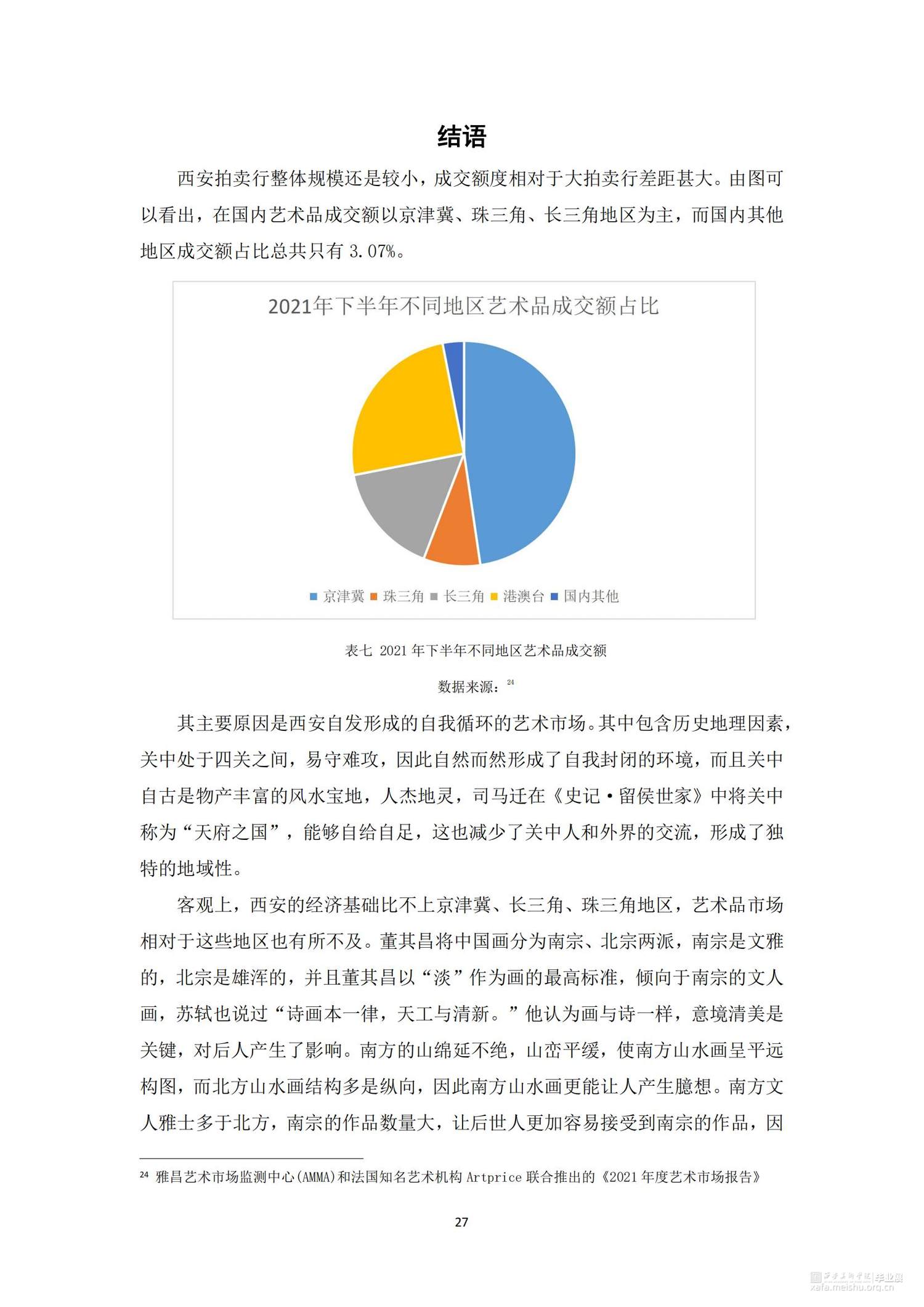 西安拍卖行整体规模还是较小,成交额度相对于大拍卖行差距甚大。由图可以看出,在国内艺术品成交额以京津冀、珠三角、长三角地区为主,而国内其他地区成交额占比总共只有3.07%。其主要原因是西安自发形成的自我循环的艺术市场。其中包含历史地理因素,关中处于四关之间,易守难攻,因此自然而然形成了自我封闭的环境,而且关中自古是物产丰富的风水宝地,人杰地灵,司马迁在《史记·留侯世家》中将关中称为“天府之国”,能够自给自足,这也减少了关中人和外界的交流,形成了独特的地域性。客观上,西安的经济基础比不上京津冀、长三角、珠三角地区,艺术品市场相对于这些地区也有所不及。董其昌将中国画分为南宗、北宗两派,南宗是文雅的,北宗是雄浑的,并且董其昌以“淡”作为画的最高标准,倾向于南宗的文人画,苏轼也说过“诗画本一律,天工与清新。”他认为画与诗一样,意境清美是关键,对后人产生了影响。南方的山绵延不绝,山峦平缓,使南方山水画呈平远构图,而北方山水画结构多是纵向,因此南方山水画更能让人产生臆想。南方文人雅士多于北方,南宗的作品数量大,让后世人更加容易接受到南宗的作品,因此南宗一直处于主导地位,这使全国范围内长安画派的交易量比不上海派或是京津画派,导致以长安画派、黄土画派作品为主的西安艺术市场与外界难以交融。