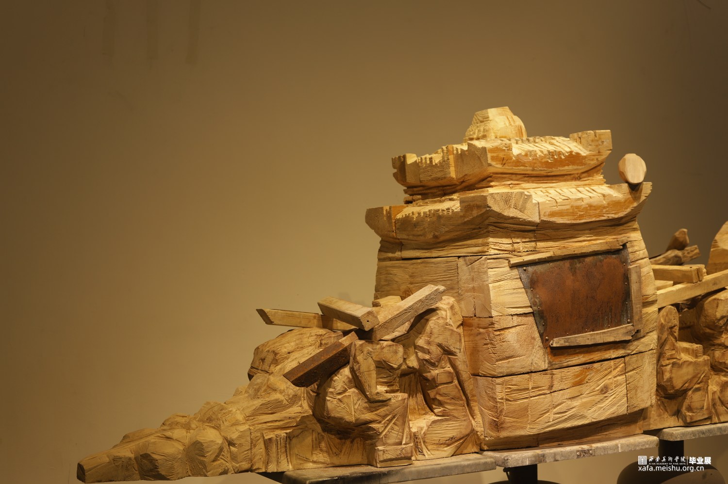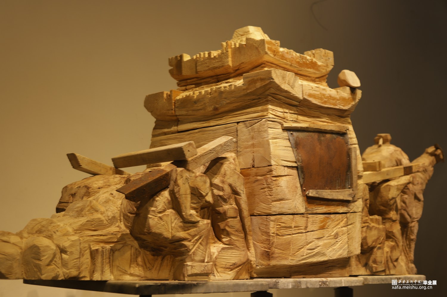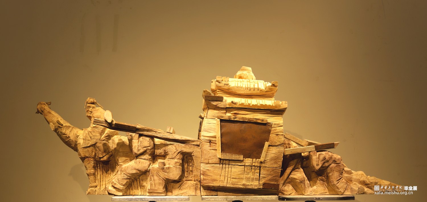 作品是木雕,采用圆雕,浮雕相结合方式进行人物创作,展现的是一个接亲抬喜轿的欢乐场景,巨大的轿子,畸形的马,被轿子压垮的人,促成了这个诙谐的场景,到底轿子装的是新郎心爱的新娘,还是婚后沉重的生活,谁也不知道,但至少当下,是开心的。