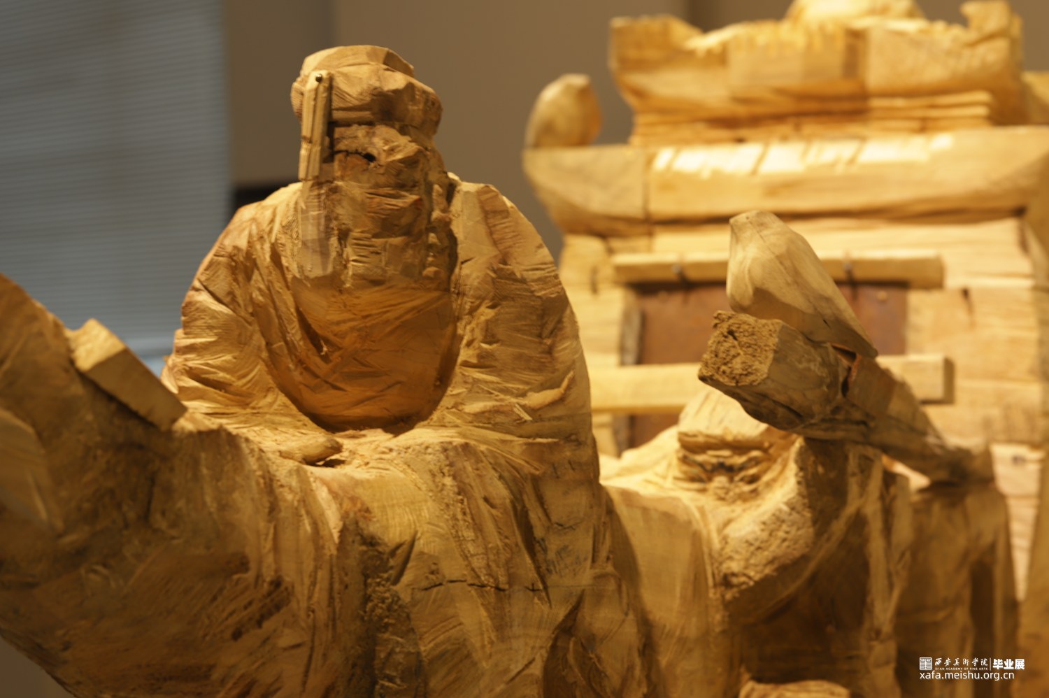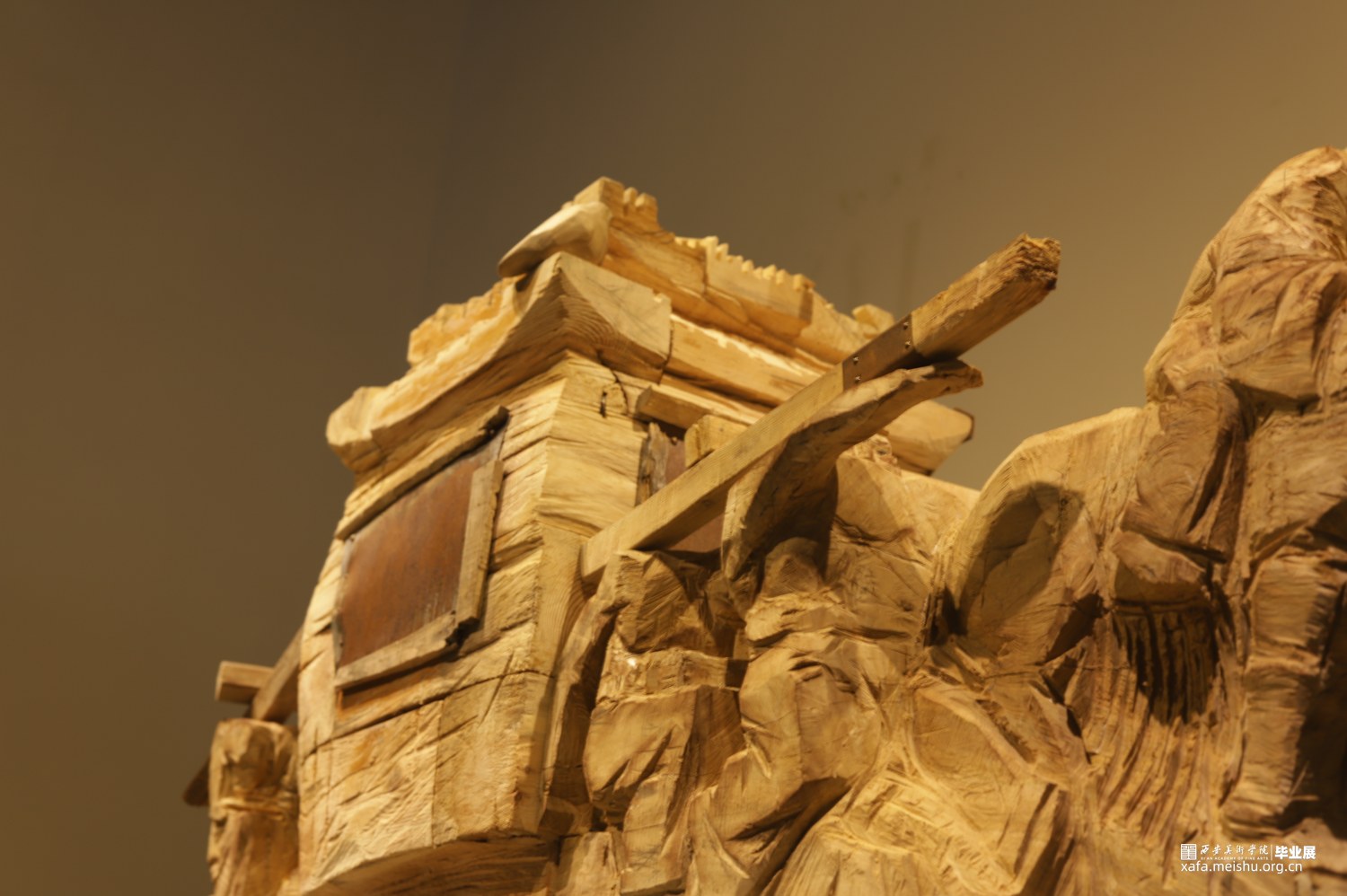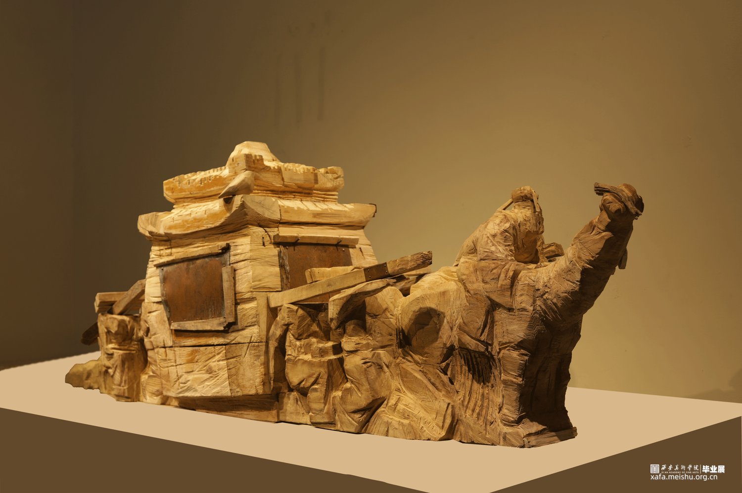作品是木雕,采用圆雕,浮雕相结合方式进行人物创作,展现的是一个接亲抬喜轿的欢乐场景,巨大的轿子,畸形的马,被轿子压垮的人,促成了这个诙谐的场景,到底轿子装的是新郎心爱的新娘,还是婚后沉重的生活,谁也不知道,但至少当下,是开心的。