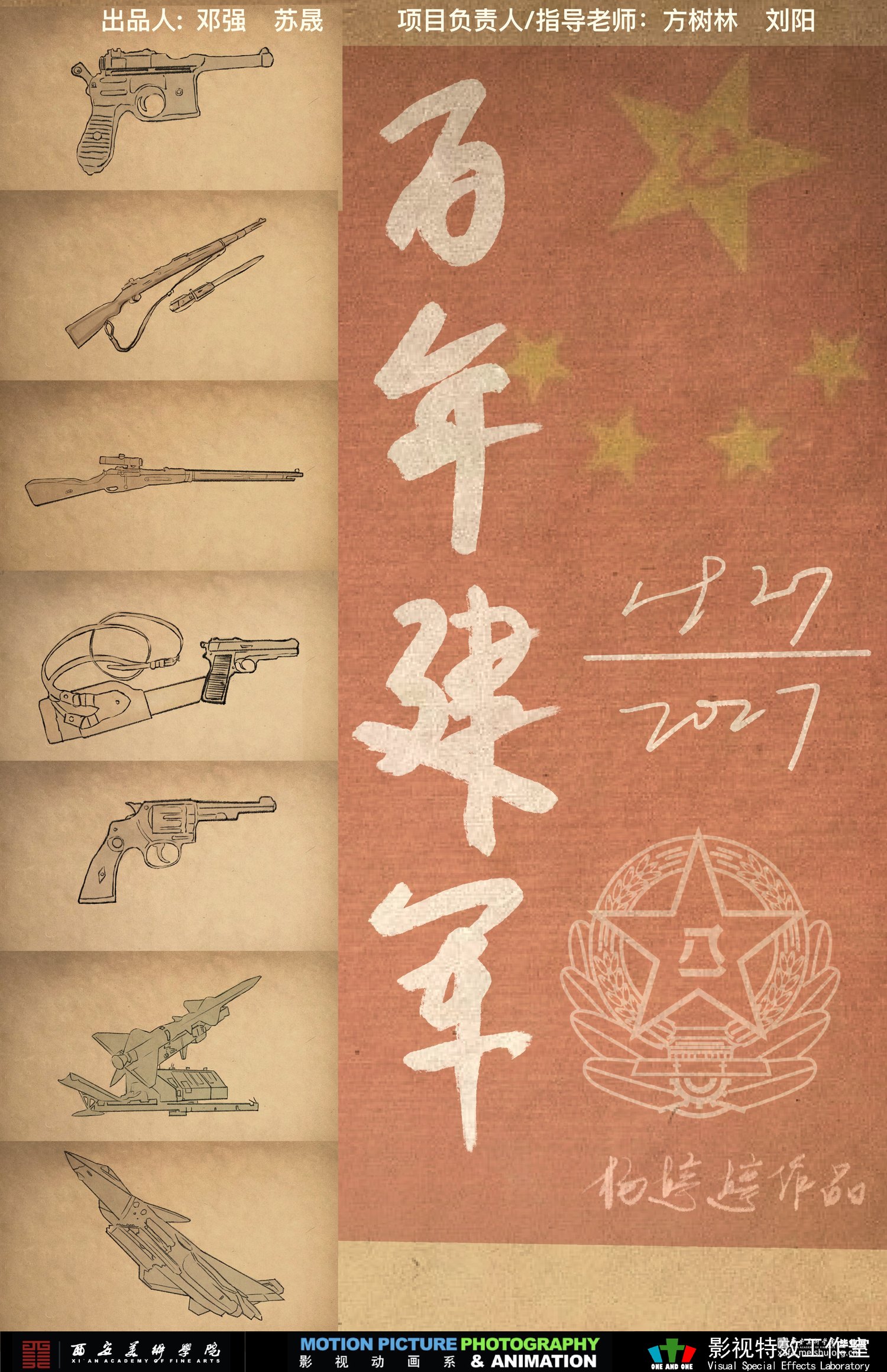 本作是基于色彩理论和美术功底的动态二维短片研究,以毕设作品《百年建军》为例,将二维动画短片作为⼀个载体和表达方式,来研究表达主题为中国共产党建军百年经历的历史性重要节点的场景绘制动态展示。本作品梳理了百年建军的历程,回顾了目前军事题材动画的发展与演变,从结构安排、美学设计、内容表达这三维度展示了对《百年建军》作品的构思与呈现。作品的表现形式为中国画风格的白描淡彩画面,选取中国共产党建军的重要节点,主要内容展现了南昌起义、九一八事变、日本投降、新中国成立、抗美援朝、第一颗原子弹、第一艘航母“辽宁舰”、武汉新冠肺炎疫情救治、航空空间站和二十大中中国解放军的故事,将红色记忆融入美术二维设计,通过对经典历史场面的再现和升华,展示出中国共产党百年建军的峥嵘岁月和光荣历程,表达了新时代青年对红色精神的追随与传承,弘扬时代精神,发扬榜样力量。