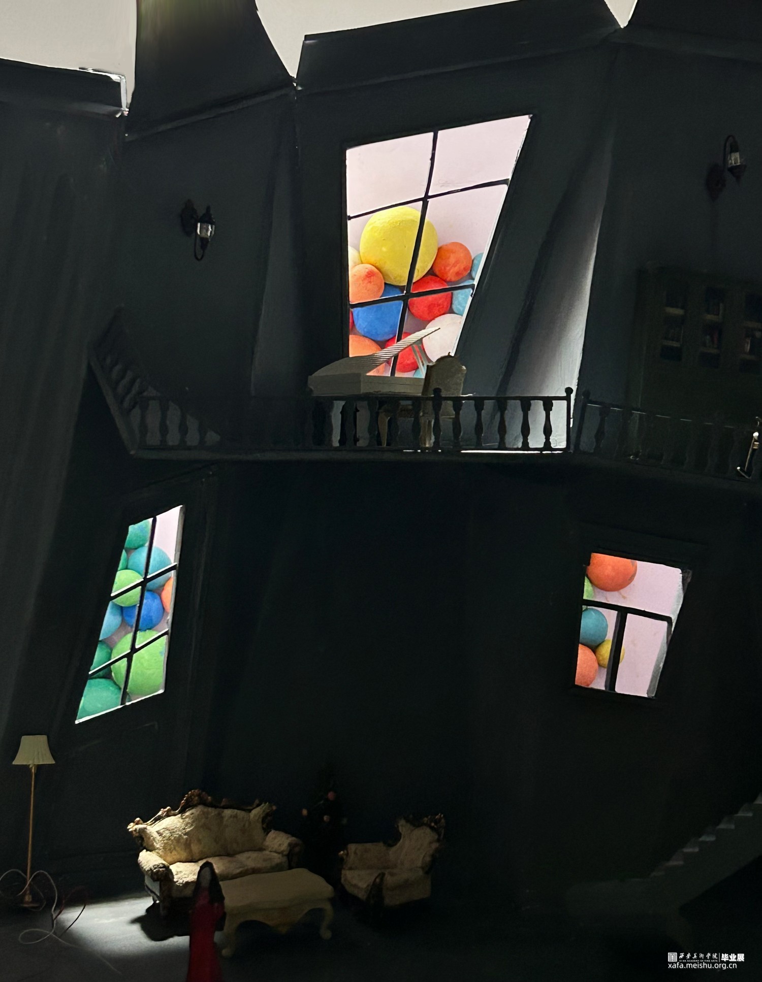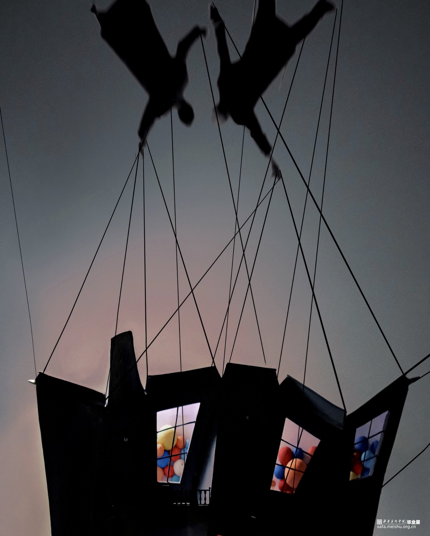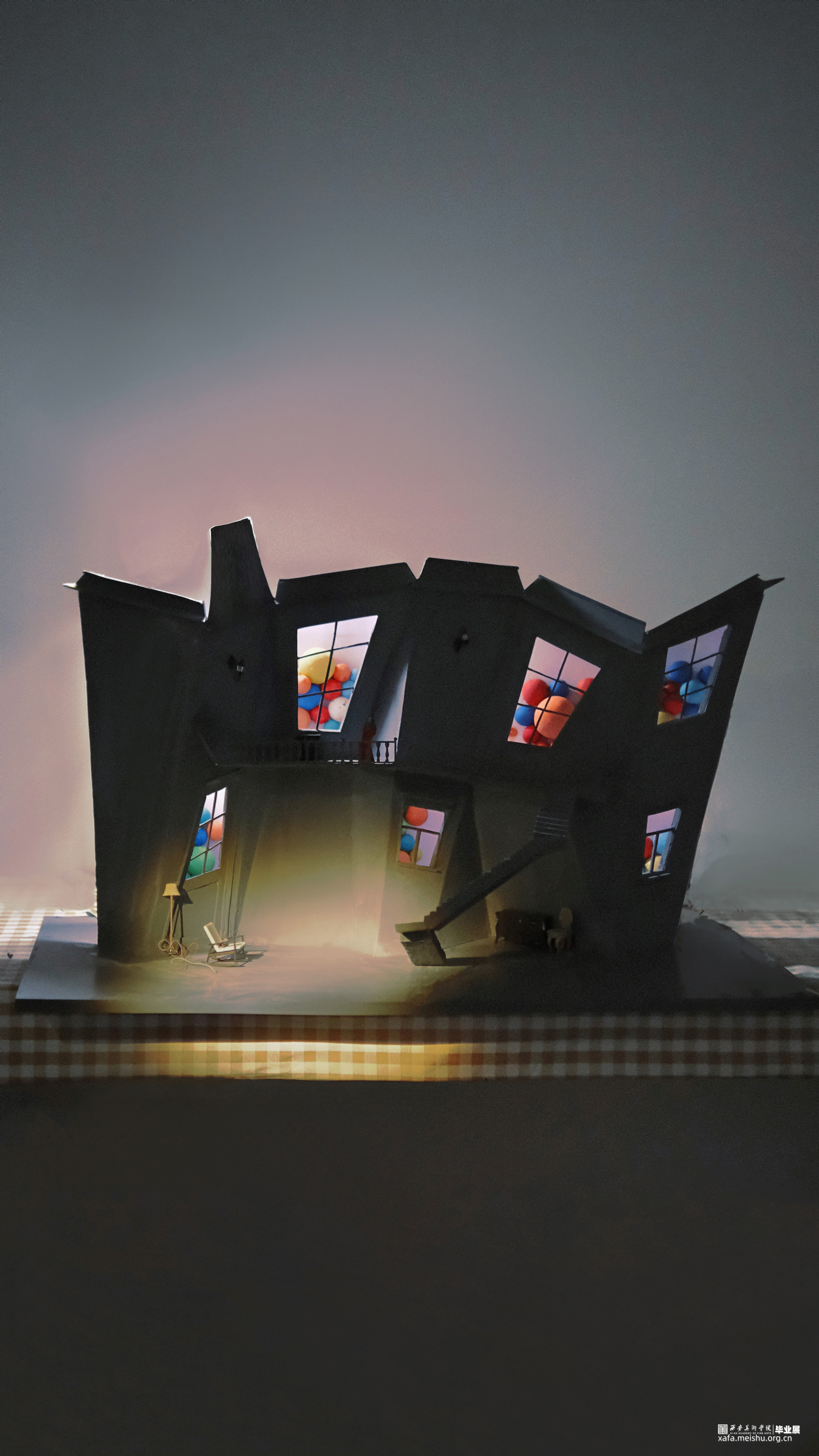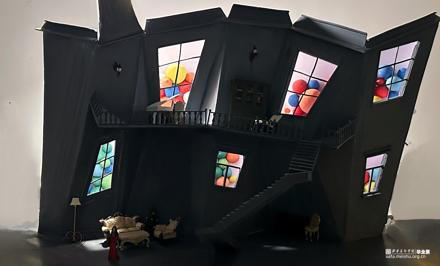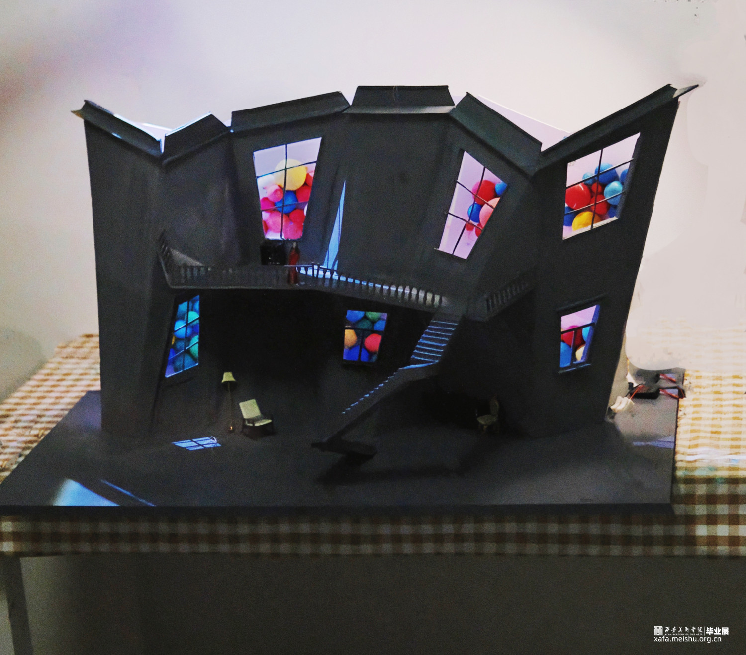 该作品的舞台设计打破传统的客厅形式,灵感来源于双人游戏翻花绳,意味着时代背景下的主人公好似活在别人掌心的玩物。通过线的走势带动面,使得空间扭曲,表现扭曲的观念和生活。窗户和窗户的投影暗示牢笼,同时用三原色表示秩序和平衡,绿色表示对自由的向往。