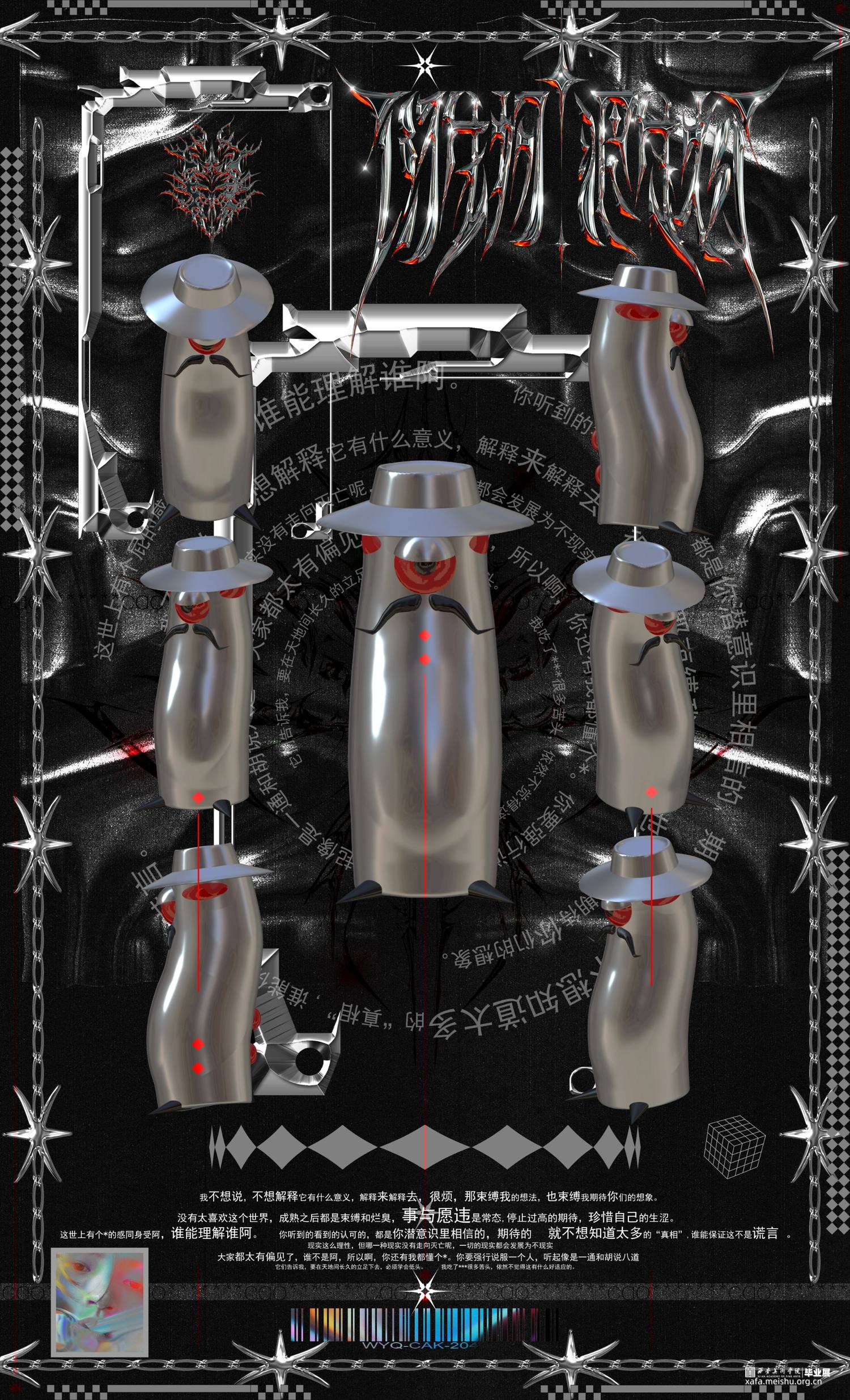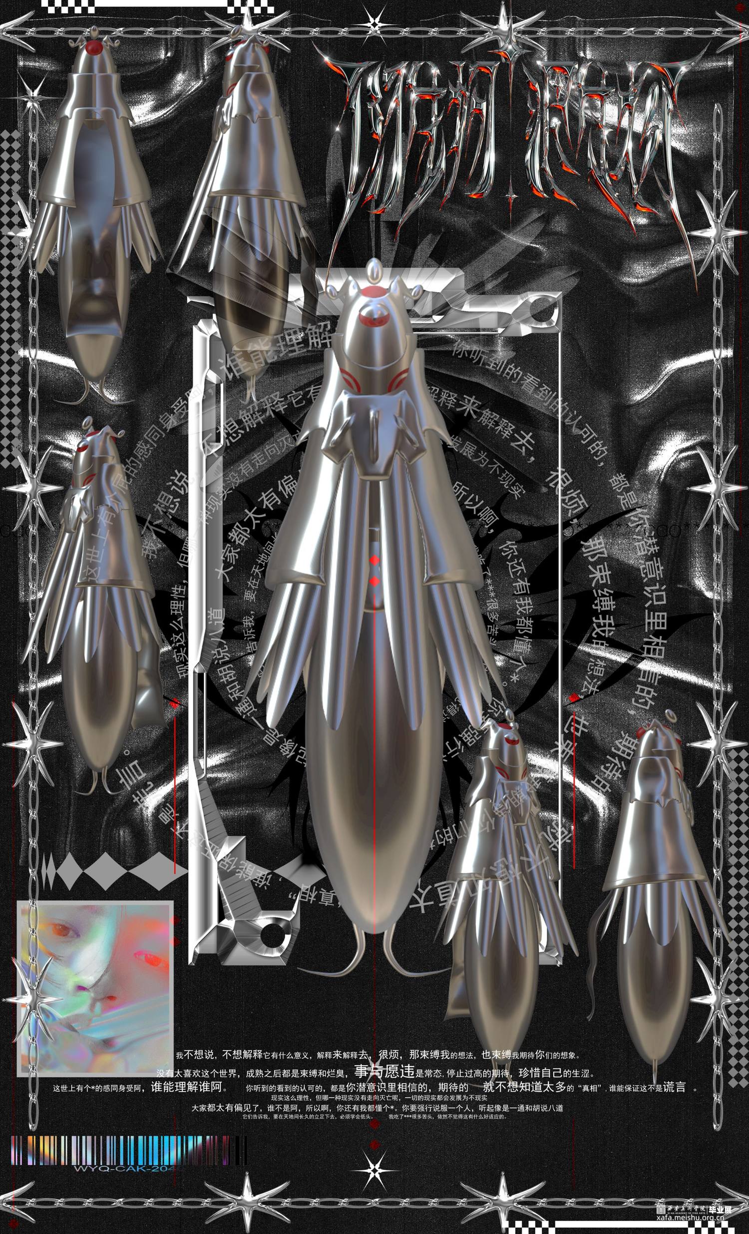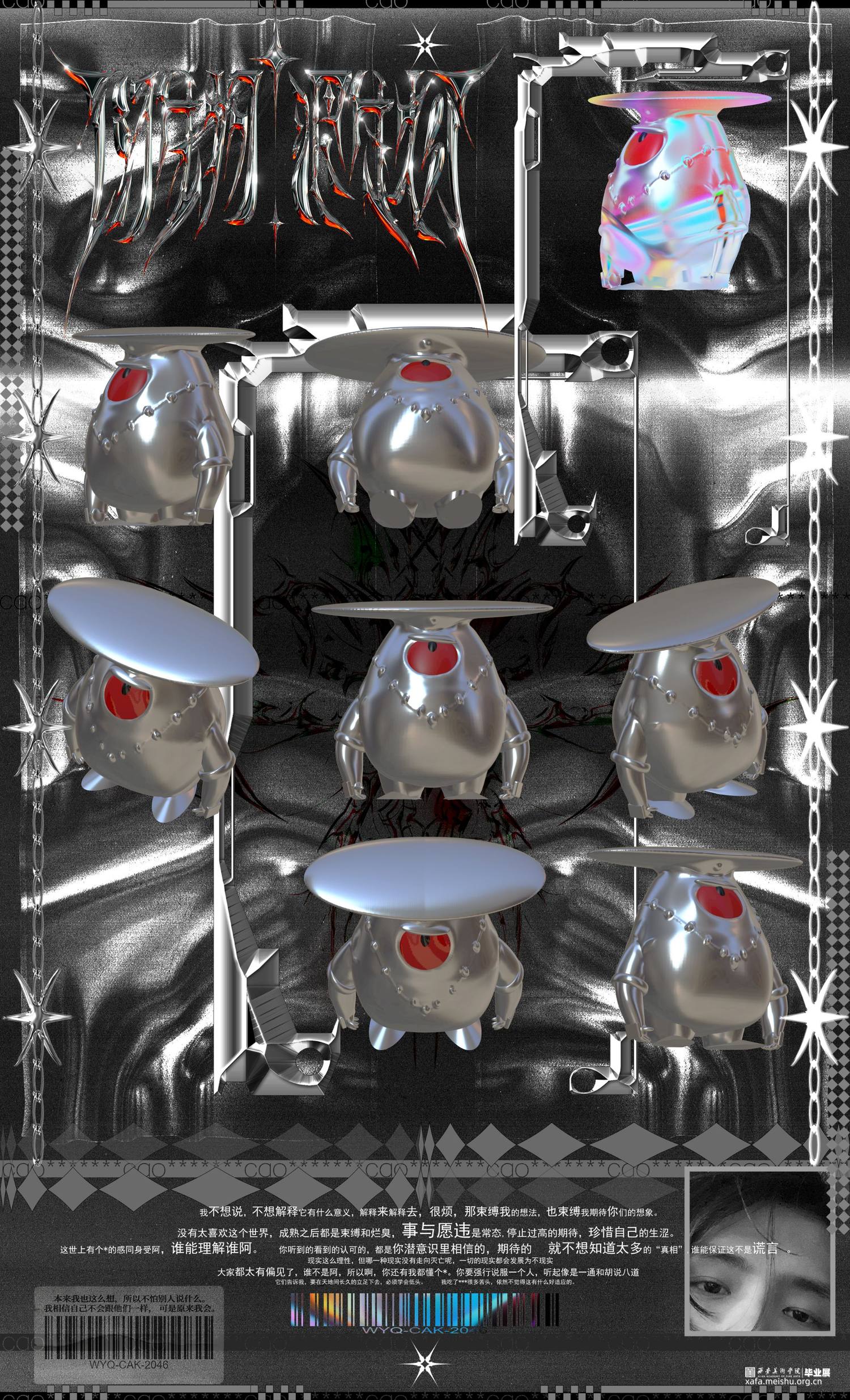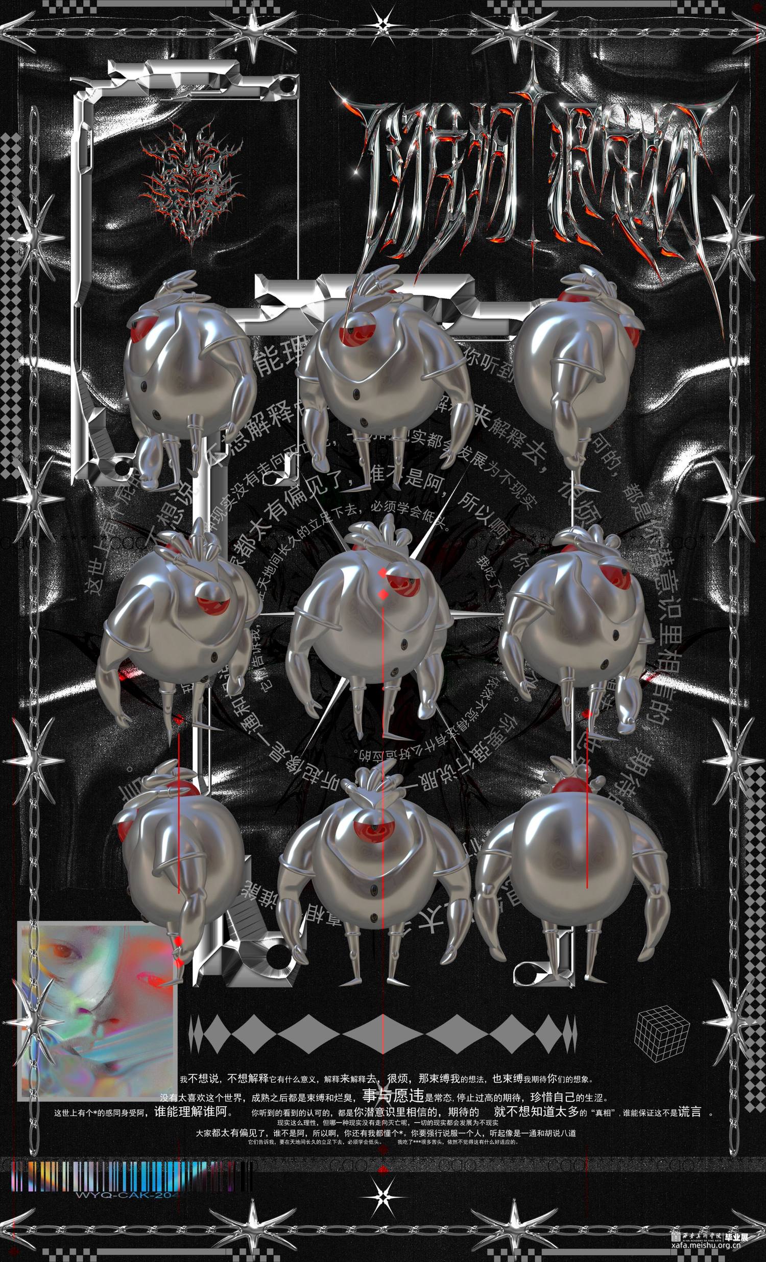 作品以一种“伪海报”的形式呈现,追求混乱化,非常规的布局表达,运用了很多的酸性设计的概念和元素。