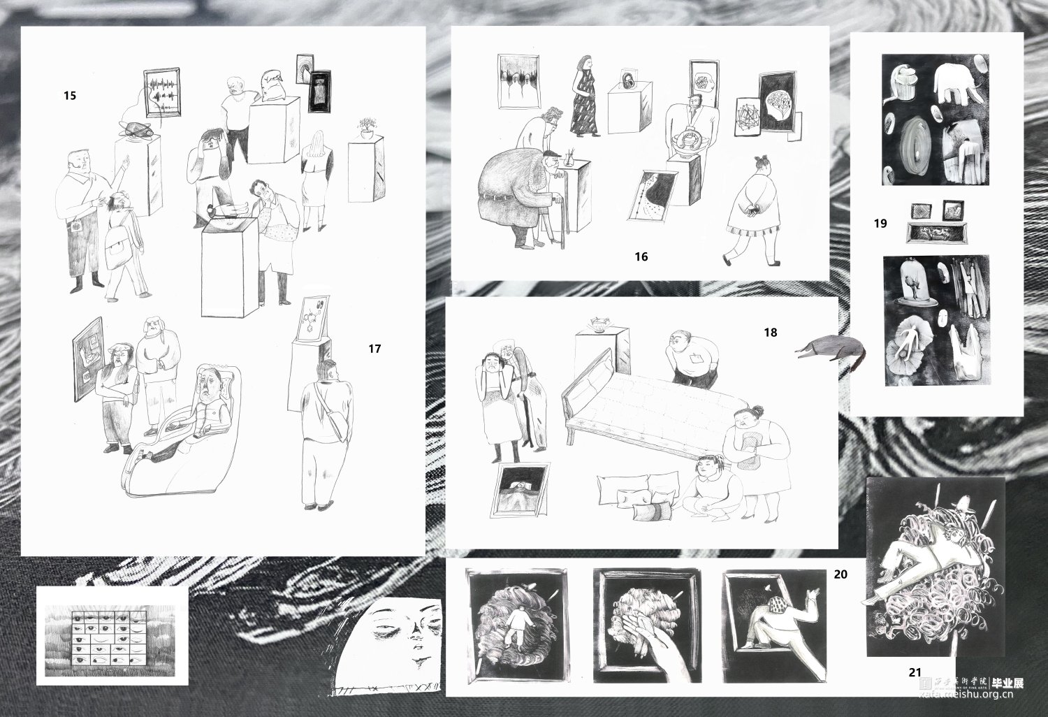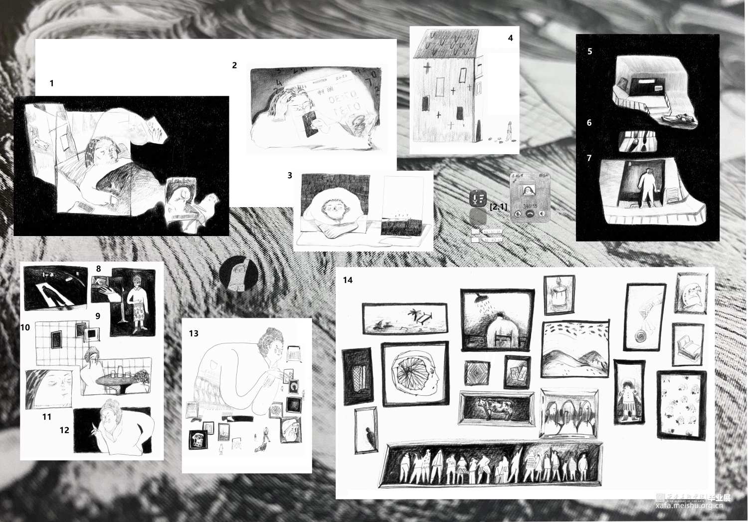 脑电波θ波是人睡觉时常出现的电波,当人困倦时可见,一般表示中枢神经系统进入抑制状态。2013年到2023年是睡眠市场觉醒的十年,随着时代发展,国民的睡眠困扰成为一种普遍现象,无论是青少年还是中年及老年群体,或多或少存在着睡眠障碍的情况。这块市场在这十年里如泉涌般填满了市场版图,因此睡眠经济迅速崛起。在日益增长物质需求和精神追求满足的同时我们见证了睡眠市场十年的发展,睡眠不可避免地成为人们观念日益重视的一部分。我在插入想象和现实片段中反思和审视睡眠问题的出现,以看展的形式展示了“展中展”,描绘了睡眠产品和睡