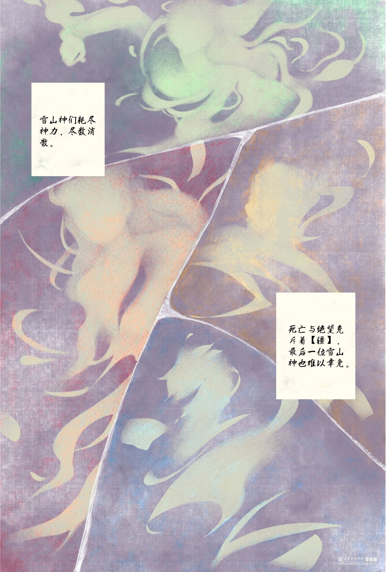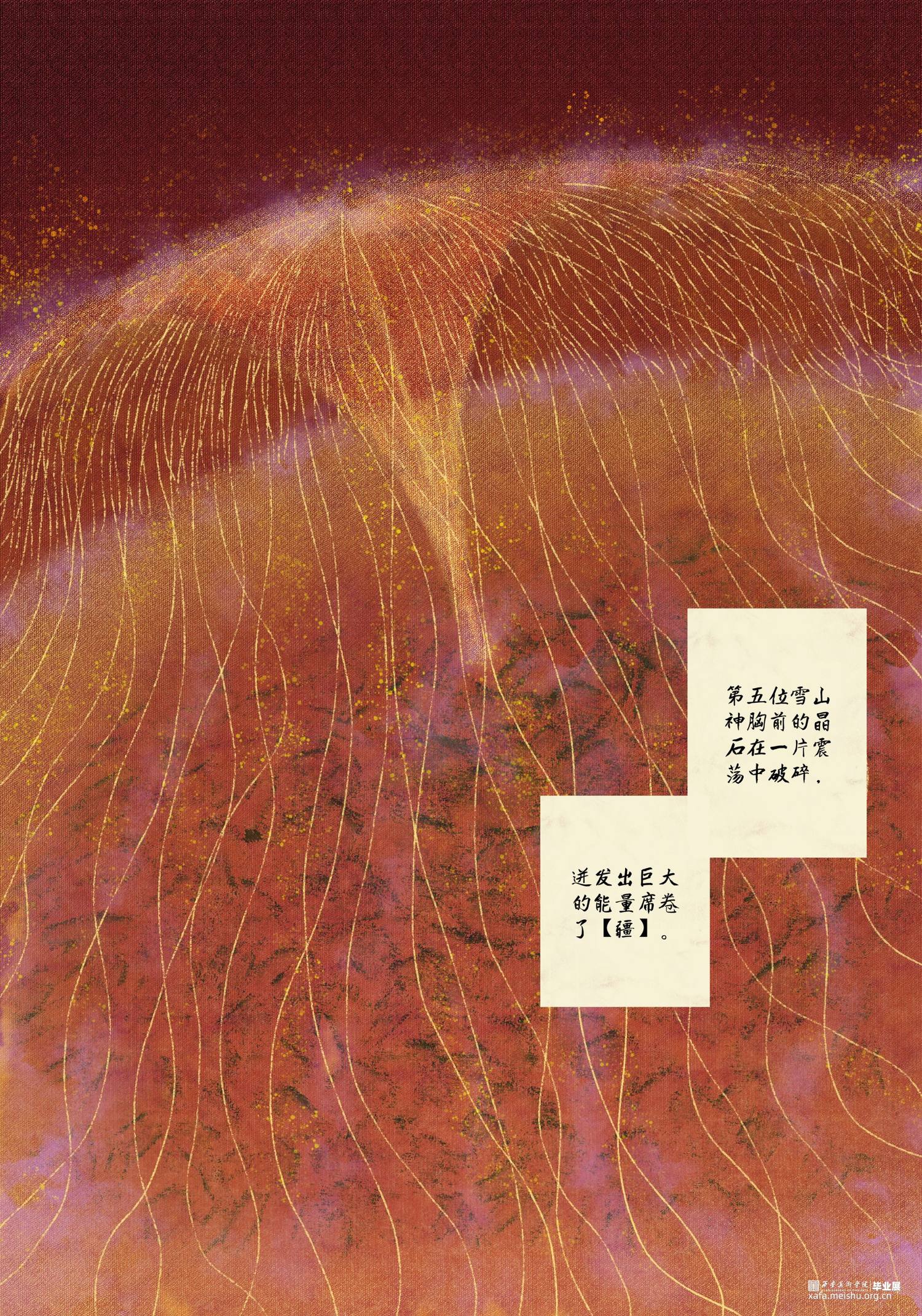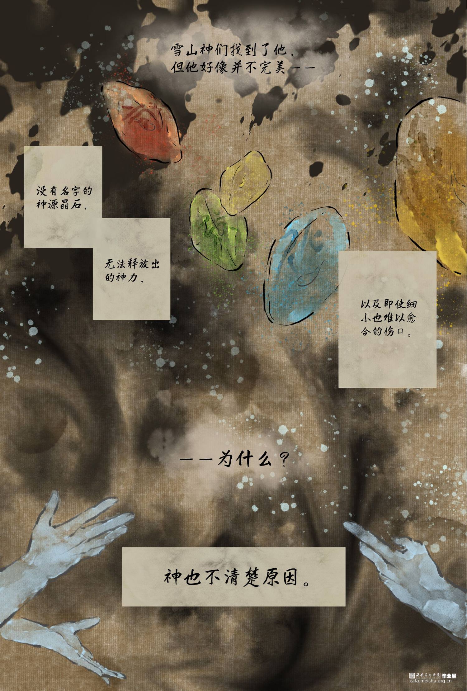 寓意:五行元素中的“土”是万物生长的基础,第五位雪山神代表着“土”这一元素。他的神力一直无法释放出来,直到灾难降临、众神消散之时,他的神源晶石在破碎后释放出了恢复整个【疆】的神力。置之死地而后生,一切重新开始,他也成为了新的【疆】的第一位雪山神。我们每个人也都有着潜藏的“神力”,积攒、吸收,会在某一刻发挥出它的价值与意义。