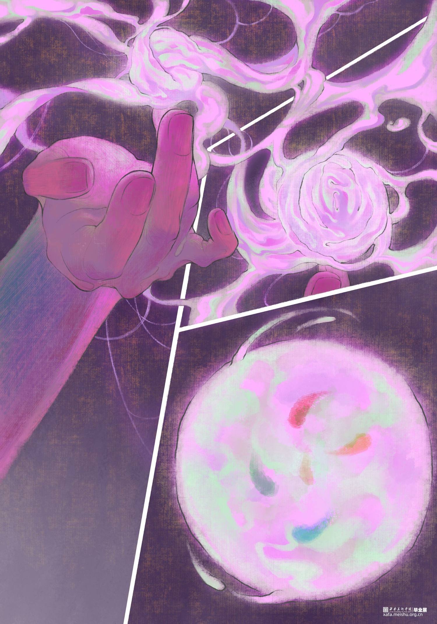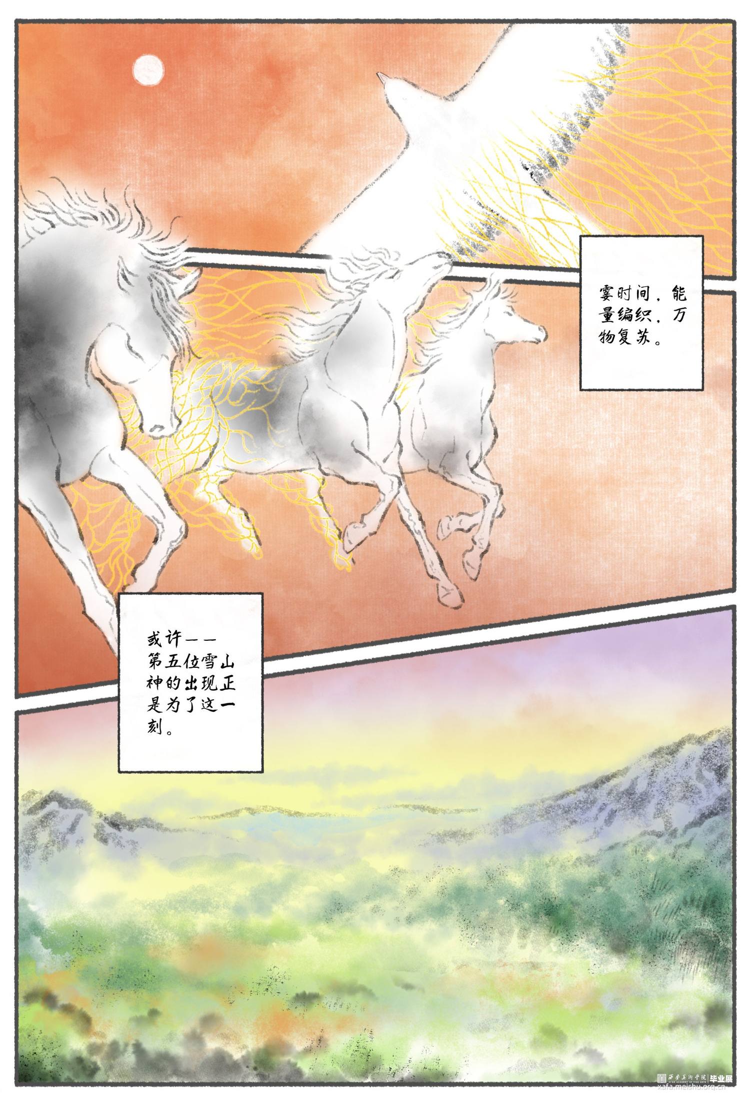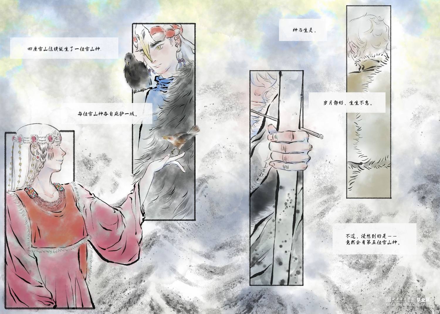 寓意:五行元素中的“土”是万物生长的基础,第五位雪山神代表着“土”这一元素。他的神力一直无法释放出来,直到灾难降临、众神消散之时,他的神源晶石在破碎后释放出了恢复整个【疆】的神力。置之死地而后生,一切重新开始,他也成为了新的【疆】的第一位雪山神。我们每个人也都有着潜藏的“神力”,积攒、吸收,会在某一刻发挥出它的价值与意义。