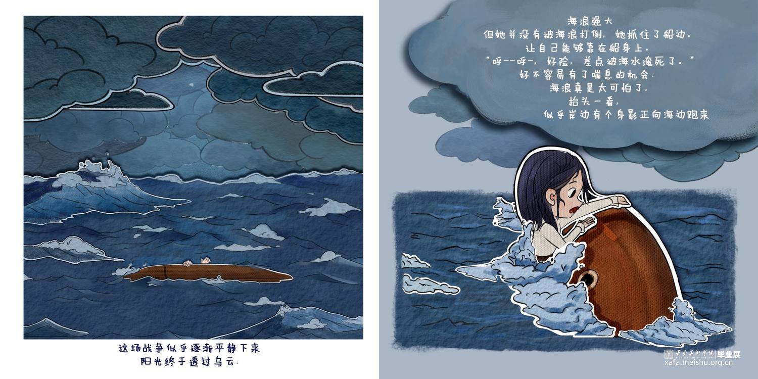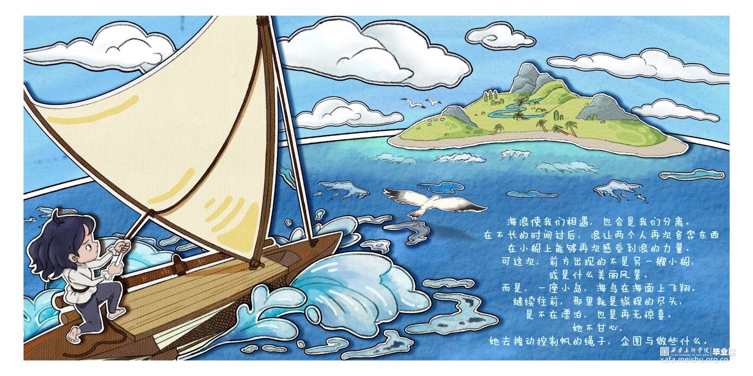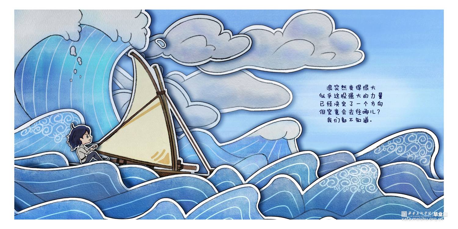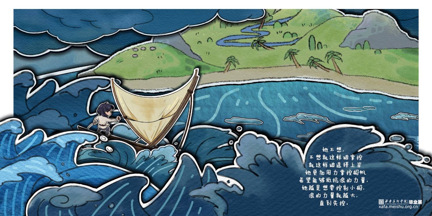 创作这样一个故事其实是源于我的生活,在我的生活中,我是一个比较没有主见的人,除了学美术以外,很多事情是被人推着走的,在故事中,浪象征着身边的长辈,他们对我很好,在我迷茫的时候给我方向,帮助我认识更多的事物。但当我的未来正在迷茫,却又不想马上安定下来时。他们会说教我,指责我,让我感觉身边的环境像海浪一样异常汹涌。