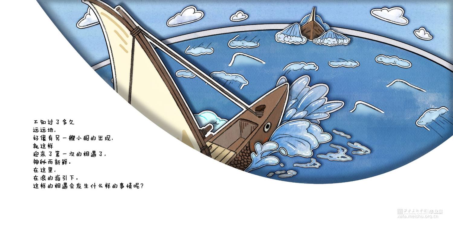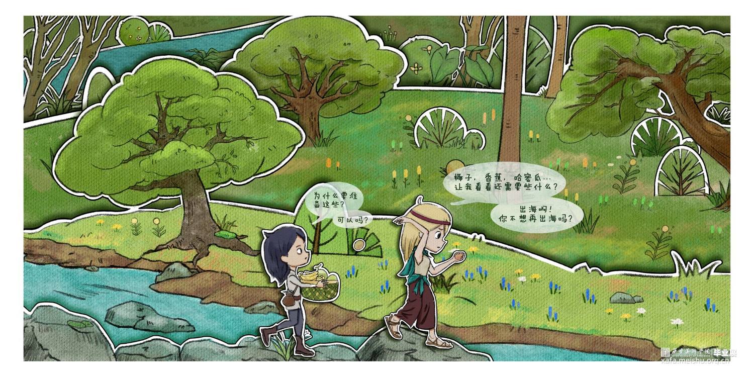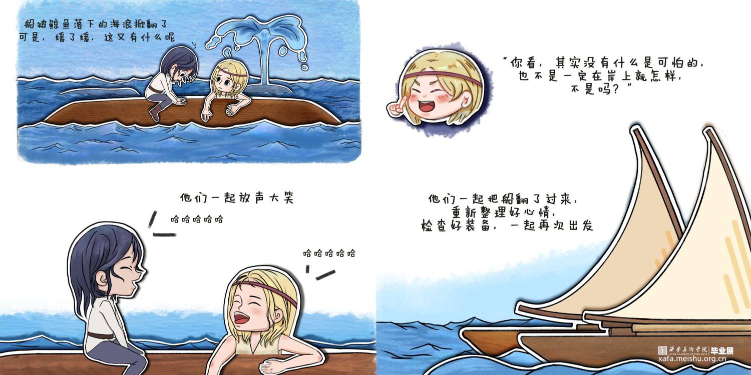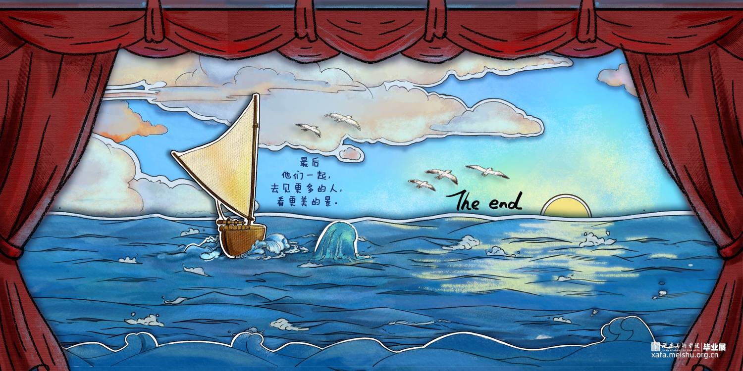 创作这样一个故事其实是源于我的生活,在我的生活中,我是一个比较没有主见的人,除了学美术以外,很多事情是被人推着走的,在故事中,浪象征着身边的长辈,他们对我很好,在我迷茫的时候给我方向,帮助我认识更多的事物。但当我的未来正在迷茫,却又不想马上安定下来时。他们会说教我,指责我,让我感觉身边的环境像海浪一样异常汹涌。
