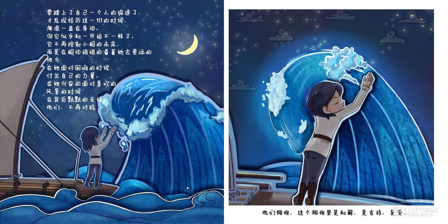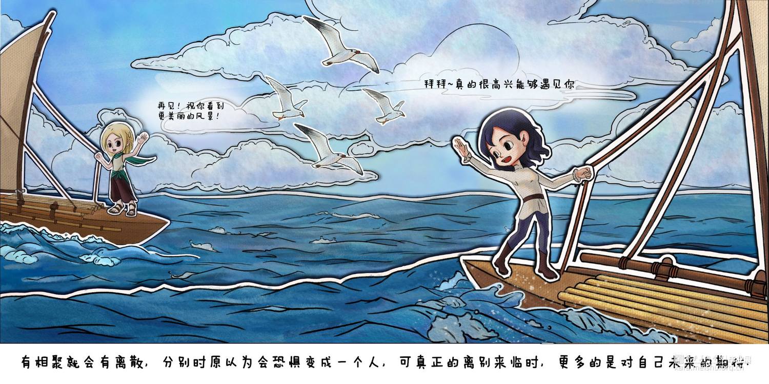 我希望作品中的主角,可以再这样的环境下,鼓起勇气,可以是在他人的帮助下,去闯,去享受世界。但在创作的时候我发现,长辈家人作为浪,其实会一直站在自己的身边,当主角将要自己独立面临挑战的时候,她意识到,曾经的说教、现在的默默支持,都是他们的爱。所以,当自己找到了方向后,浪陪伴着自己去探索更多更广阔的世界。