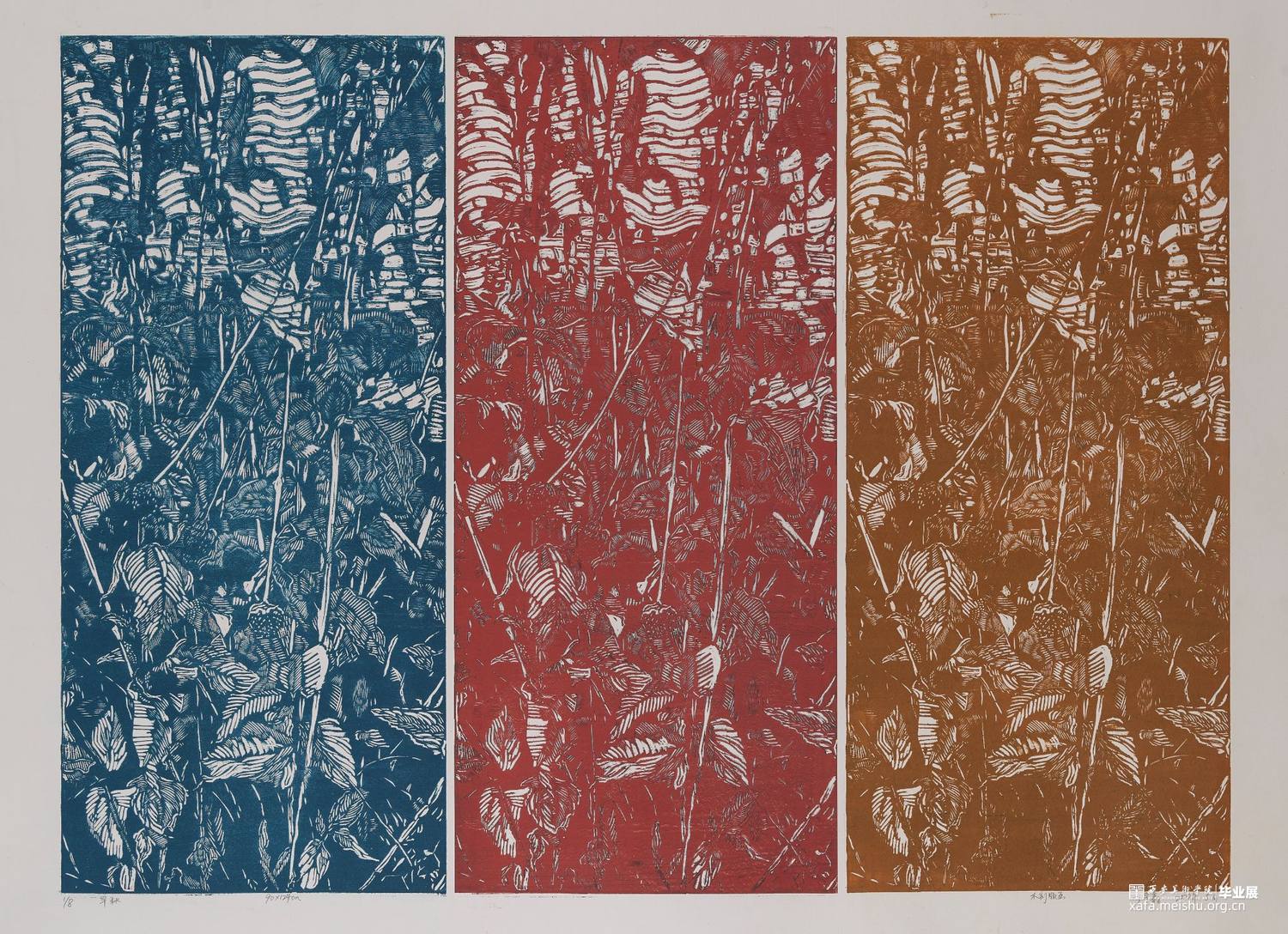 初秋扫走了炽夏的热情却忘了带走炎热,败叶与枯枝无一不散发着落寞与无奈。秋天是庄家的丰收与狂欢,却是花朵与新叶的噩耗。版画的线条刻画恰好可以表现出初秋时节的植被景象,线条之间疏密转换将画面中枝叶的参差交错表现得张弛有力,用丰富的刀法与线条排列将秋天来临时的一处景象记录在画面之中,再调和不同色系的油墨突出画面意境与观看感受。