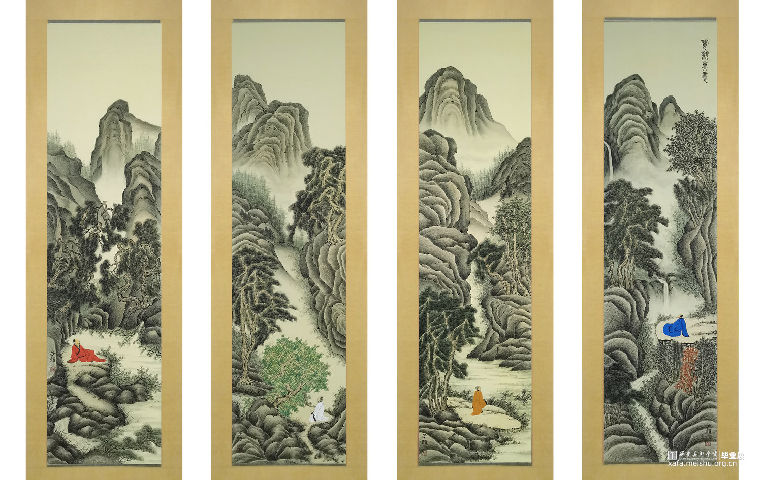 作品《览观其意》,“览观”取览胜、观赏之意,画面描绘了苍茫浑厚、秀丽幽深的山水美景,山势层峦秀拔、虚实相生。四位高士览观山水,意境含蓄悠远、气韵盎然。“览观其意”体现隐逸生活中“天人合一”的精神追求。