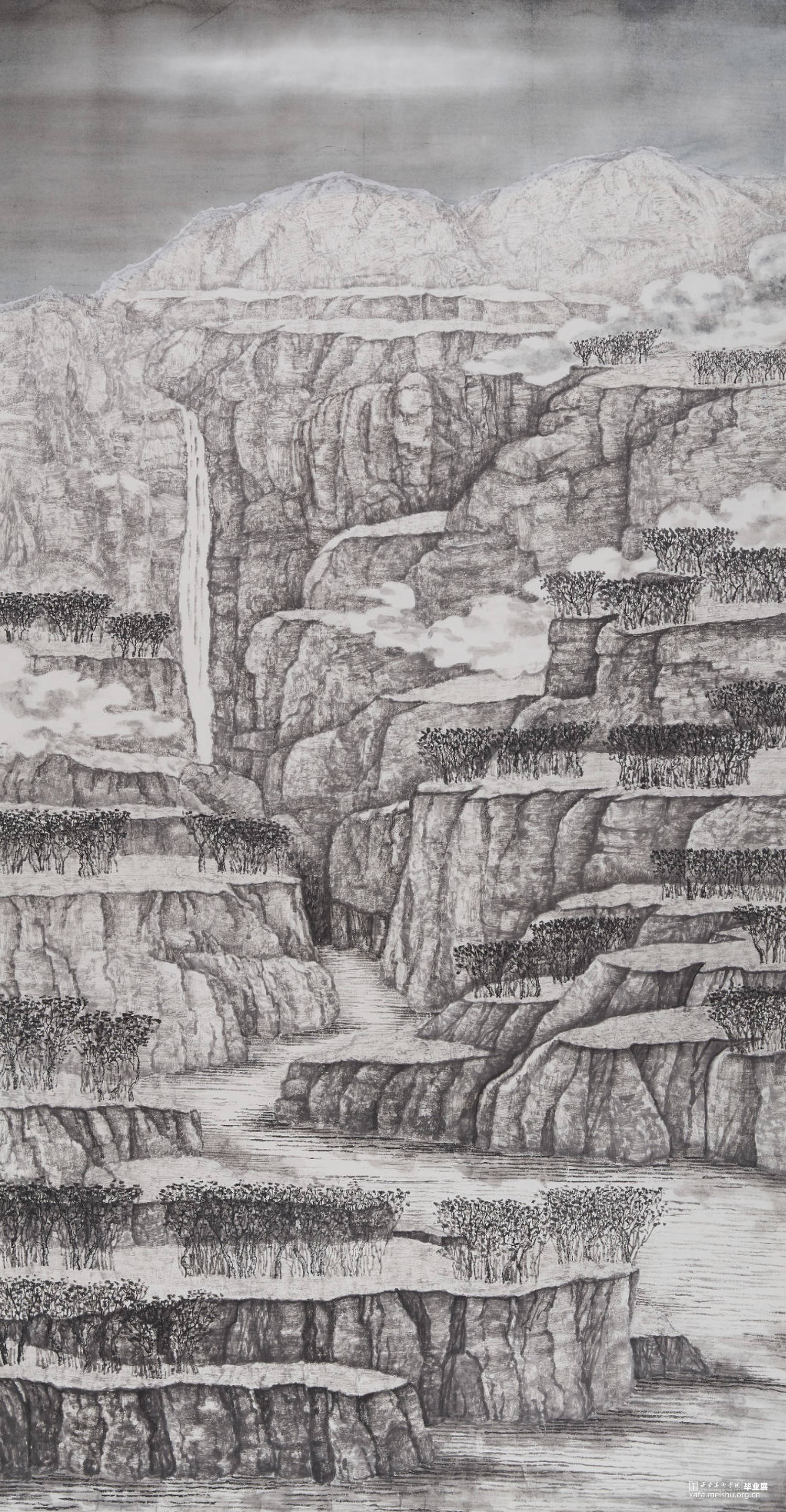 山间的水流覆盖了原本荒芜的山间,山上的树木为山石带去了新的生机。画面左虚右实,虚实间相互对比,使画面体现出纵深感。树木与环境则采用了浪漫理想表现方式,让人们的想象空间得到了拓展。通过人工的构思与拼接后的自然景观,使处在枯水期的山焕发出蓬勃的生机。