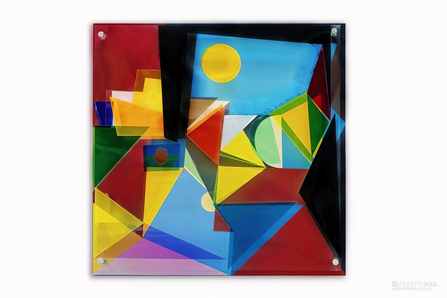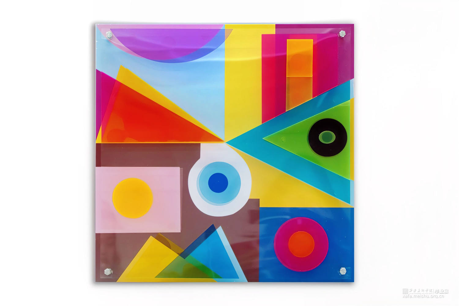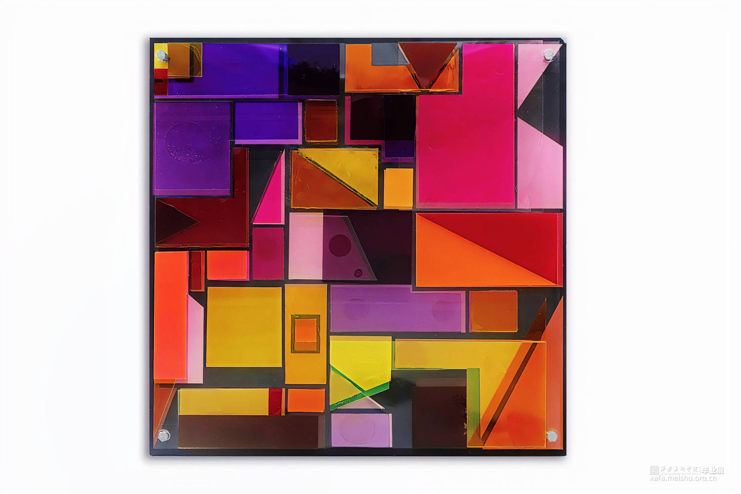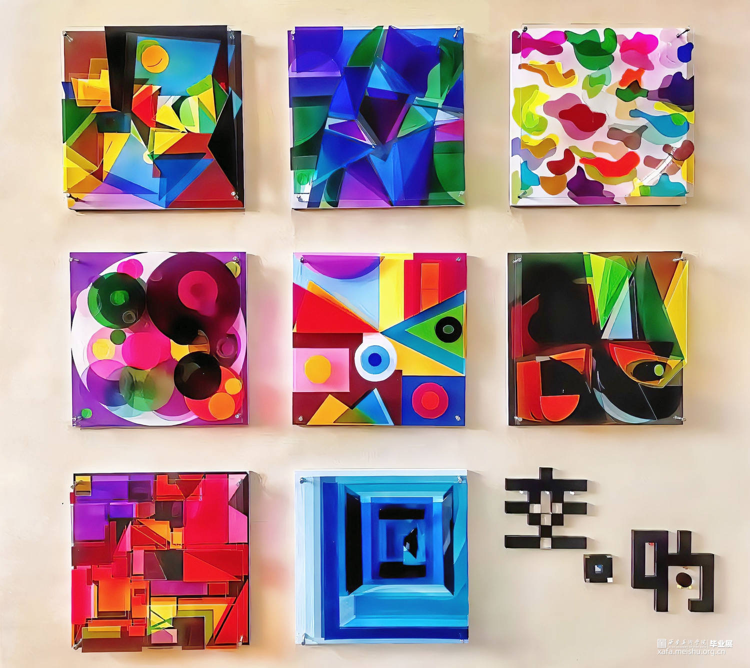 这是我作品想要表达的主题—性格色彩与情绪。一方面,我通过将不同的图形和颜色相结合,构造出一系列融合汇聚又迥然不同的画面。这些画面外化地体现了不同性格色彩的人们心中不同的情绪构成。另一方面,在材料上我使用了若干彩色透明亚克力切块,亚克力具有透明透光,可塑性强的特点,这些亚克力切块通过设计互相堆叠在一起,有明暗交错,层次结合,映射出人们性格的多变复杂与丰富有趣。色彩交汇融合,亚克力交织堆叠,奏响人性之美,一幅一情,各有千秋,愿与众分享共鸣。