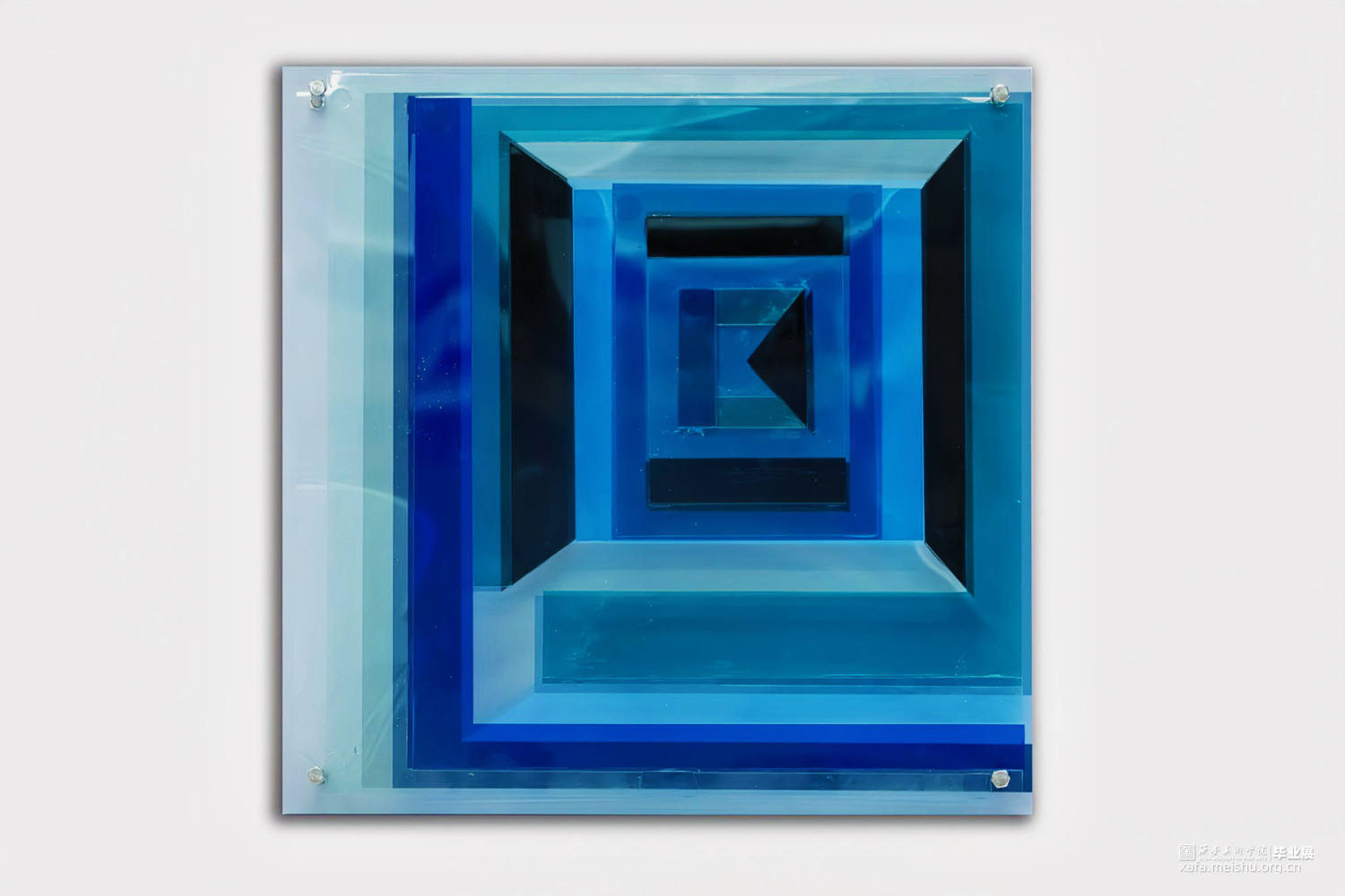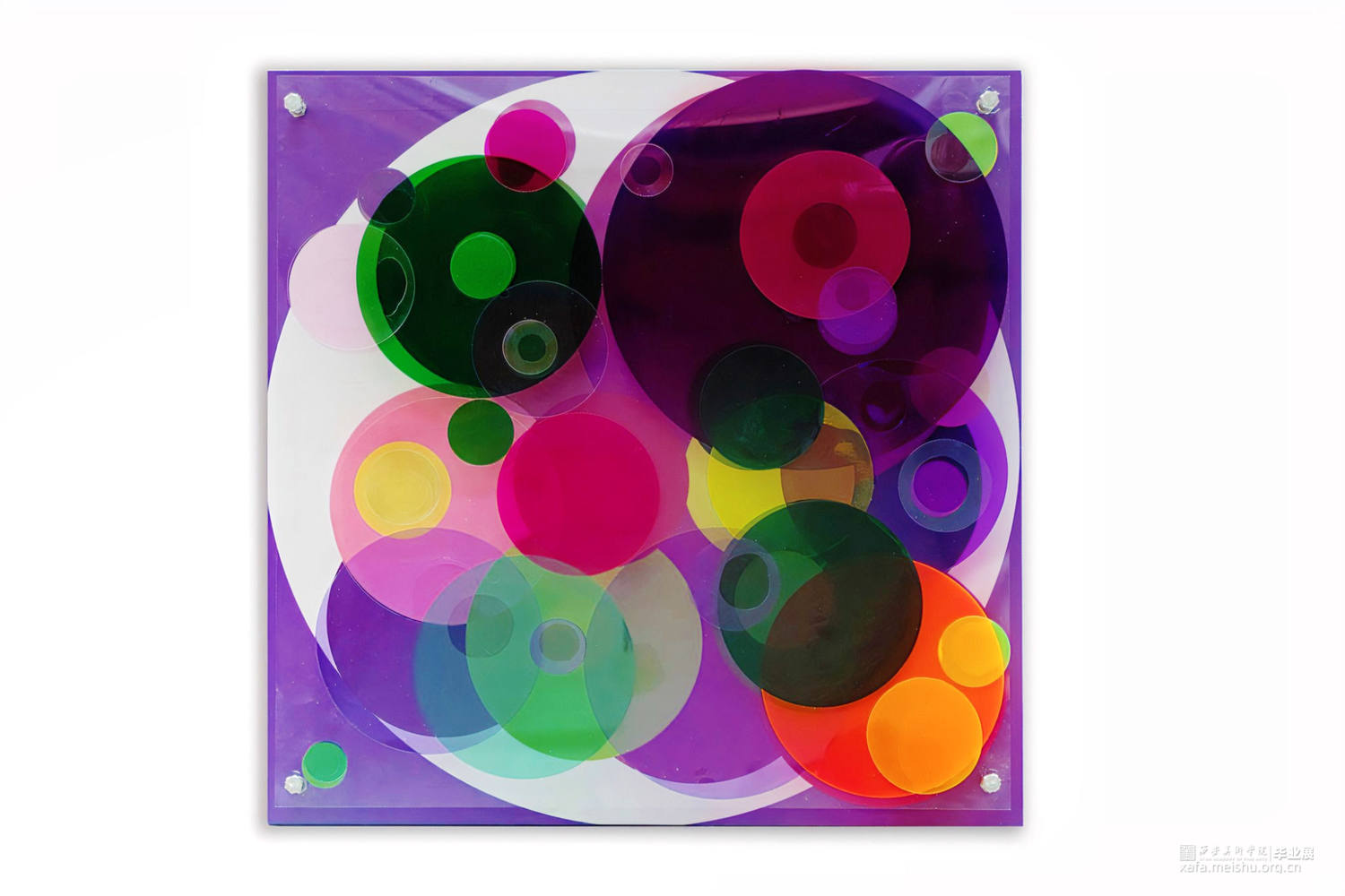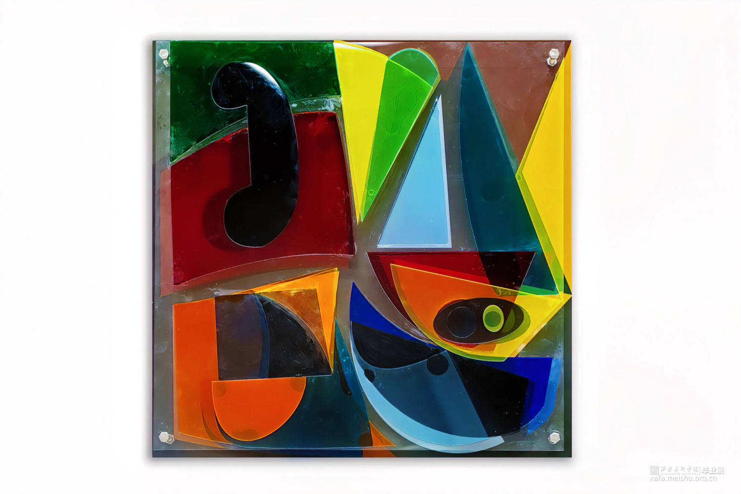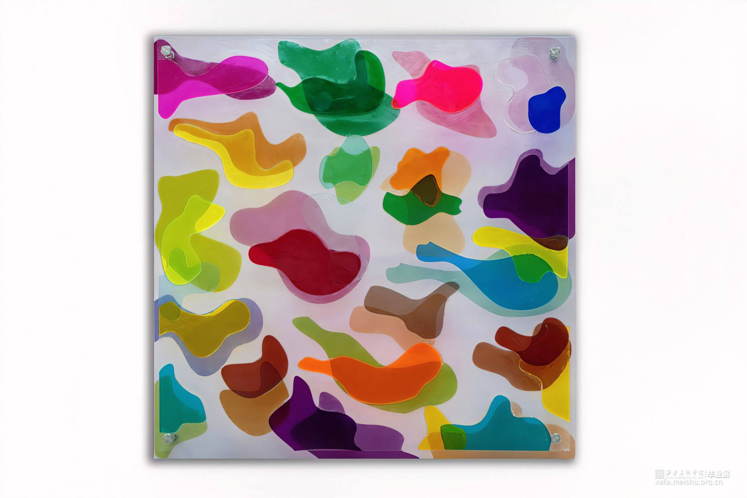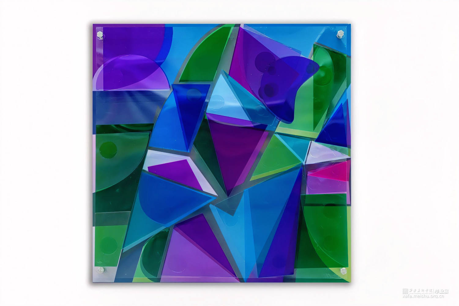 这是我作品想要表达的主题—性格色彩与情绪。一方面,我通过将不同的图形和颜色相结合,构造出一系列融合汇聚又迥然不同的画面。这些画面外化地体现了不同性格色彩的人们心中不同的情绪构成。另一方面,在材料上我使用了若干彩色透明亚克力切块,亚克力具有透明透光,可塑性强的特点,这些亚克力切块通过设计互相堆叠在一起,有明暗交错,层次结合,映射出人们性格的多变复杂与丰富有趣。色彩交汇融合,亚克力交织堆叠,奏响人性之美,一幅一情,各有千秋,愿与众分享共鸣。
