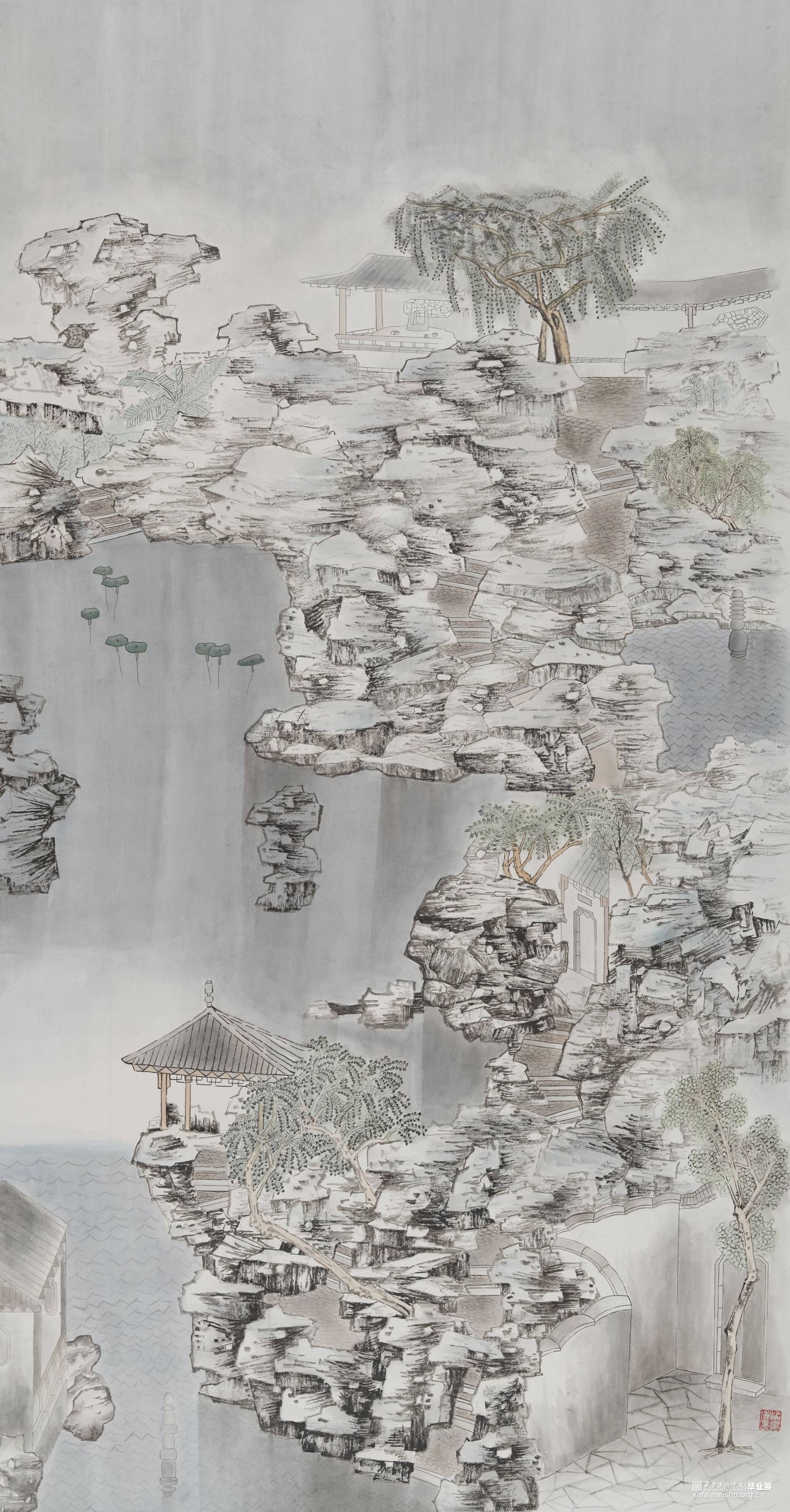 江南水乡,以水景擅长,水石相映,构成园林主景。太湖产奇石,玲珑多姿,植立庭中,可供赏玩。我所作的这幅作品汲取了他人对太湖石的理解和绘画的经验,选用宣石的结构为主体,不断排列不断叠加,以达到画面完整且美观的程度。后期通过指导老师的建议与修改完成了终稿。
