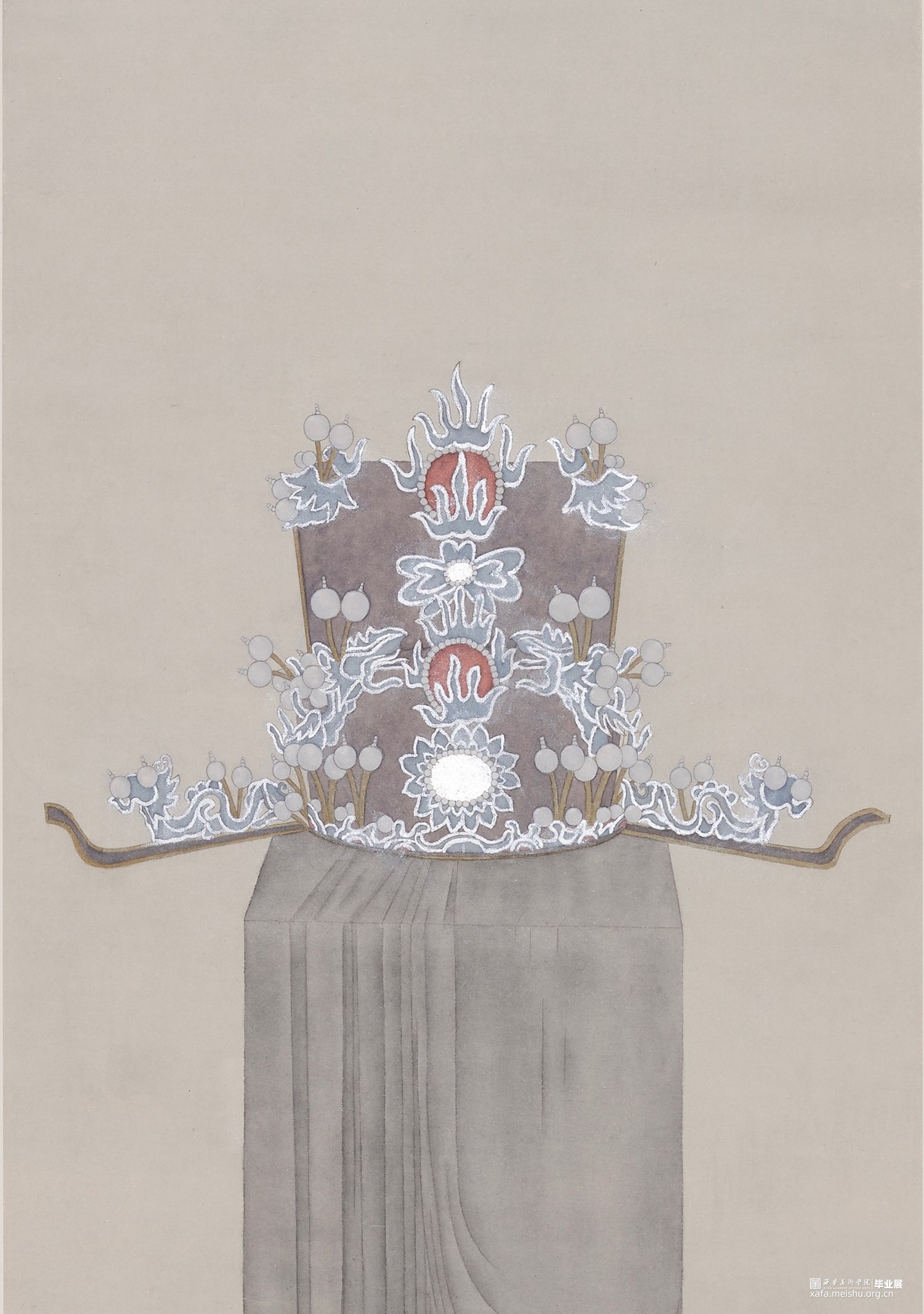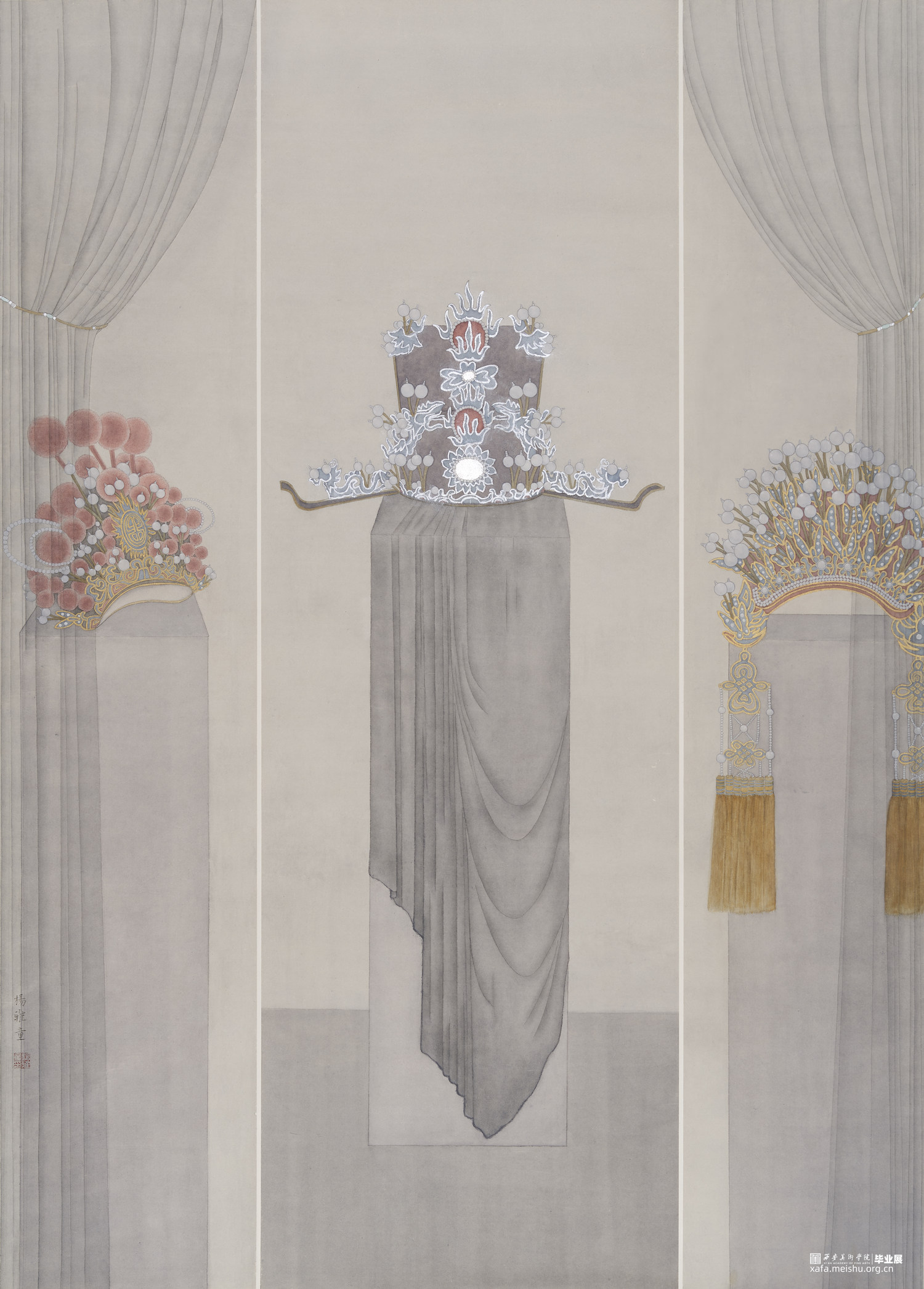 “凡音之起,由人心生也。人心之动,物使之然也。感于物而动,故形于声。”旦生净丑,唱念做打,演绎着忠孝节义,诉说着离合悲欢。从小便喜欢跟着姥爷看戏,看着台上抹着花脸的演员,咿咿呀呀地唱着人生百态。回首往事,给予我无限灵感。作品《梨园遗梦》以戏曲表演必不可少的盔头,角色性格身份的象征,来唤醒沉睡在内心中传统戏曲的记忆。借此契机,向世人展现中华传统戏曲的艺术美,感受传统戏曲文化的魅力与力量。