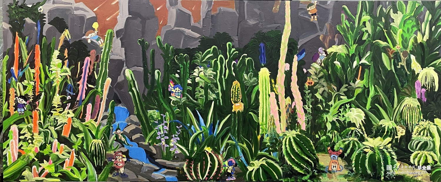 以油画的形式呈现了一个仙人掌乐园,将我们带入了一个神秘而富有生机的世界。这幅画以绿色为主色调,展现了大自然的繁茂与生命的韵律。