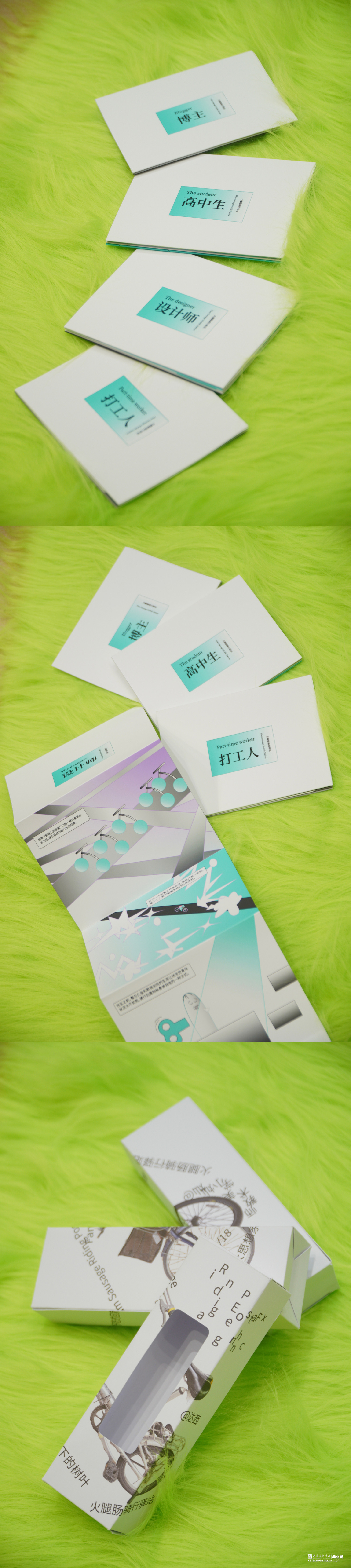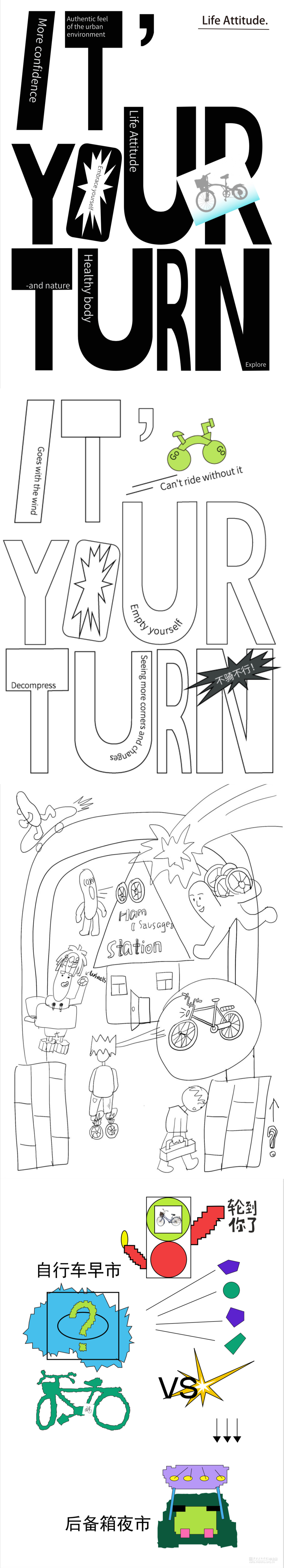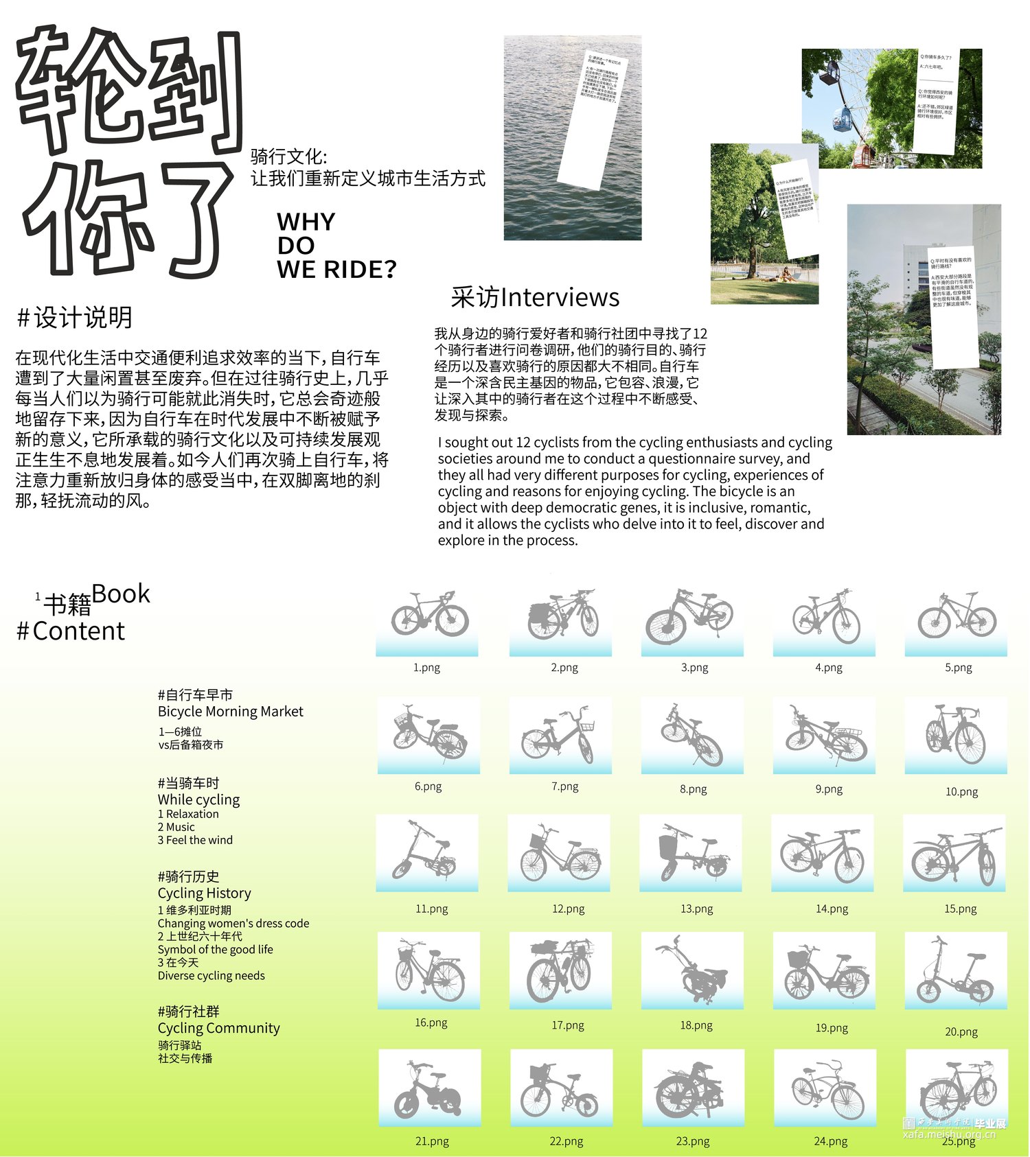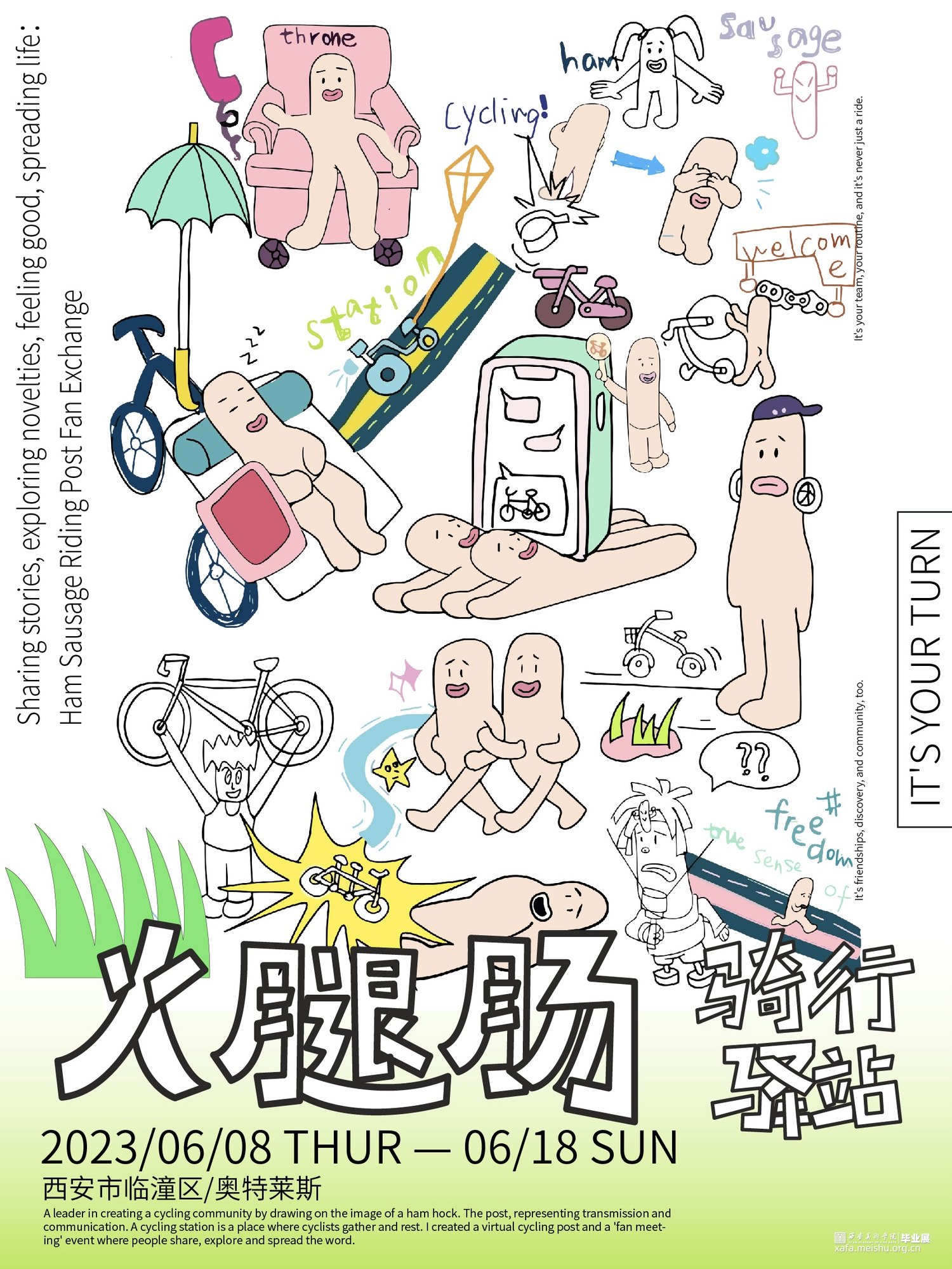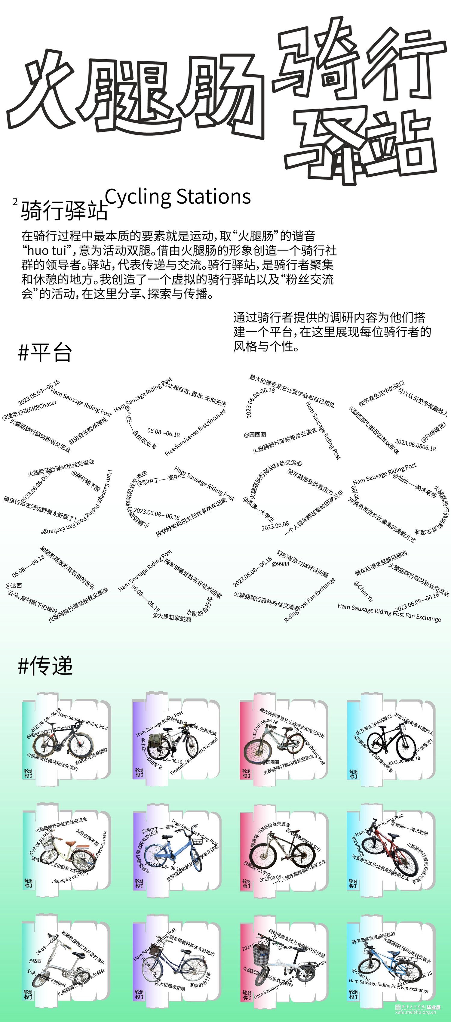 取火腿肠的谐音“huotui”,意为活动双腿,借由该形象创造一个骑行社群的领导者。驿站,代表传递与交流。火腿肠骑行驿站是聚集与传递骑行者和骑行文化的地方,我将12位受访者的信息进行排版作为平台,收集他们的自行车作为视觉中心,表达骑行者的个性化,以“快递盒”为载体,希望它能将骑行文化不断传递。