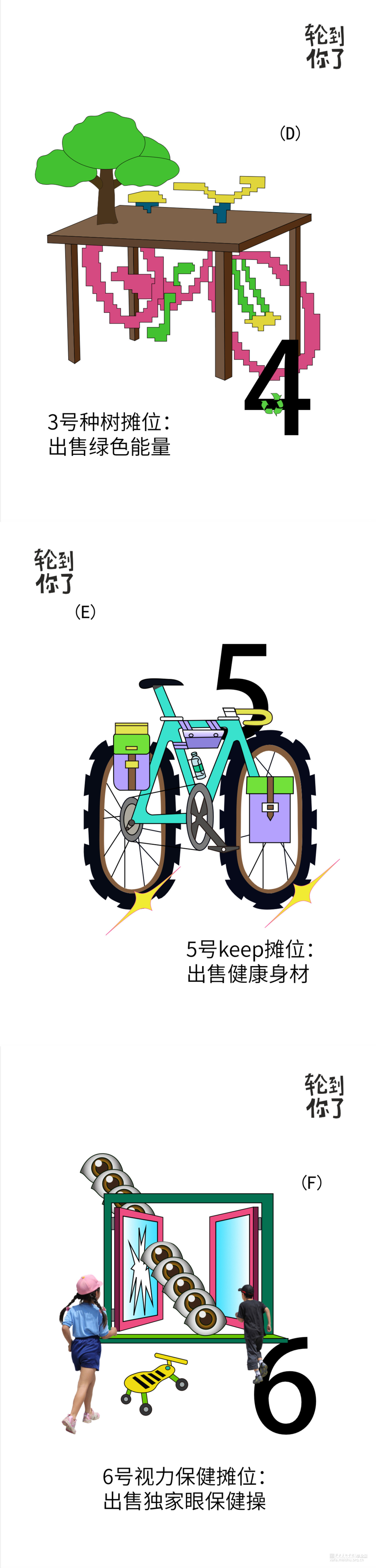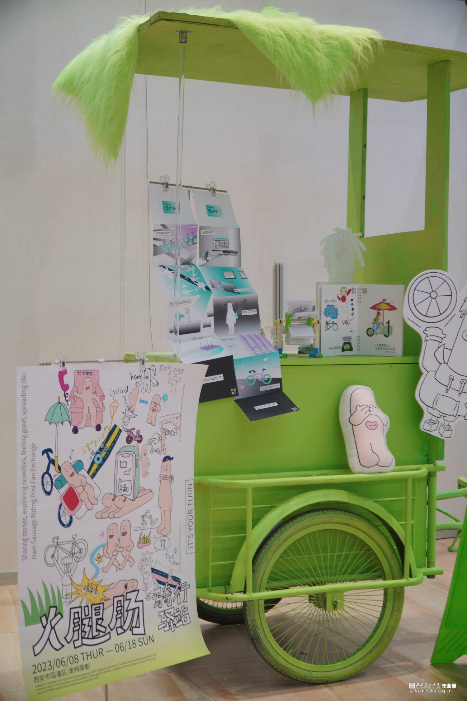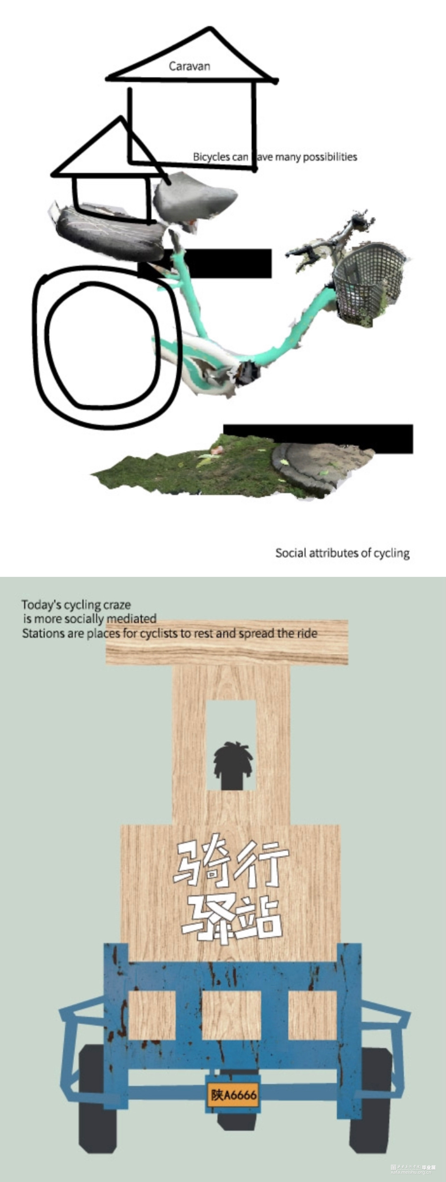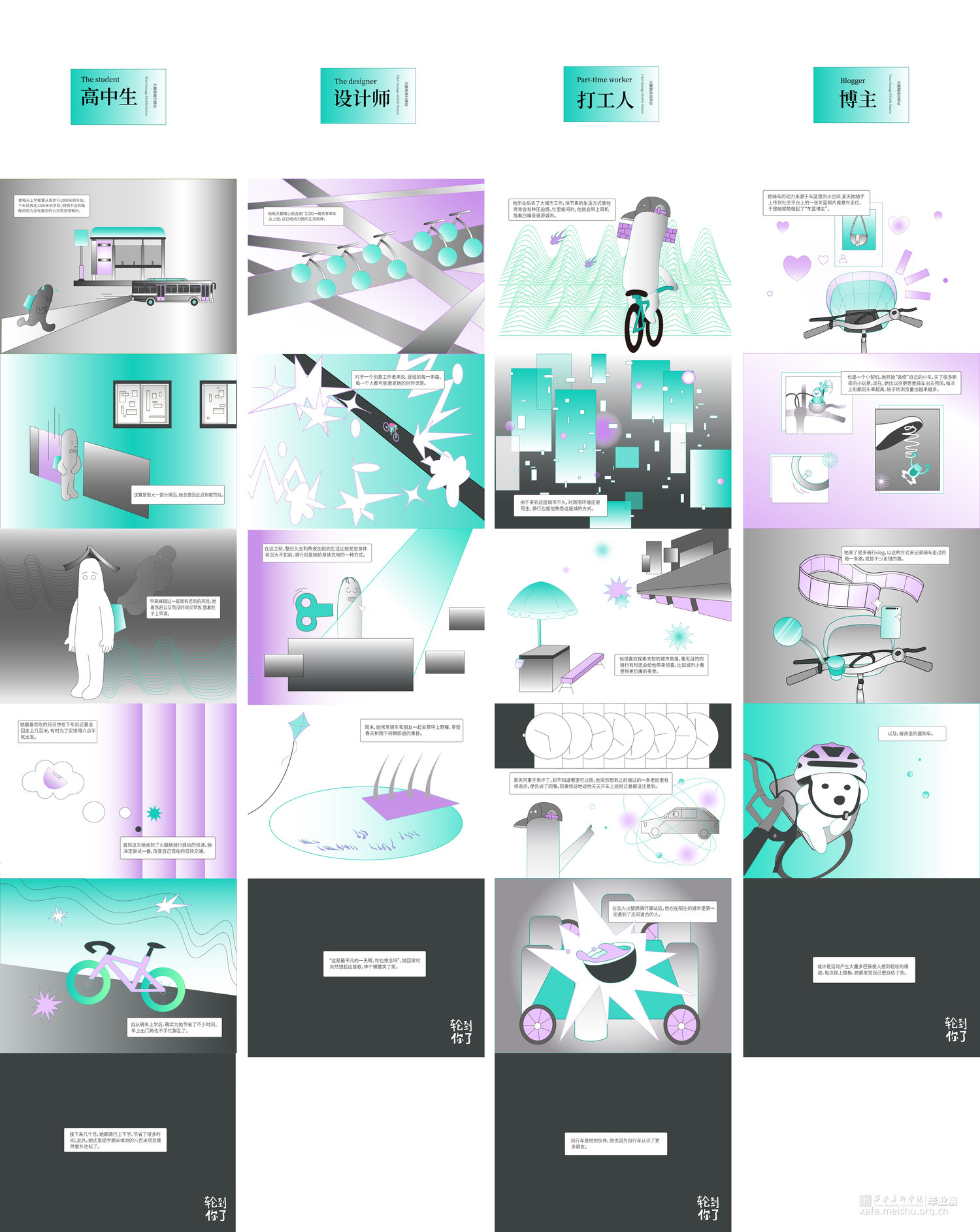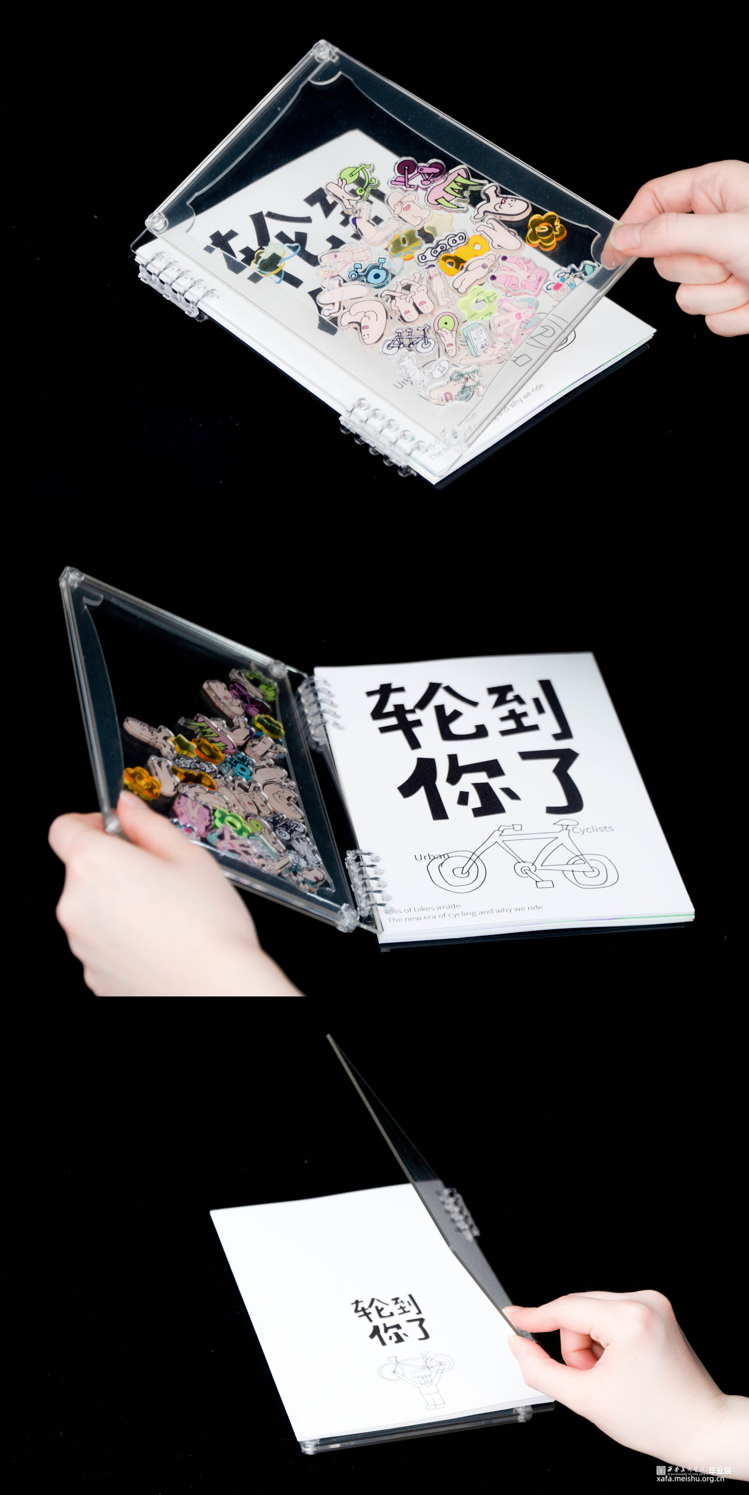 取火腿肠的谐音“huotui”,意为活动双腿,借由该形象创造一个骑行社群的领导者。驿站,代表传递与交流。火腿肠骑行驿站是聚集与传递骑行者和骑行文化的地方,我将12位受访者的信息进行排版作为平台,收集他们的自行车作为视觉中心,表达骑行者的个性化,以“快递盒”为载体,希望它能将骑行文化不断传递。