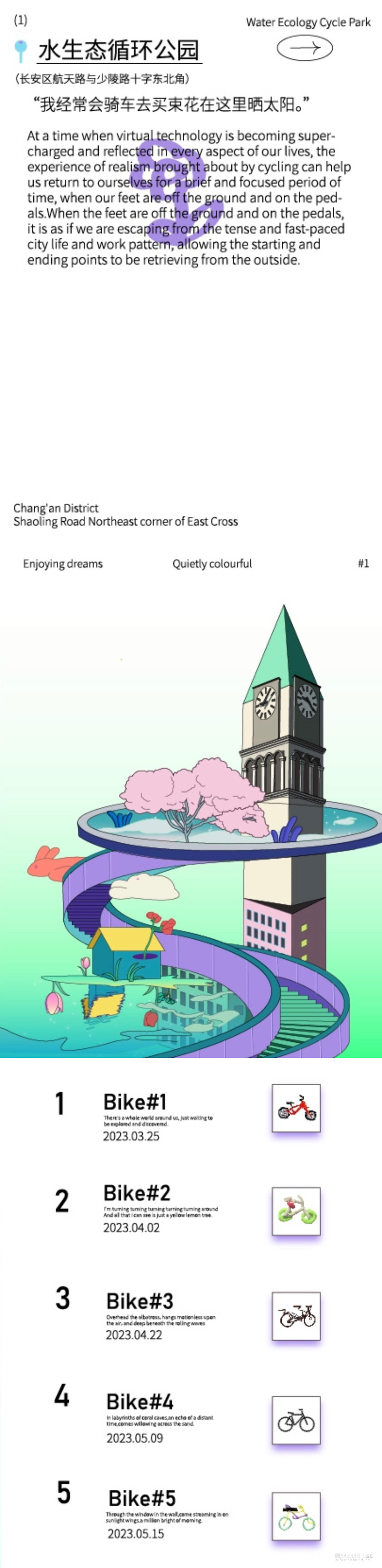 通过类比近年走火的“后备箱夜市”,以“自行车早市"的概念与之对应,用拼贴的方式将骑行文化视觉化;将受访者的骑行感受及骑行故事视觉化,传达不同骑行者的不同体验;在过往骑行史中选择具有影响力的三件大事:维多利亚时代骑行改变女性着装,促进女性解放、上世纪六十年代自行车作为“三转一响”之一在国民心中的地位;以及在今天,骑行象征着一种美好的生活方式及态度,它能短暂地帮人们留住虚拟社会中的真实感,不同的人用它做不同的事,并且正在做很多。自行车被时代赋予了新的意义,人们曾骑着它远游、追逐现代化,也追寻自由。当你再次骑上自行车时,周围的环境将被重新唤醒,眼前的景化作流动的画卷,你甚至看得清路边商铺内的陈列,听得到路人的寒暄交谈,鼻尖飘过街边小摊里热气腾腾的香气。这些,都构成了日常生活的真实感,穿城而过时或许会发觉,人确乎是为了这些非必要而活着。