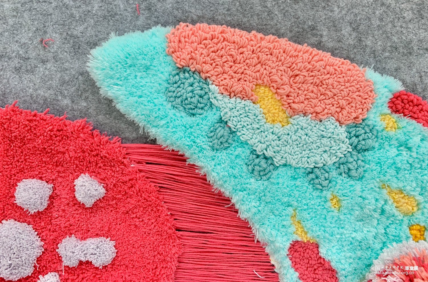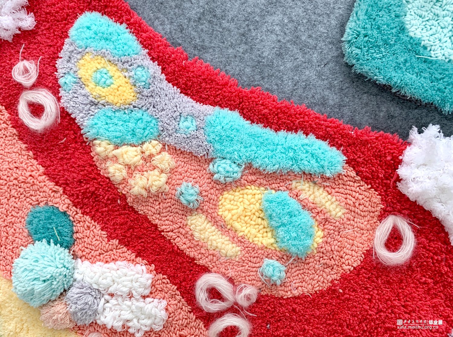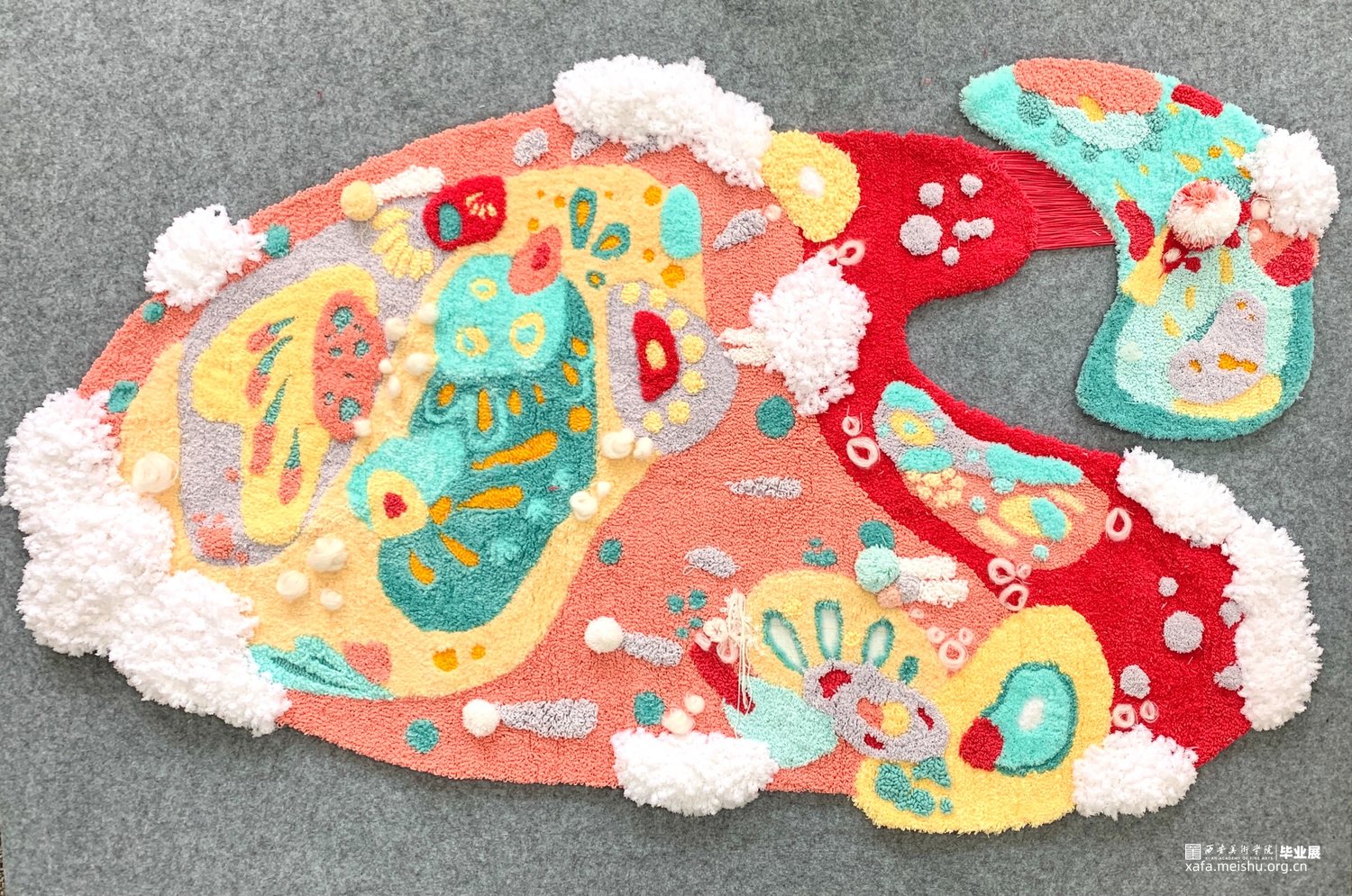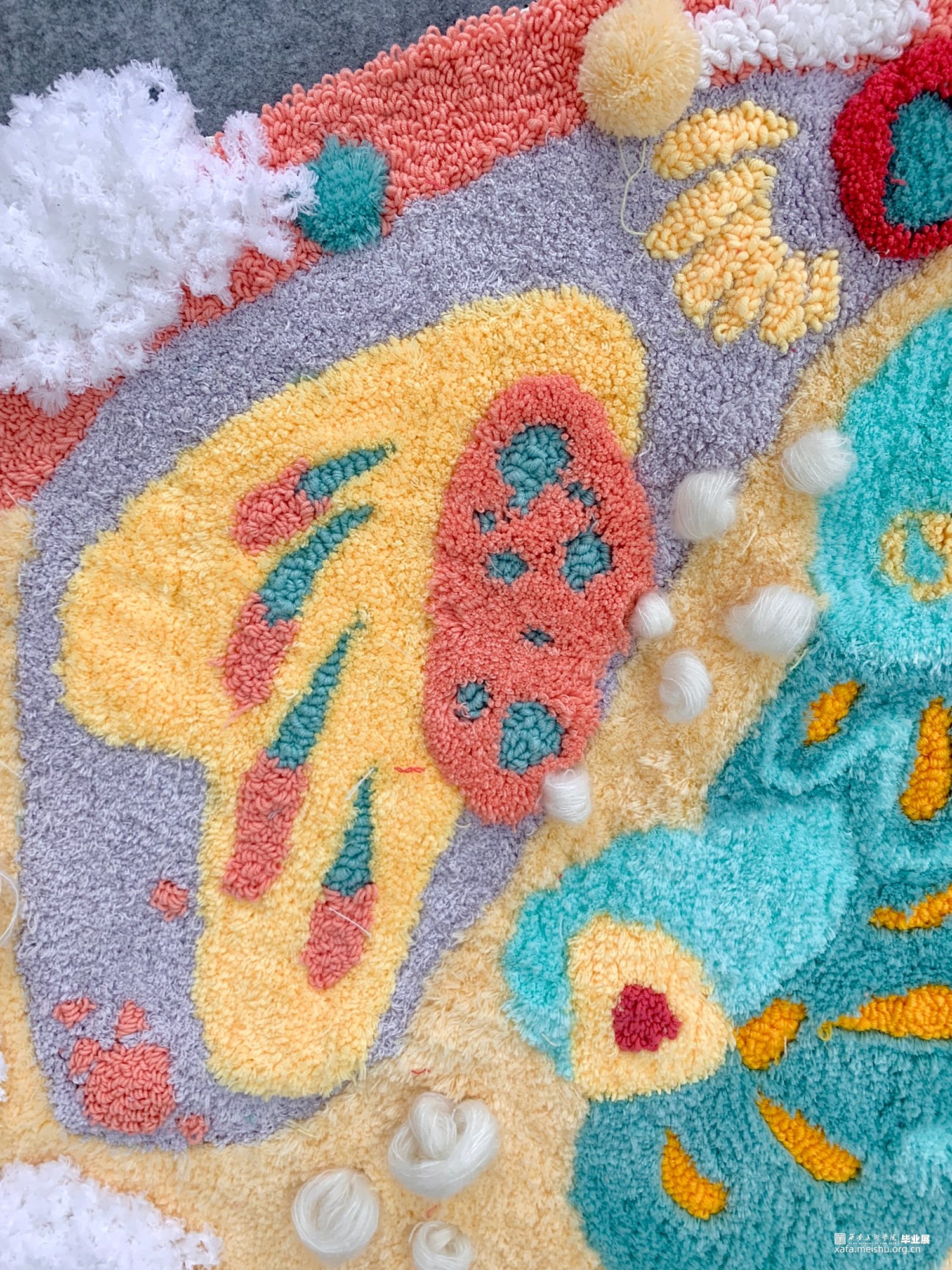 作品详情:主要使用牛奶棉毛线、珊瑚绒、海马毛等材料进行钩织、缠绕进行制作。完成设计图稿后制作耗时两个月时间。作品主要灵感来源于一堂少儿美术课关于儿童对梦的天马行空的想象力,从许许多多儿童作品中提取图形色彩进行组合创作。
