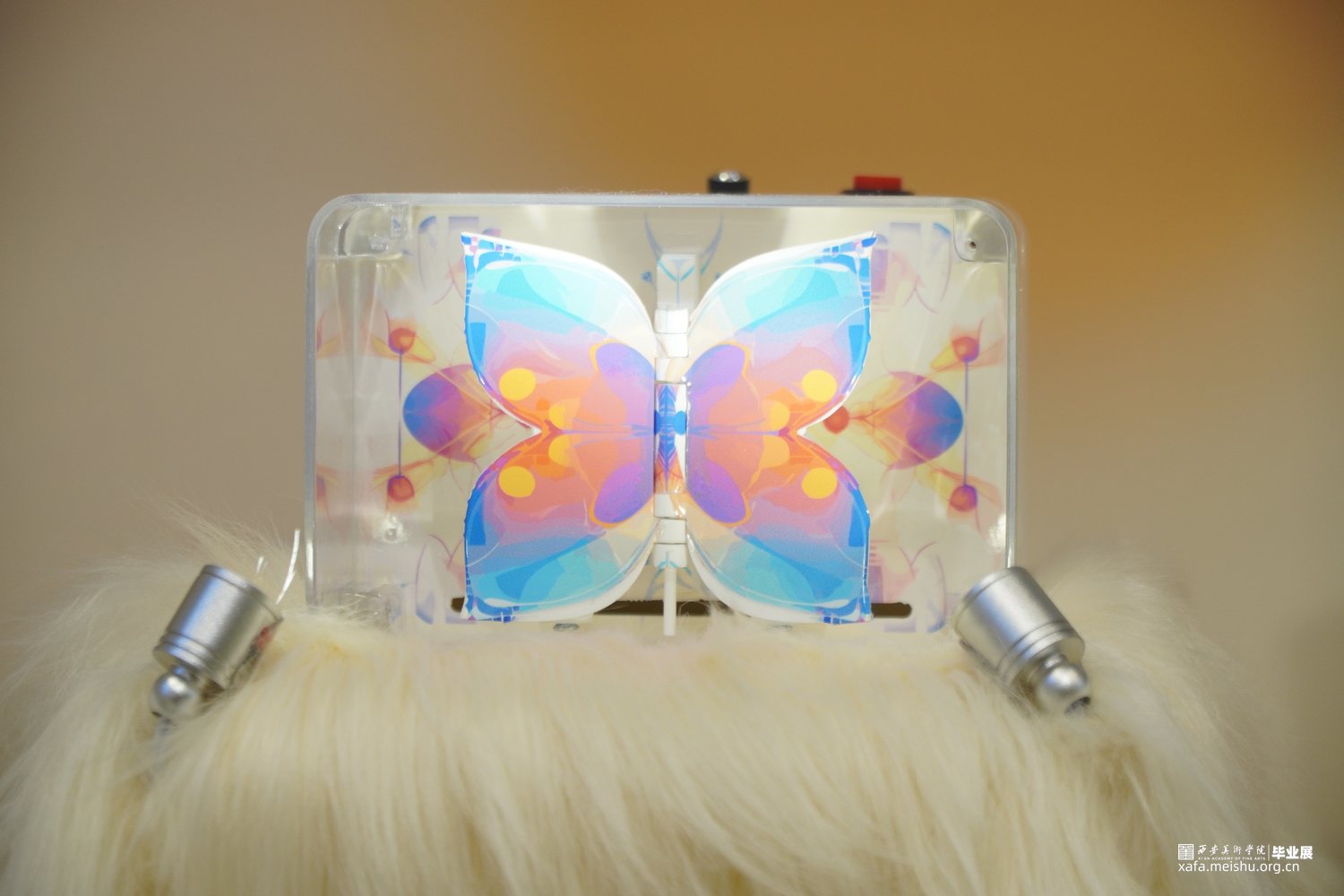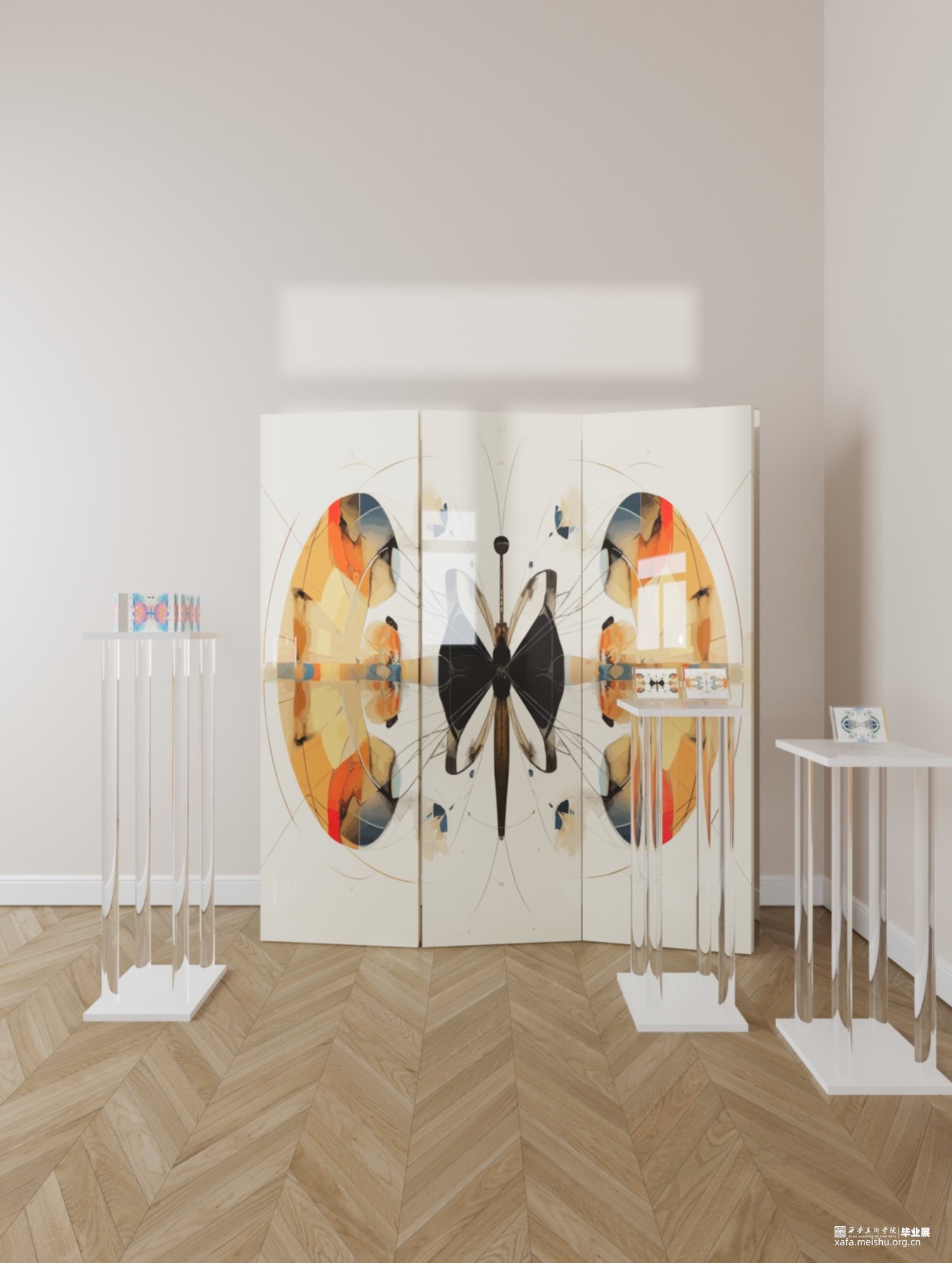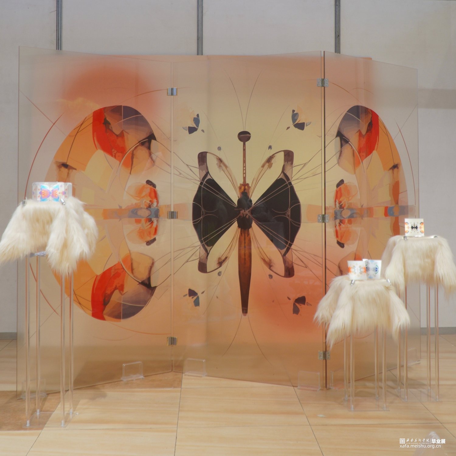 《觅光——Searching for light》创造了一个引人入胜的视觉景观。屏风的亚克力材质赋予了它透明而通透的特性。当光线穿过屏风时,形成迷人的光影效果,仿佛蝴蝶在微风中翩翩起舞。更为引人注目的是装置中的可动蝴蝶。盒子的设计灵感来源于蝴蝶的翅膀,它们轻盈且灵活。当按下开关时,翅膀会轻轻扇动,仿佛展现出生命的活力和自由的灵魂。这种动态的元素为整个装置增添了生机和活力,同时与屏风形成了和谐的对比。