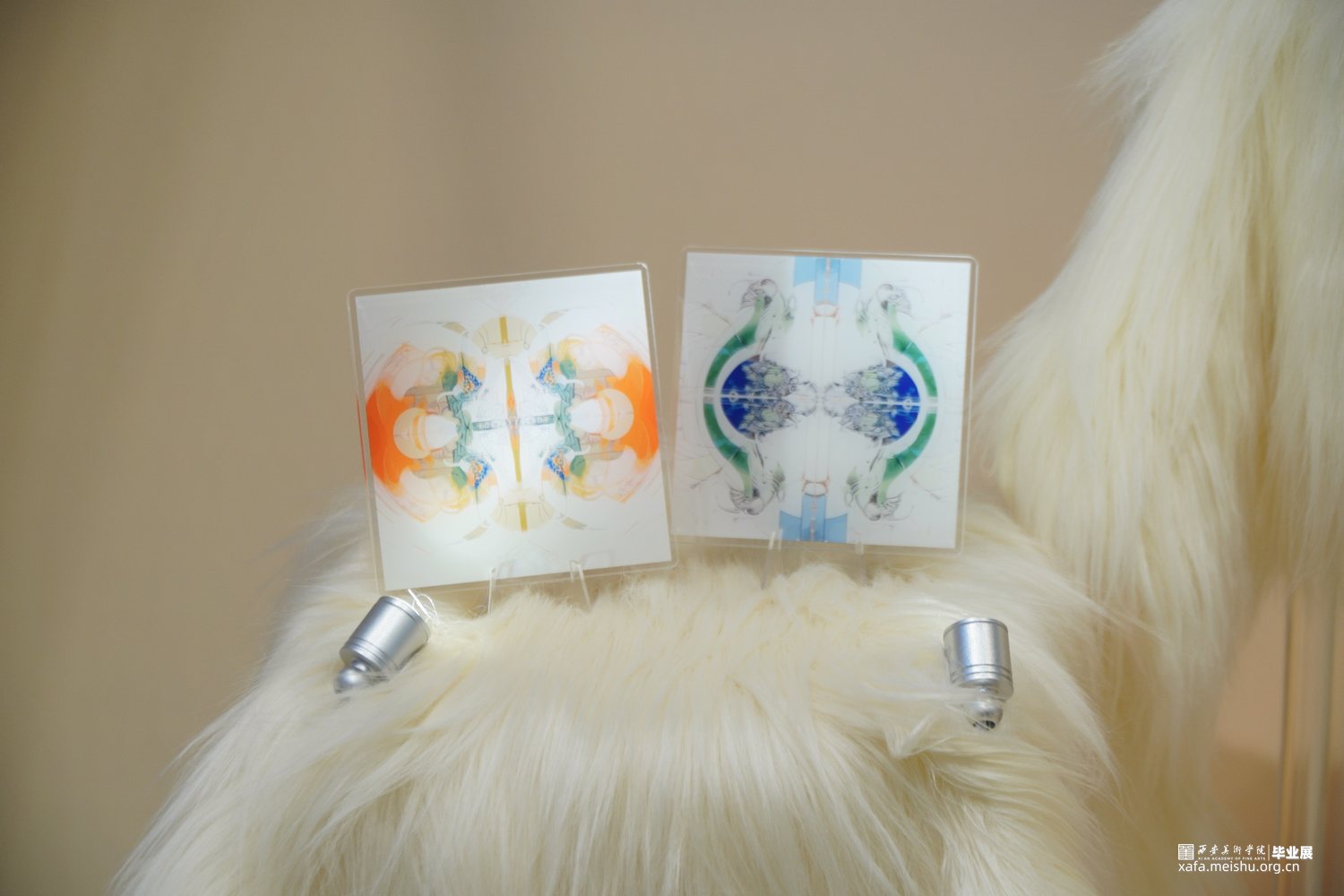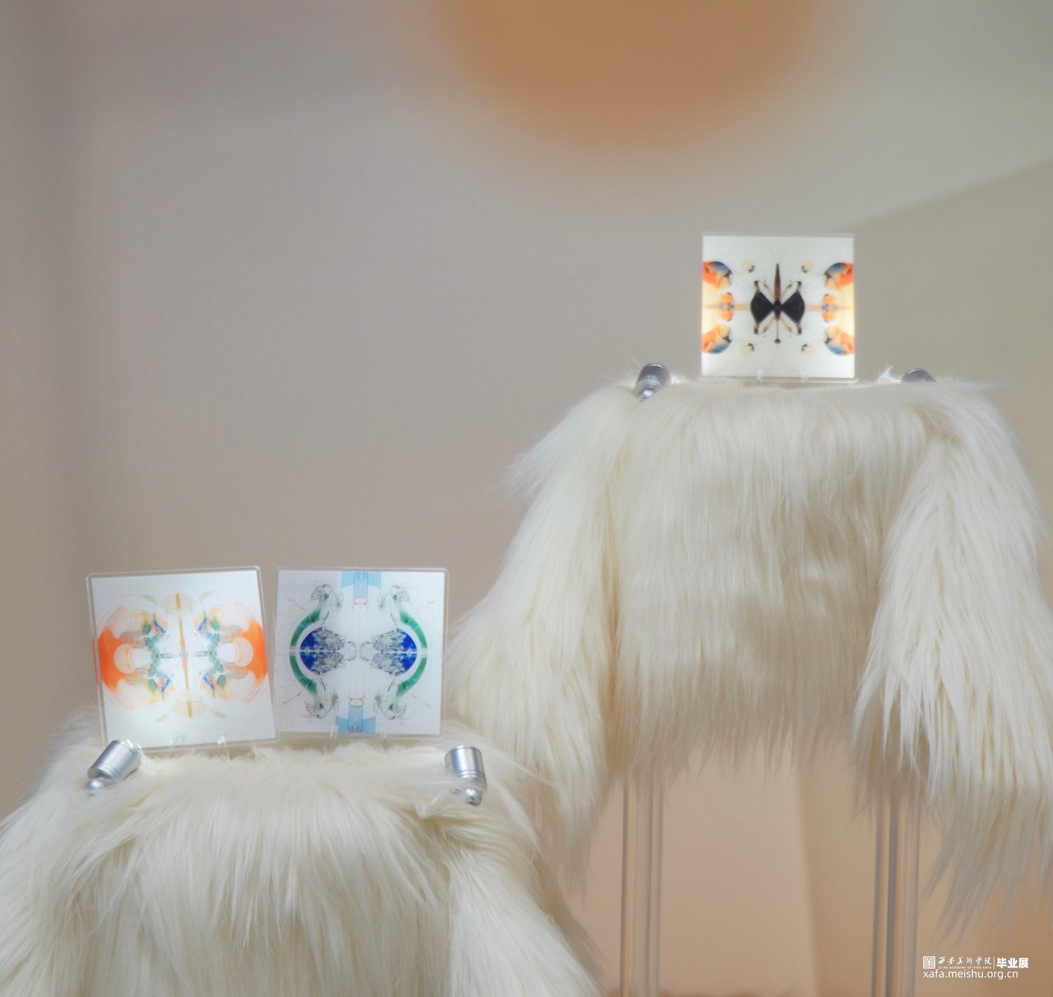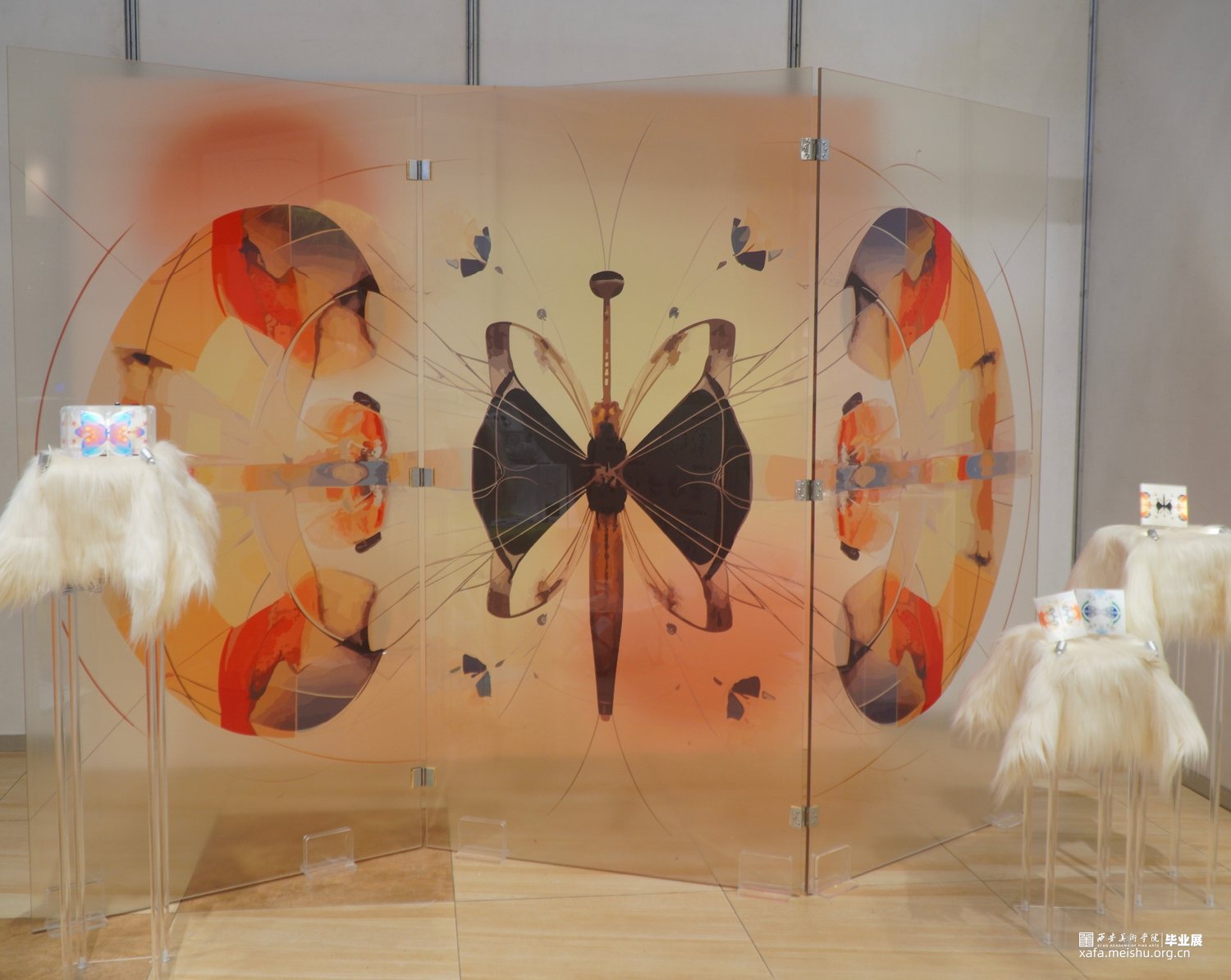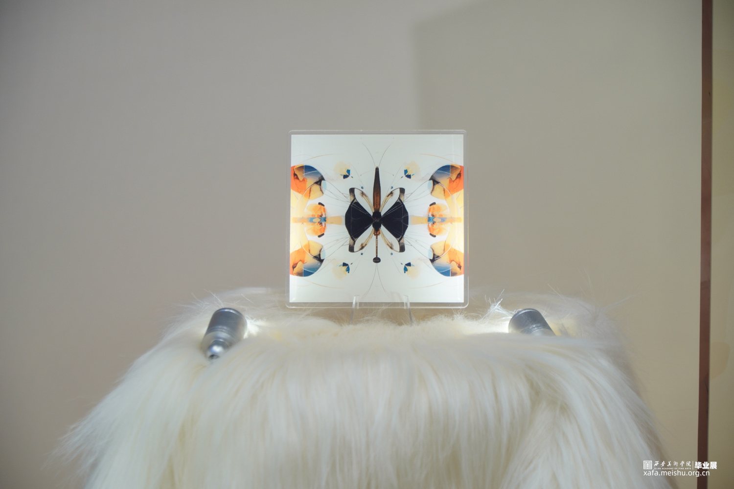 《觅光——Searching for light》创造了一个引人入胜的视觉景观。屏风的亚克力材质赋予了它透明而通透的特性。当光线穿过屏风时,形成迷人的光影效果,仿佛蝴蝶在微风中翩翩起舞。更为引人注目的是装置中的可动蝴蝶。盒子的设计灵感来源于蝴蝶的翅膀,它们轻盈且灵活。当按下开关时,翅膀会轻轻扇动,仿佛展现出生命的活力和自由的灵魂。这种动态的元素为整个装置增添了生机和活力,同时与屏风形成了和谐的对比。