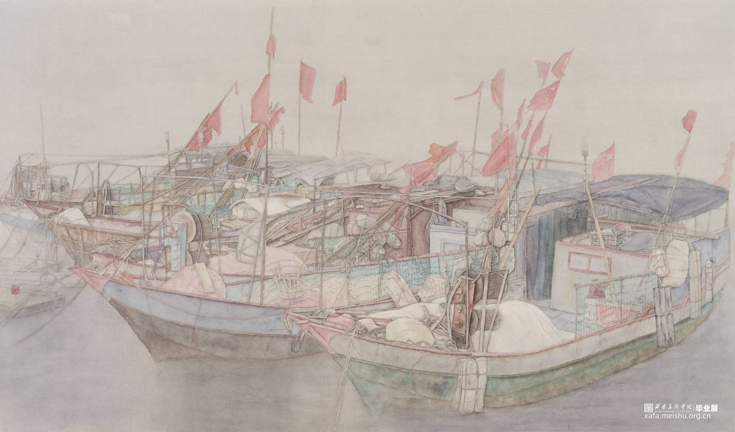 《1106》这幅作品以民船与麻绳作为主要意象,运用工笔技法完成