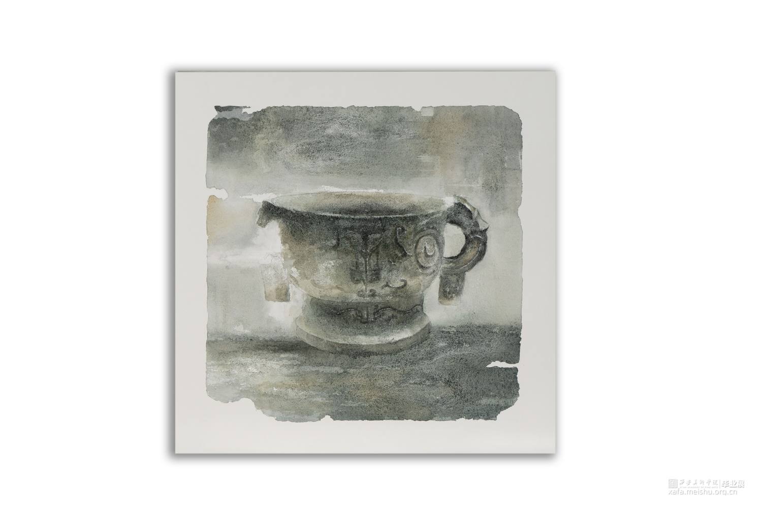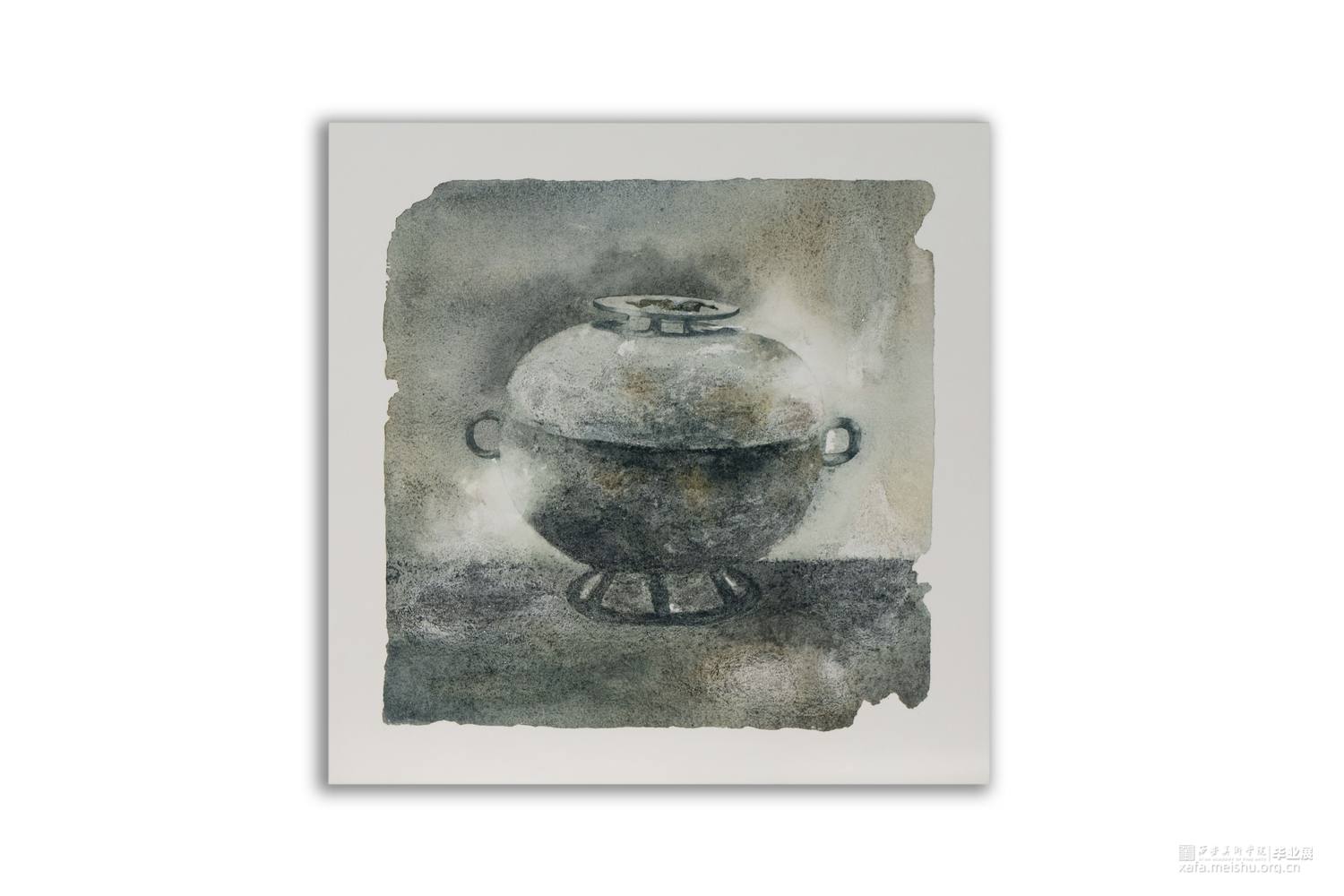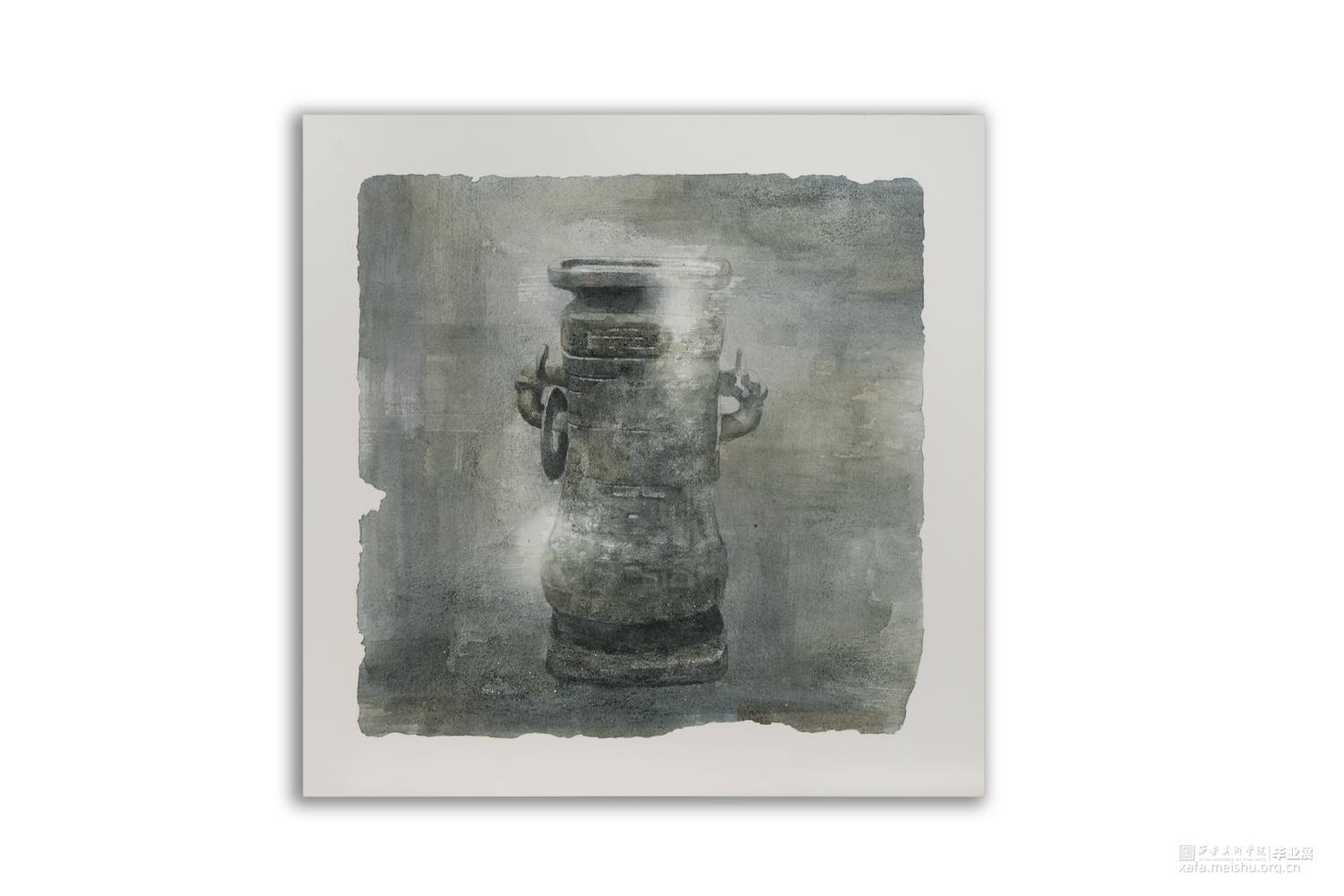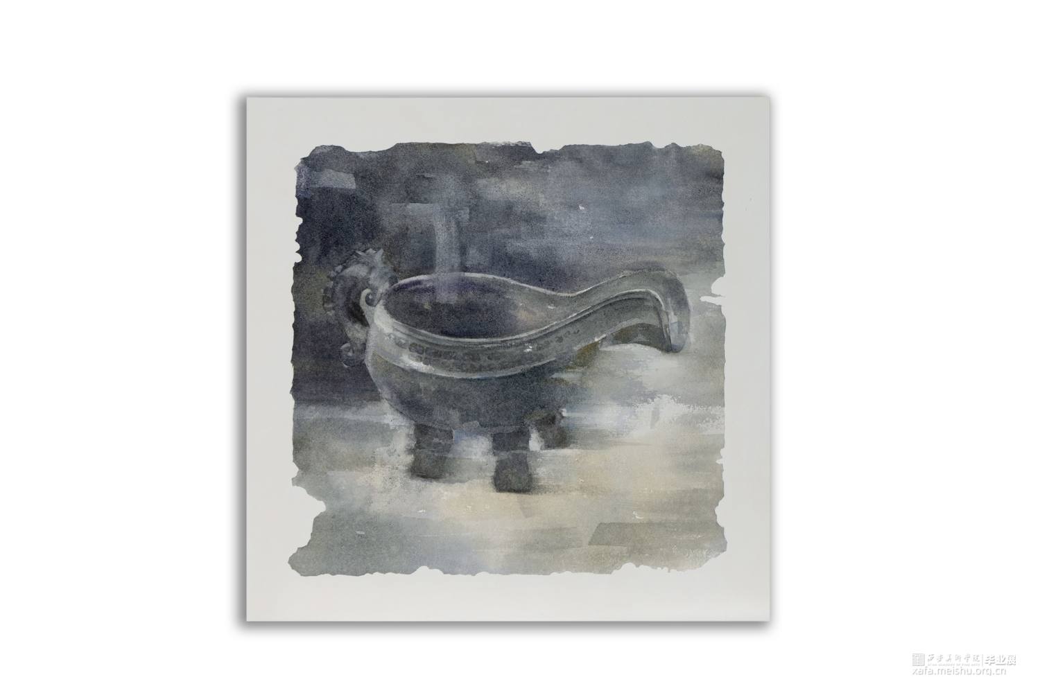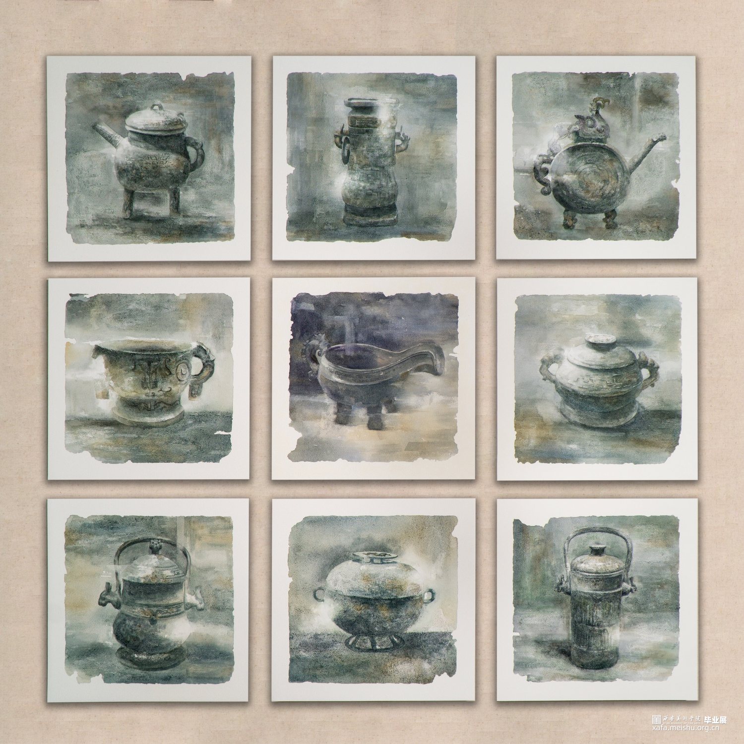 青铜器的样式千姿百态,在经过反复推敲后,我确定了九尊青铜器作为创作素材,其中有器型部分缺失的、有纹路被磨损难辨的、有铜锈布满内外的,虽然不完美,但每个青铜器都有它独特的美感。在作画的过程中尽量表现出岁月给予青铜器的沉淀,在部分区域进行留白,让整个青铜器更加通透。