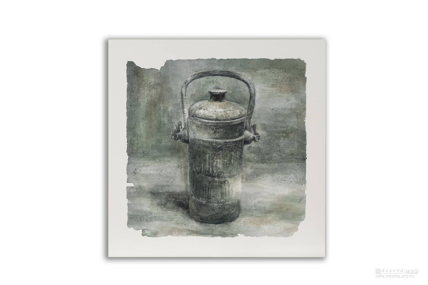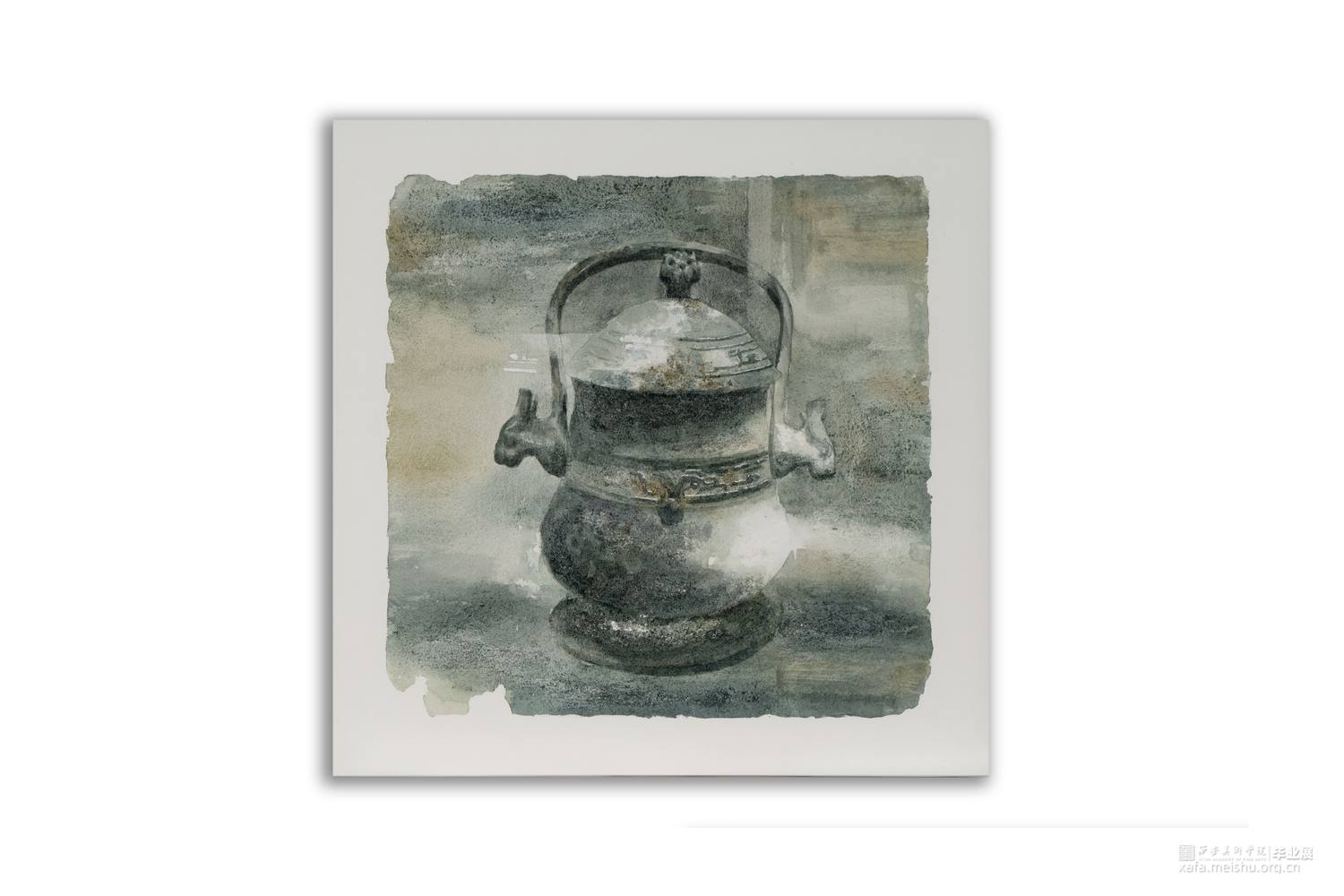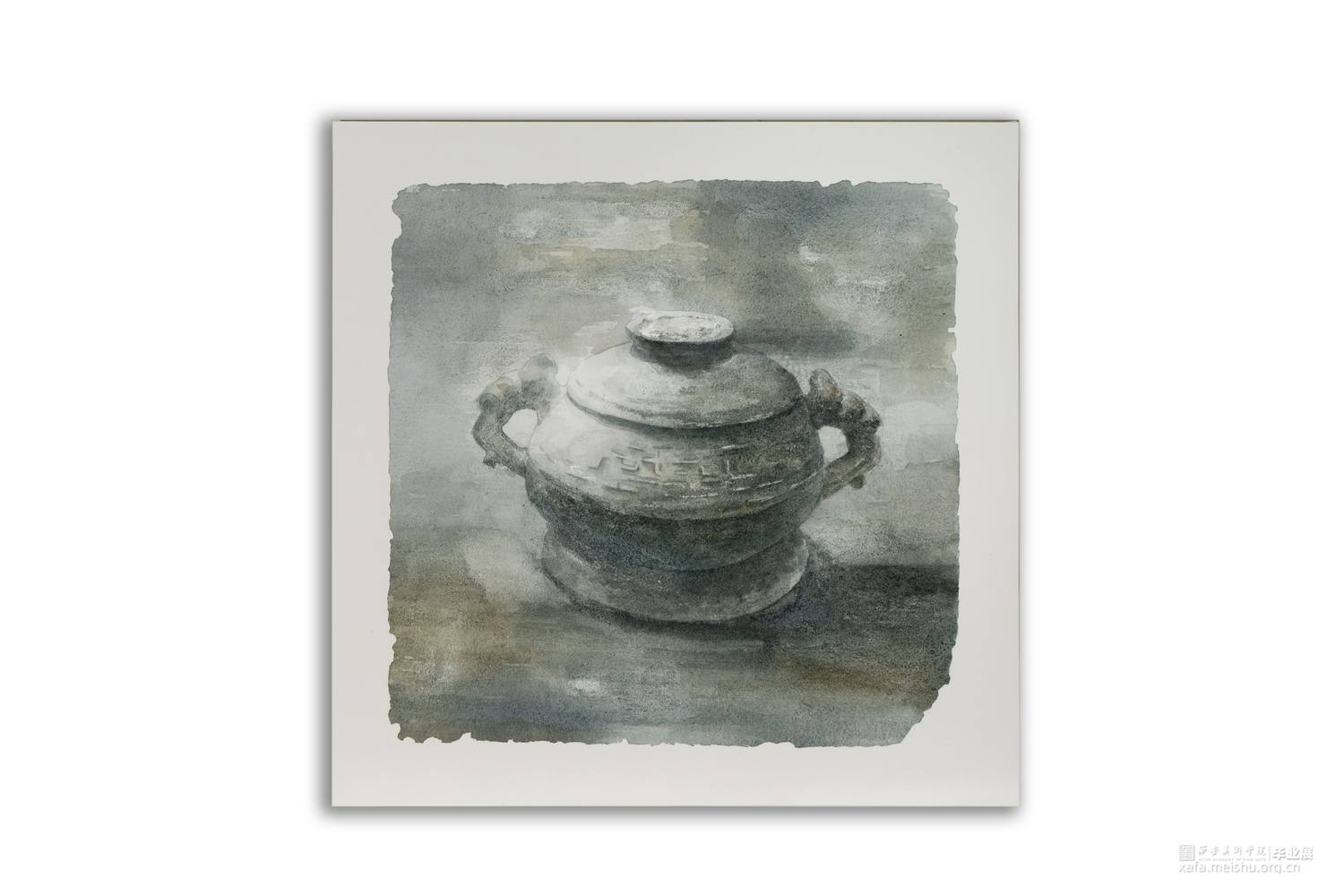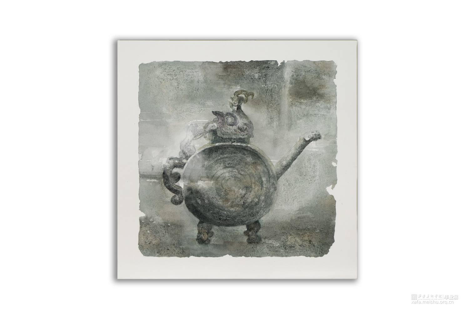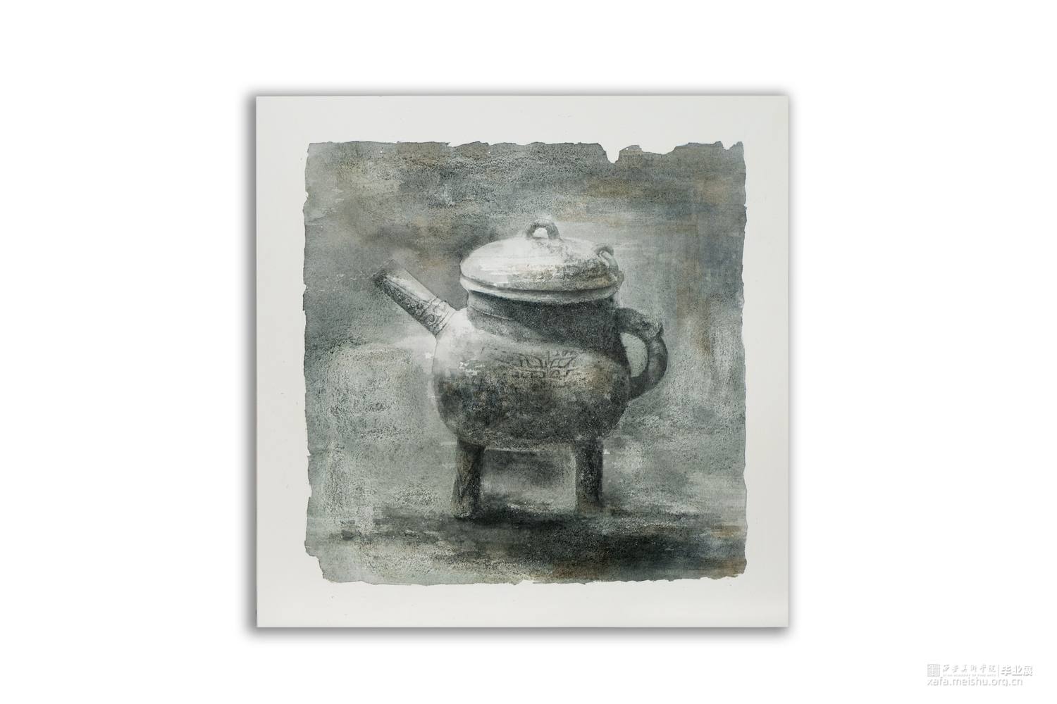 青铜器的样式千姿百态,在经过反复推敲后,我确定了九尊青铜器作为创作素材,其中有器型部分缺失的、有纹路被磨损难辨的、有铜锈布满内外的,虽然不完美,但每个青铜器都有它独特的美感。在作画的过程中尽量表现出岁月给予青铜器的沉淀,在部分区域进行留白,让整个青铜器更加通透。