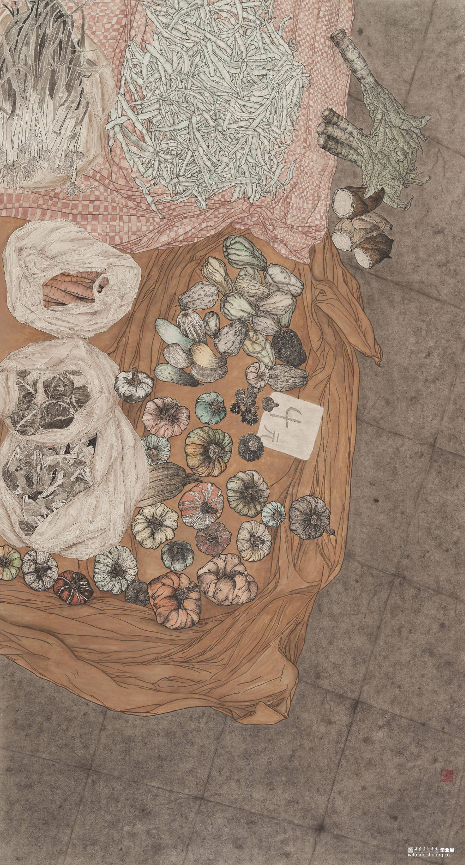 每一座古老的城市都有自己独特的记忆,《蔬·忆》是我游走于西安这座古城中的深巷,对夜市里面充满人间烟火气的瓜果蔬菜摊有感所创作而出的。人间有味是清欢,《蔬·忆》是在写实的基础上,加上本人的所感所悟进行创作,力求表现蔬果画中素朴与真善美的精神内涵,还原西安这座古城最本真的记忆。