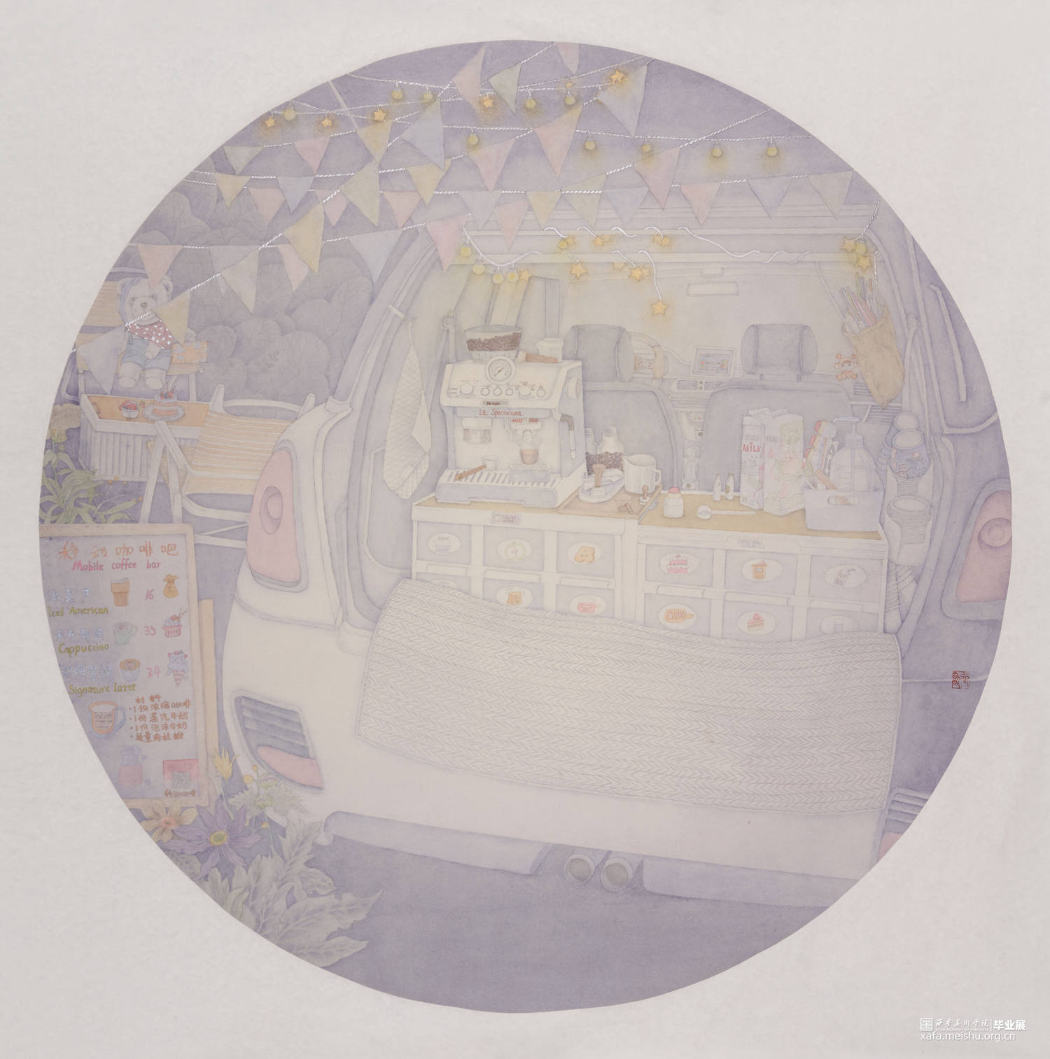 《半日闲》取材于夜市一角,画面中以汽车、咖啡机为主体,采用圆形构图,这副作品是本人夜晚闲时逛夜市所获灵感。“我有咖啡,你有故事吗?”不知从何时起,城市角落、街头巷尾,在一个个合法停车位或者收费停车位上,一辆辆后备箱搭载着简单吧台的移动咖啡车出现,如同贩售“氛围”的网红拍照点,一跃成为年轻人向往的浪漫场景。相对于那些开在繁华商圈或是文艺小巷的传统西式咖啡店的"拘谨",随性、放松的街头咖啡更有一种"市井"气。添上一杯咖啡消磨半天时光,暂时远离生活的烦恼,偷得浮生半日闲。
