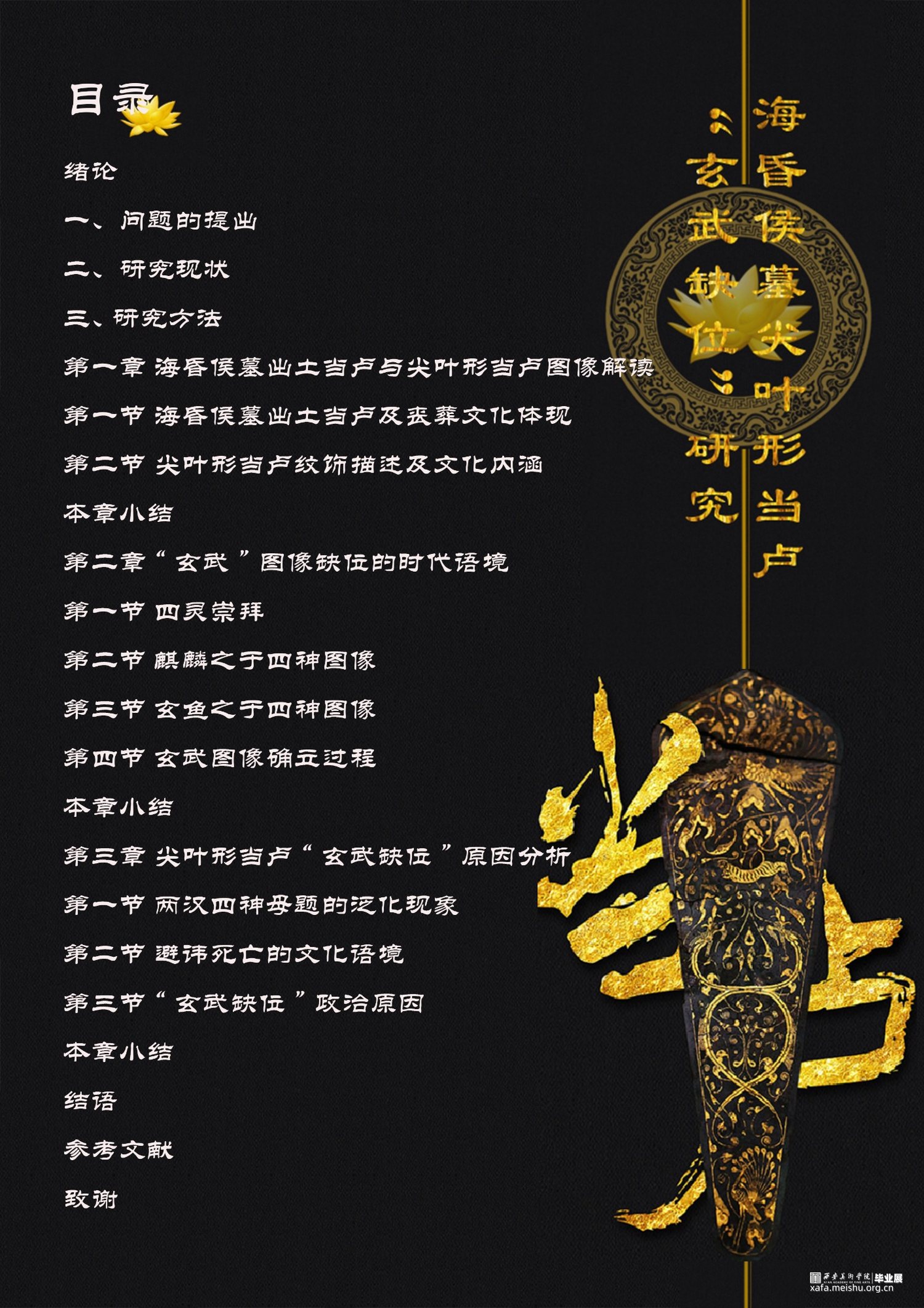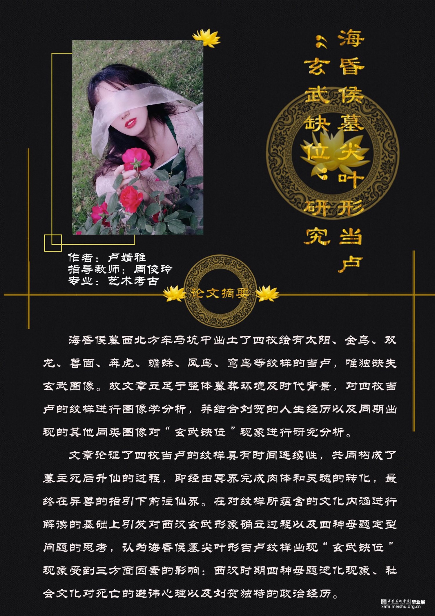 文章论证了四枚当卢的纹样具有时间连续性,共同构成了墓主死后升仙的过程,即经由冥界完成肉体和灵魂的转化,最终在异兽的指引下前往仙界。在对纹样所蕴含的文化内涵进行解读的基础上引发对西汉玄武形象确立过程以及四神母题定型问题的思考,认为海昏侯墓尖叶形当卢