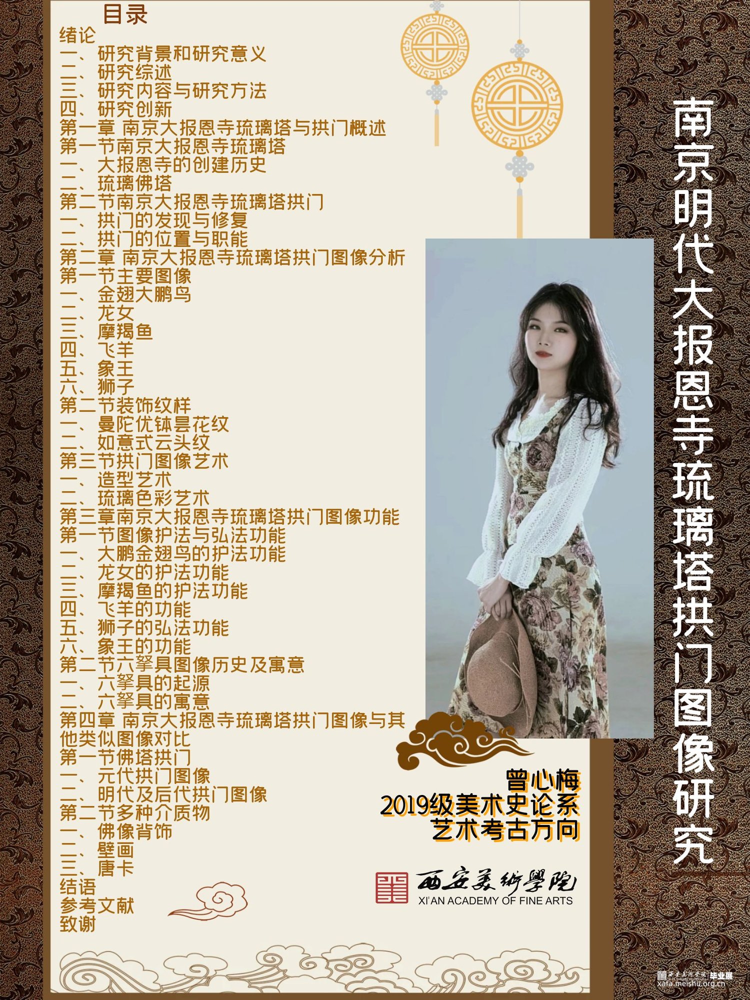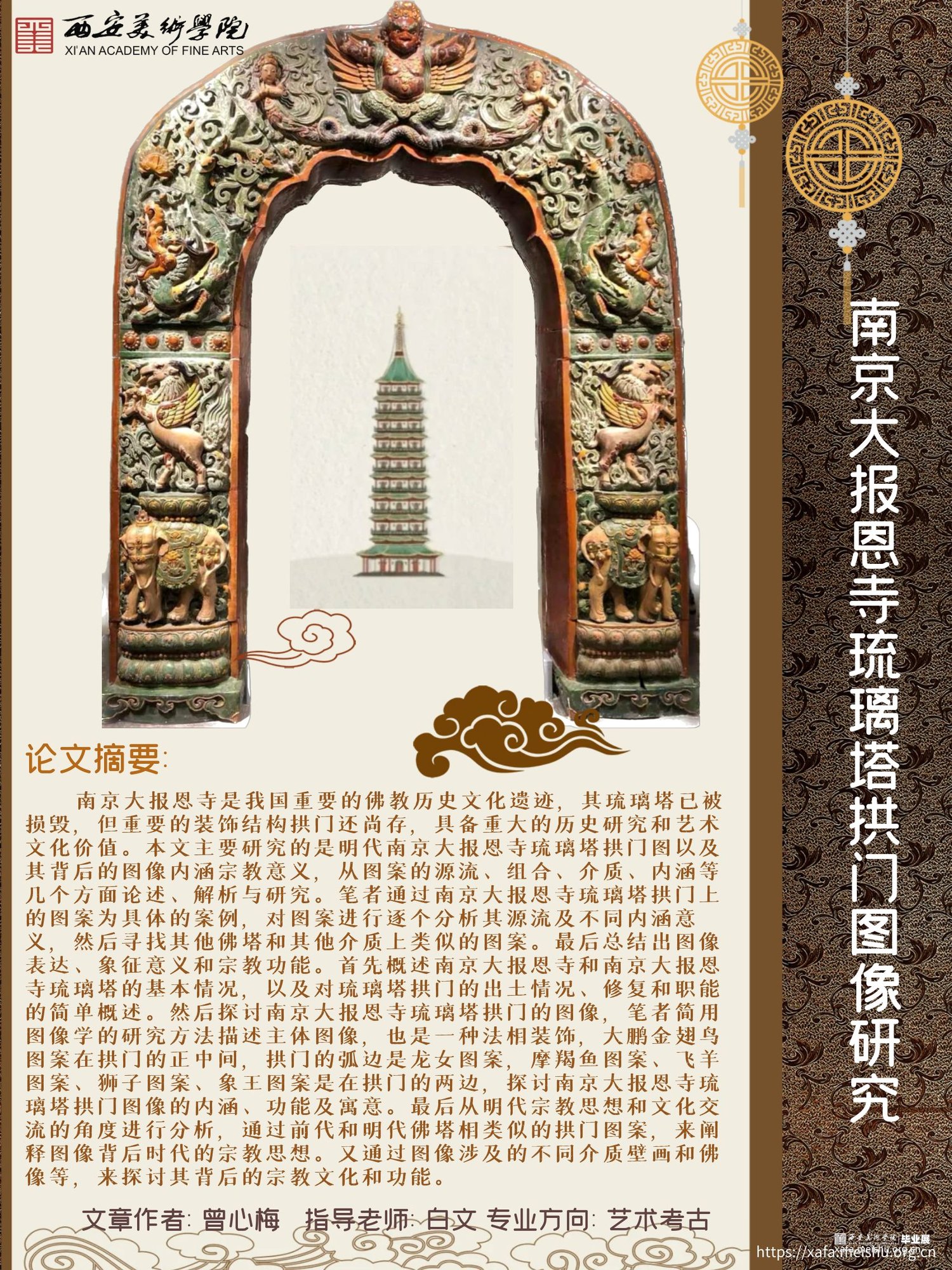 南京大报恩寺是我国重要的佛教历史文化遗迹,其琉璃塔已被损毁,但重要的装饰结构拱门还尚存,具备重大的历史研究和艺术文化价值。本文主要研究的是明代南京大报恩寺琉璃塔拱门图以及其背后的图像内涵宗教意义,从图案的源流、组合、介质、内涵等几个方面论述、解析与研究。笔者通过南京大报恩寺琉璃塔拱门上的图案为具体的案例,对图案进行逐个分析其源流及不同内涵意义,然后寻找其他佛塔和其他介质上类似的图案。最后总结出图像表达、象征意义和宗教功能。首先概述南京大报恩寺和南京大报恩寺琉璃塔的基本情况,以及对琉璃塔拱门的出土情况、修复