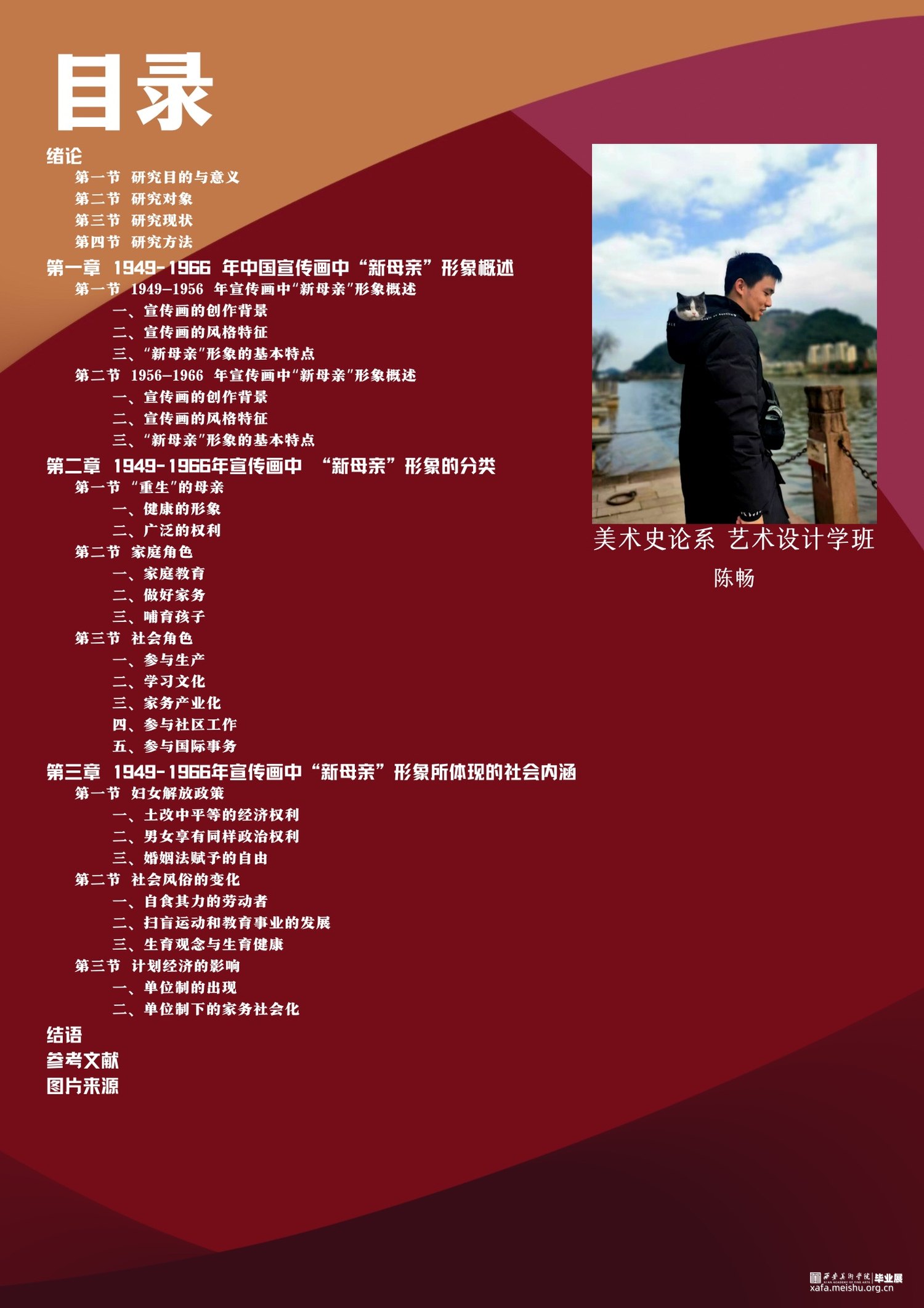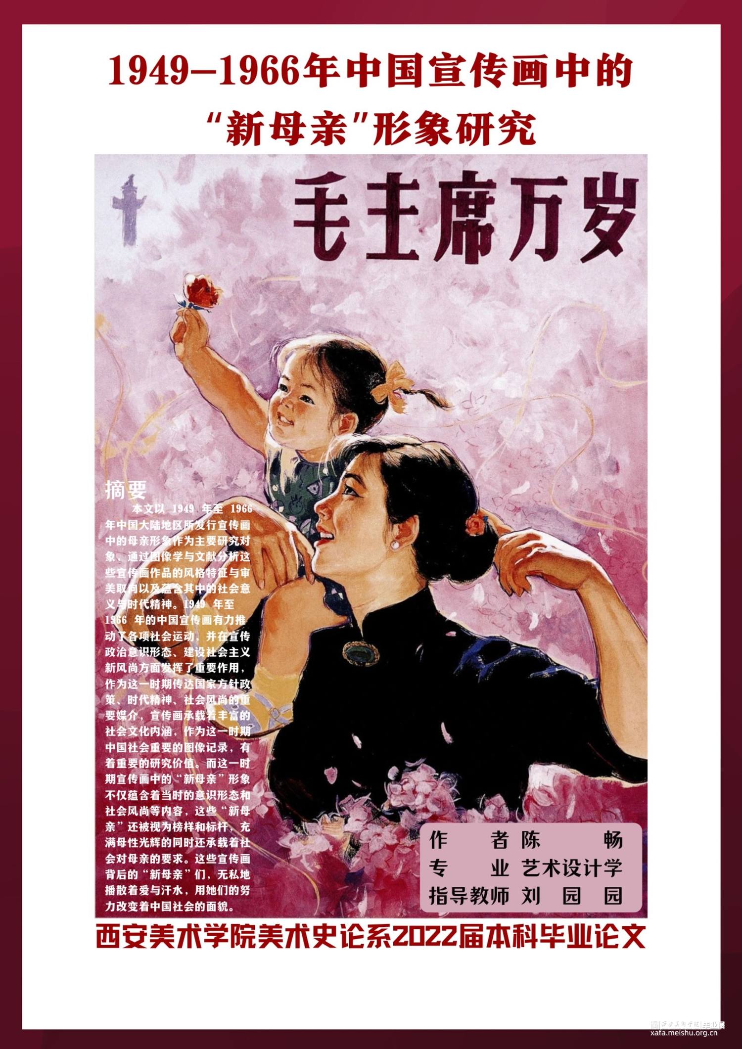 本文以1949年至1966年中国大陆地区所发行宣传画中的母亲形象作为主要研究对象,通过图像学与文献分析这些宣传画作品的风格特征与审美取向以及蕴含其中的社会意义与时代精神。1949年至1966年的中国宣传画有力推动了各项社会运动,并在宣传政治意识形态、建设社会主义新风尚方面发挥了重要作用,作为这一时期传达国家方针政策、时代精神、社会风尚的重要媒介,宣传画承载着丰富的社会文化内涵,作为这一时期中国社会重要的图像记录,有着重要的研究价值。而这一时期宣传画中的“新母亲”形象不仅蕴含着当时的意识形态和社会风尚等内容,这些“新母亲”还被视为榜样和标杆,充满母性光辉的同时还承载着社会对母亲的要求。这些宣传画背后的“新母亲”们,无私地播散着爱与汗水,用她们的努力改变着中国社会的面貌。