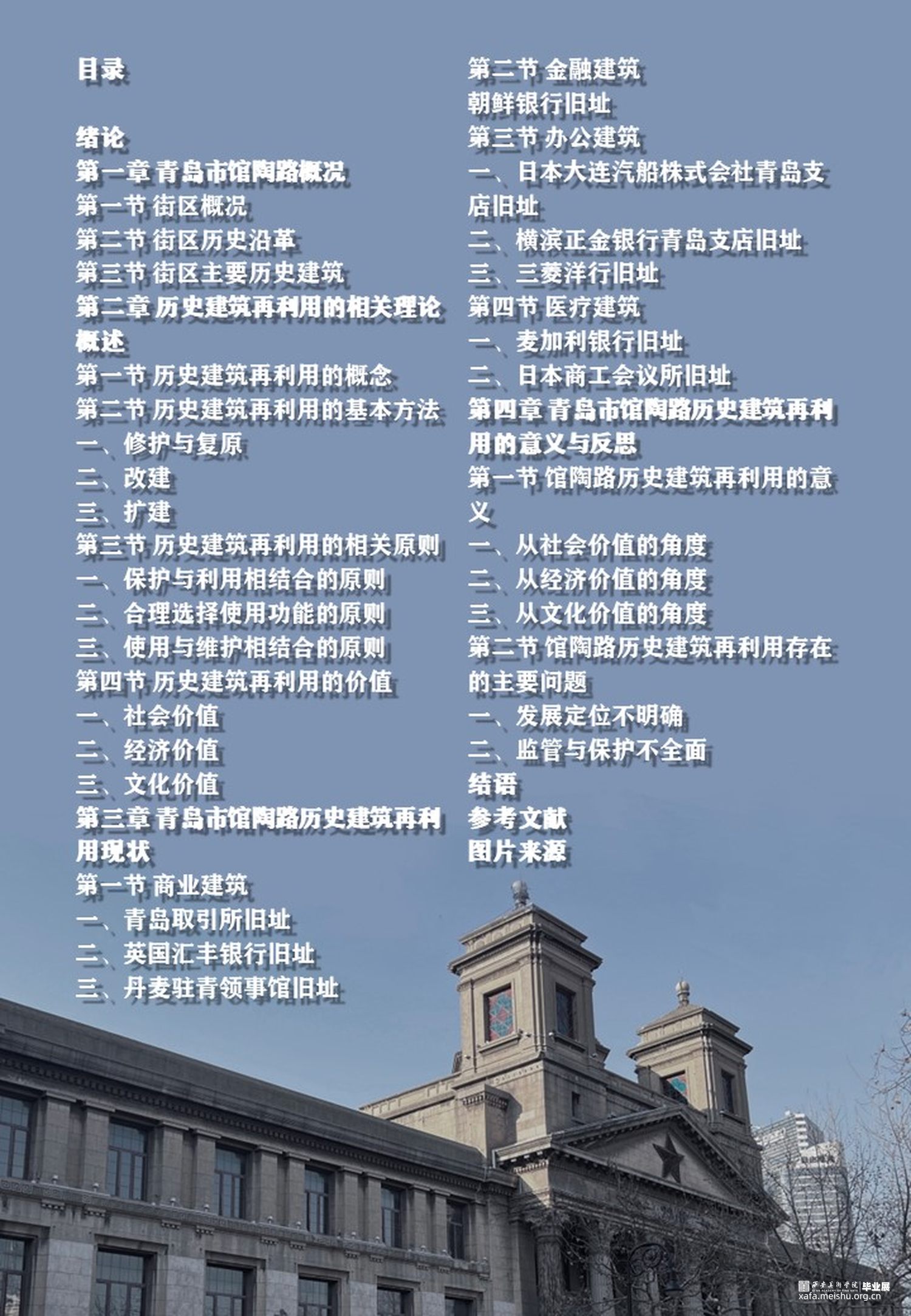 青岛曾经被作为德国和日本的殖民地,因此保留有许多的殖民建筑。馆陶路作为殖民时期青岛的金融中心,保留了许多的金融、商业等历史建筑,它们不仅是曾经馆陶路的辉煌与青岛被侵占的历史见证,同时也是珍贵的建筑遗产。但随着时间推移,这些建筑因为各种因素,有些已经损坏,有些经过改造仍然在使用。因此馆陶路区域的历史建筑的保护与利用情况值得我们进行研究与探讨。
