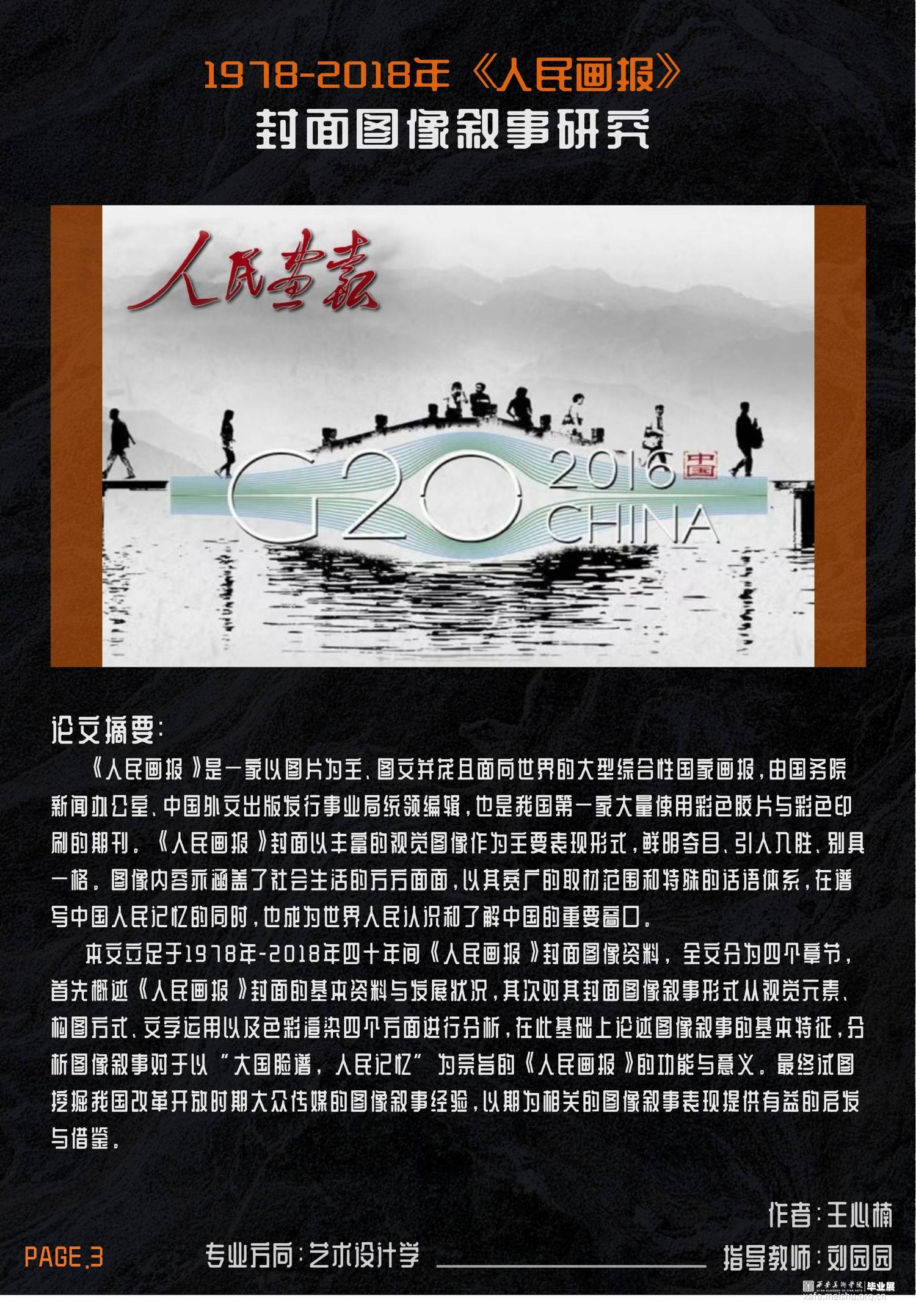 本文立足于1978年-2018年四十年间《人民画报》封面图像资料,全文分为四个章节,首先概述《人民画报》封面的基本资料与发展状况,其次对其封面图像叙事形式从视觉元素、构图方式、文字运用以及色彩渲染四个方面进行分析,在此基础上论述图像叙事的基本特征,分析图像叙事对于以“大国脸谱,人民记忆”为宗旨的《人民画报》的功能与意义。最终试图挖掘我国改革开放时期大众传媒的图像叙事经验,以期为相关的图像叙事表现提供有益的启发与借鉴。