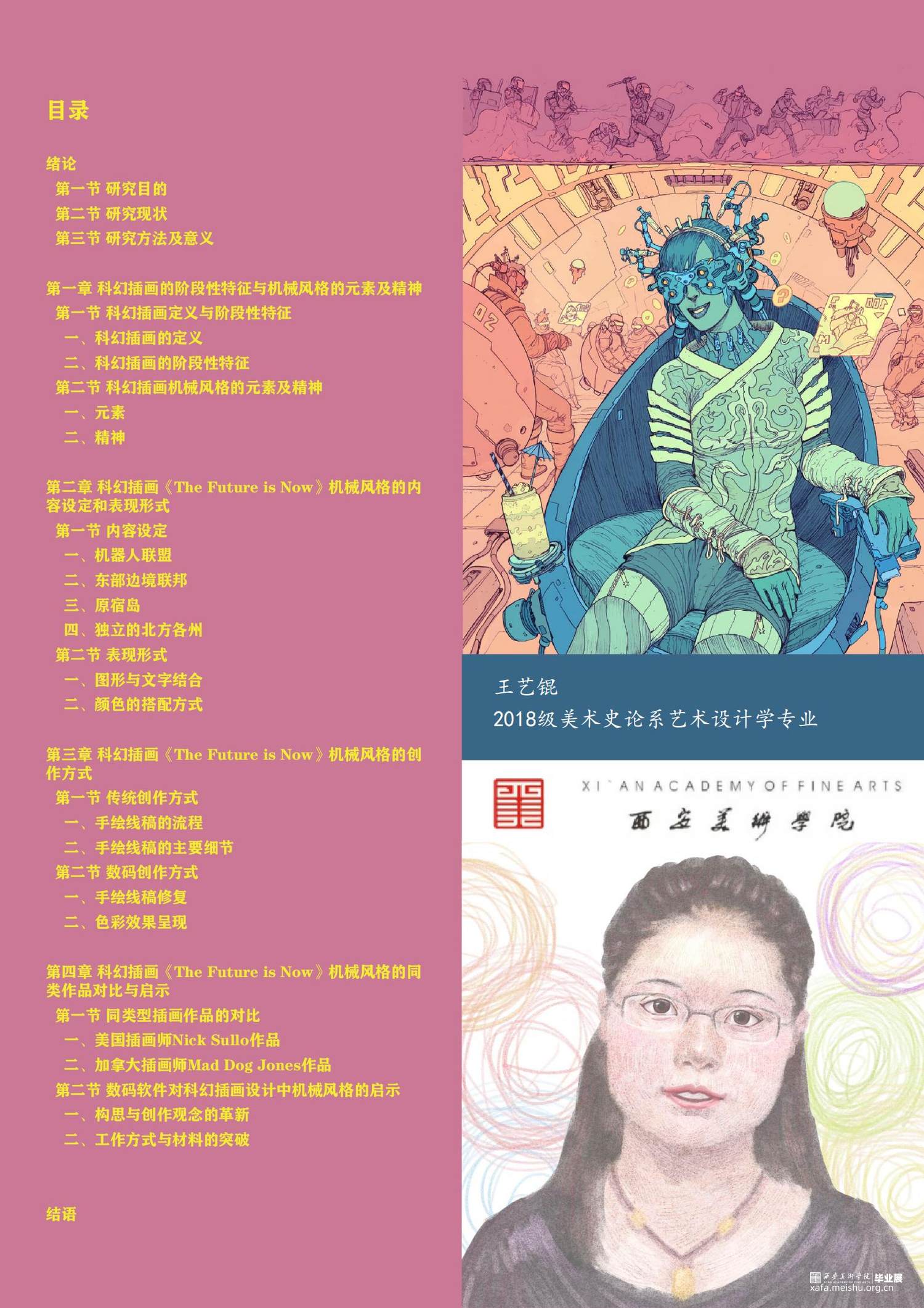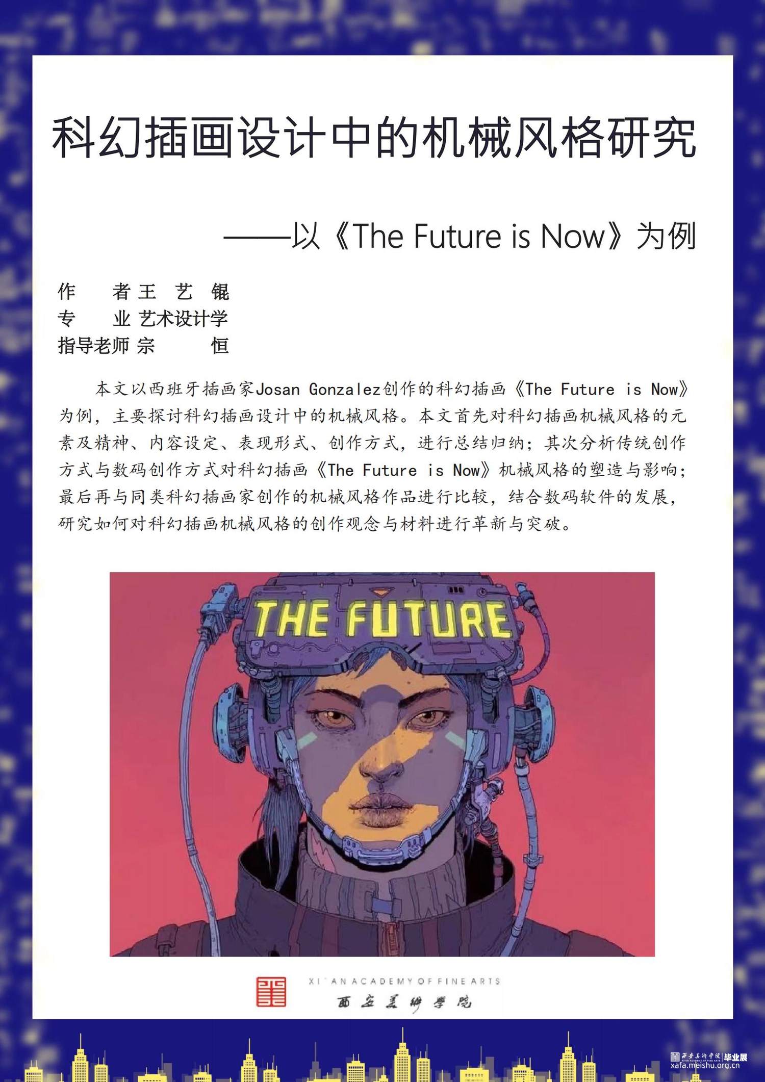 本文以西班牙插画家Josan Gonzalez创作的科幻插画《The Future is Now》为例,主要探讨科幻插画设计中的机械风格。本文首先对科幻插画机械风格的元素及精神、内容设定、表现形式、创作方式,进行总结归纳;其次分析传统创作方式与数码创作方式对科幻插画《The Future is Now》机械风格的塑造与影响;最后再与同类科幻插画家创作的机械风格作品进行比较,结合数码软件的发展,研究如何对科幻插画机械风格的创作观念与材料进行革新与突破。