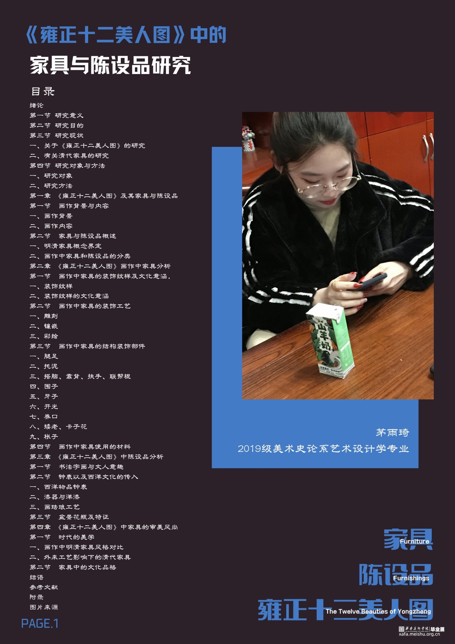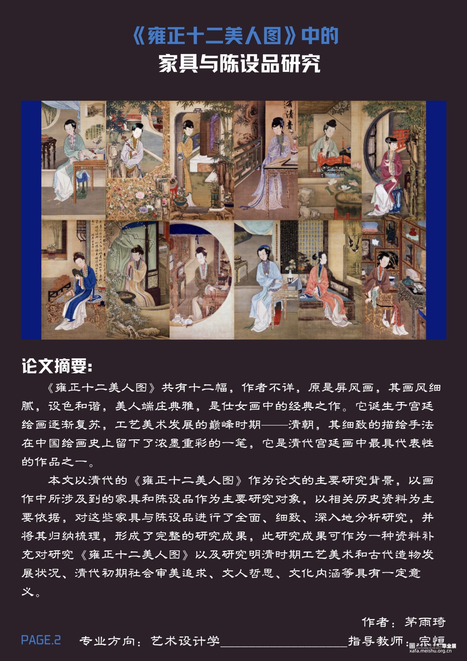 《雍正十二美人图》共有十二幅,作者不详,原是屏风画,其画风细腻,设色和谐,美人端庄典雅,是仕女画中的经典之作。本文以清代的《雍正十二美人图》作为论文的主要研究背景,以画作中所涉及到的家具和陈设品作为主要研究对象,以相关历史资料为主要依据,对这些家具与陈设品进行了全面、细致、深入地分析研究,并将其归纳梳理,形成了完整的研究成果,此研究成果可作为一种资料补充对研究《雍正十二美人图》以及研究明清时期工艺美术和古代造物发展状况、清代初期社会审美追求、文人哲思、文化内涵等具有一定意义。