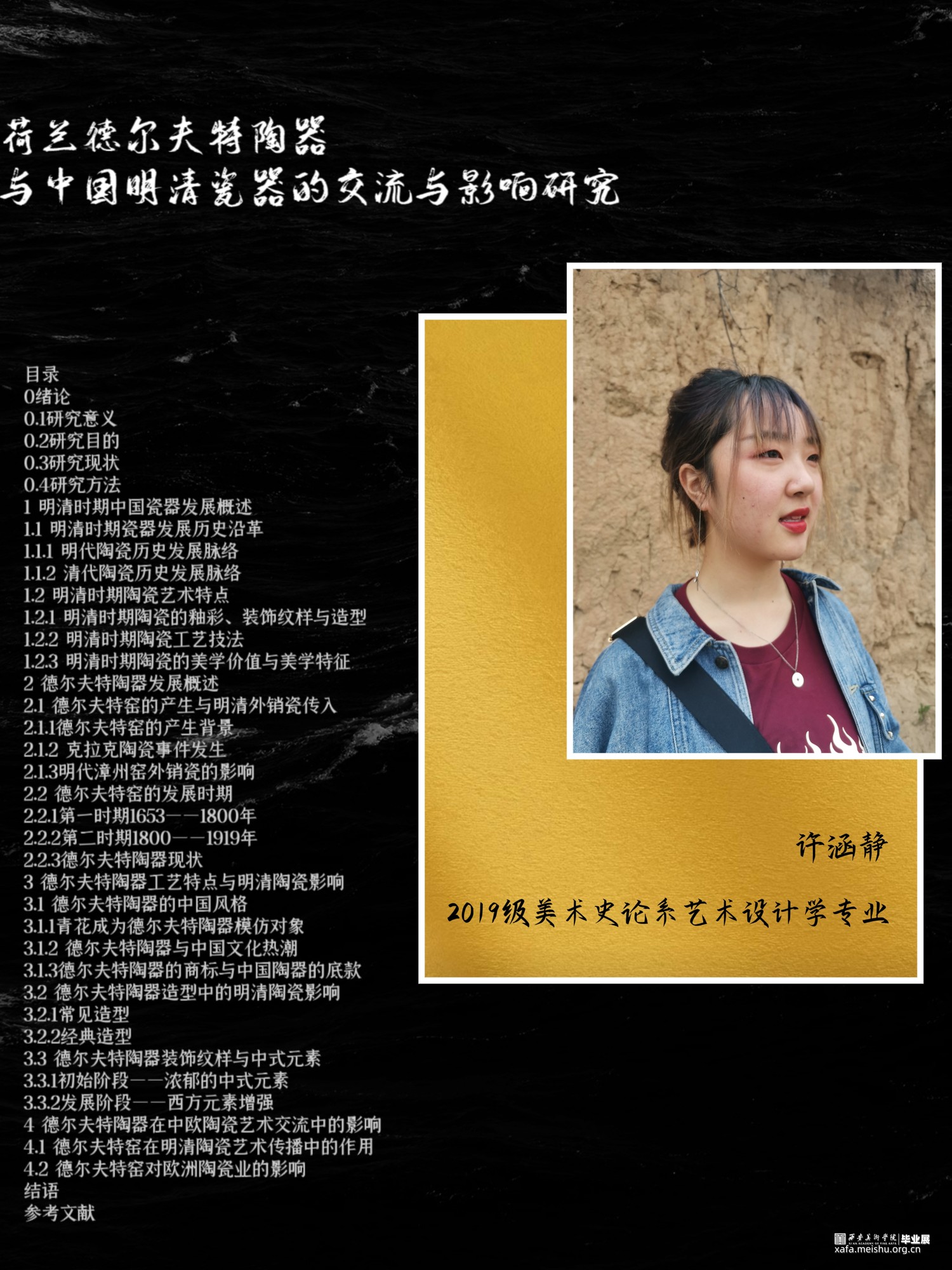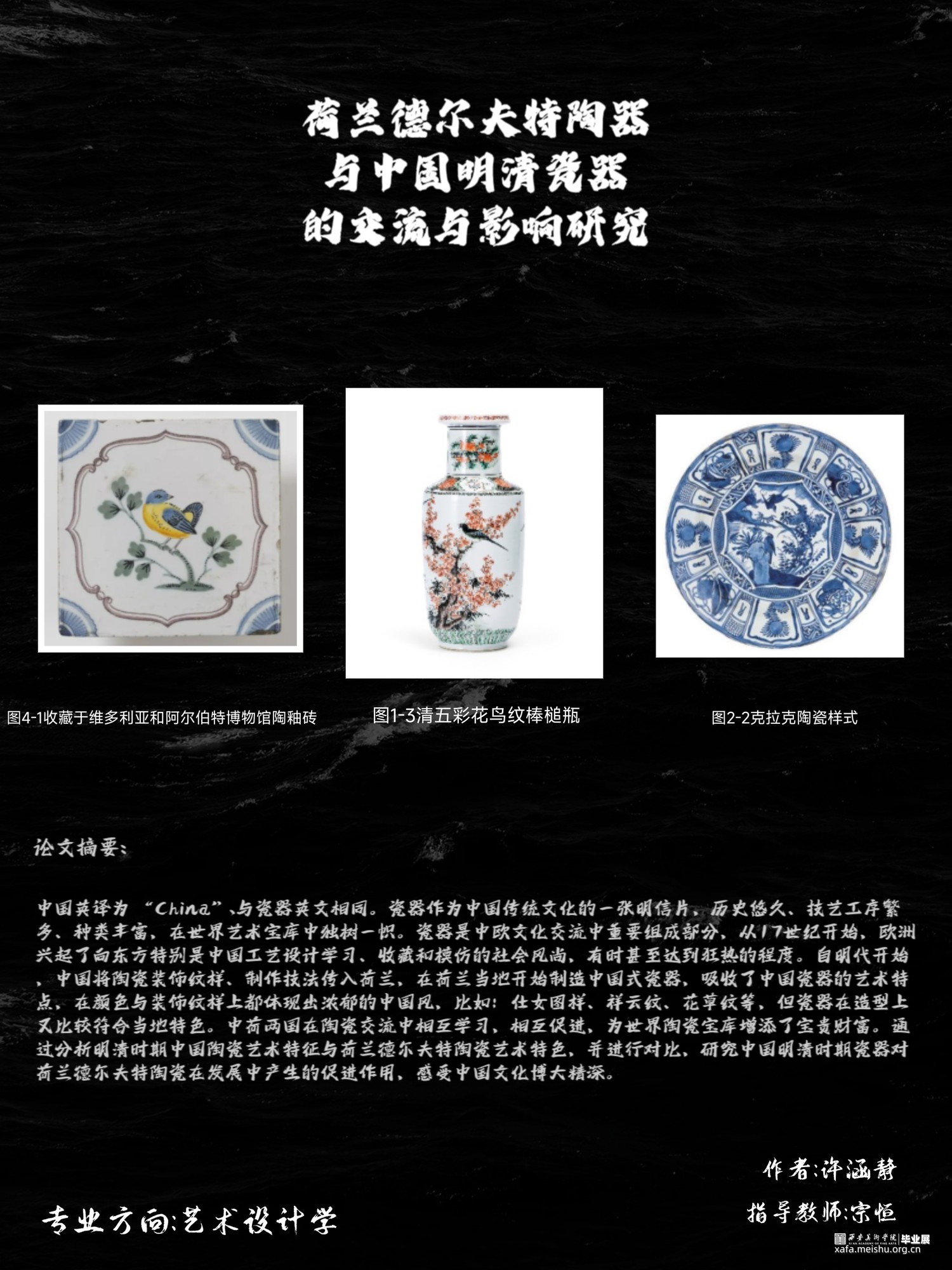 瓷器作为中国传统文化的一张明信片,历史悠久、技艺工序繁多、种类丰富,在世界艺术宝库中独树一帜。瓷器是中欧文化交流中重要组成部分,从17世纪开始,欧洲兴起了向东方特别是中国工艺设计学习、收藏和模仿的社会风尚,有时甚至达到狂热的程度。自明代开始,中国将陶瓷装饰纹样、制作技法传入荷兰,在荷兰当地开始制造中国式瓷器,吸收了中国瓷器的艺术特点,在颜色与装饰纹样上都体现出浓郁的中国风,比如:仕女图样、祥云纹、花草纹等,但瓷器在造型上又比较符合当地特色。中荷两国在陶瓷交流中相互学习,相互促进,为世界陶瓷宝库增添了宝贵财
