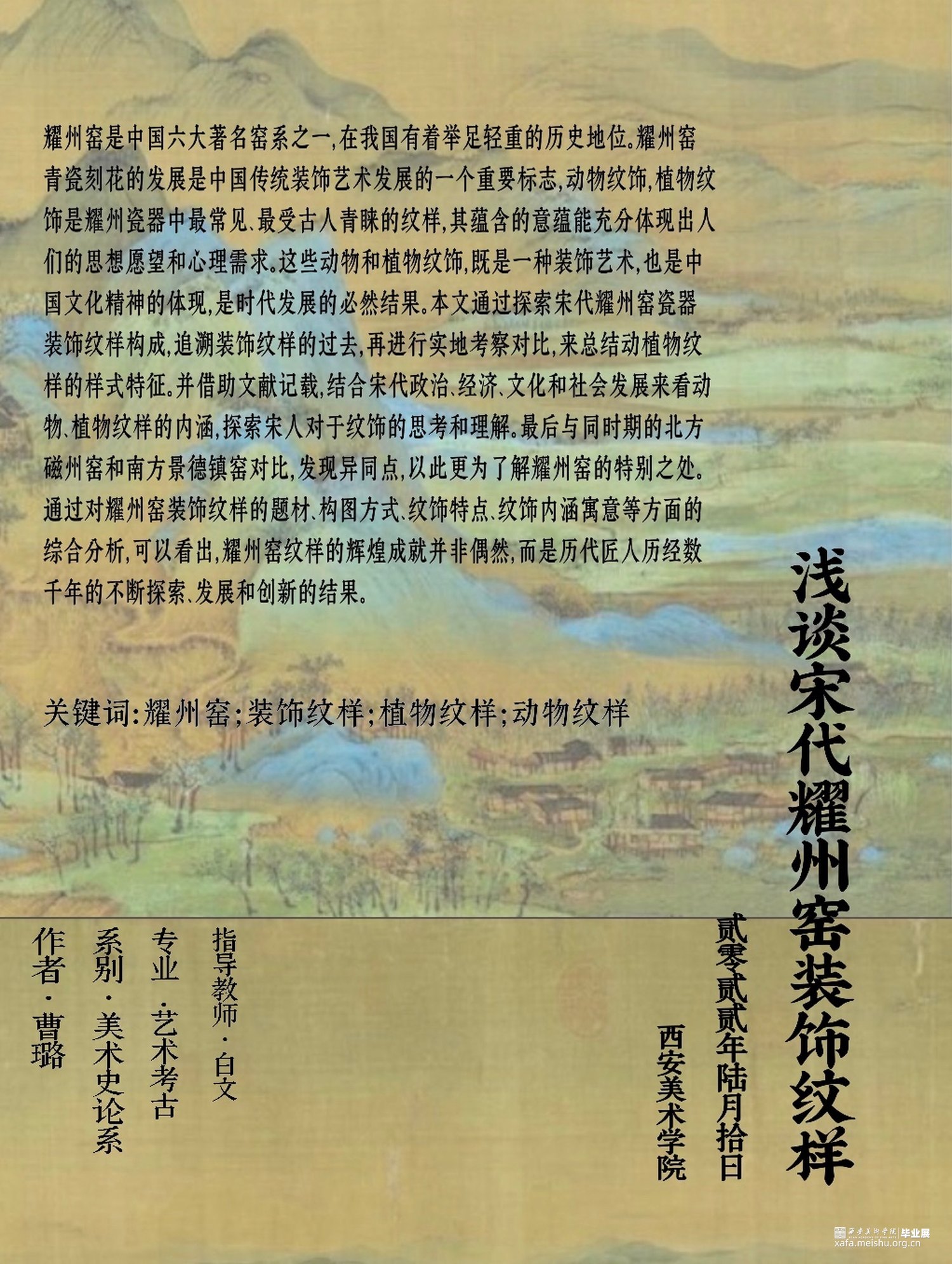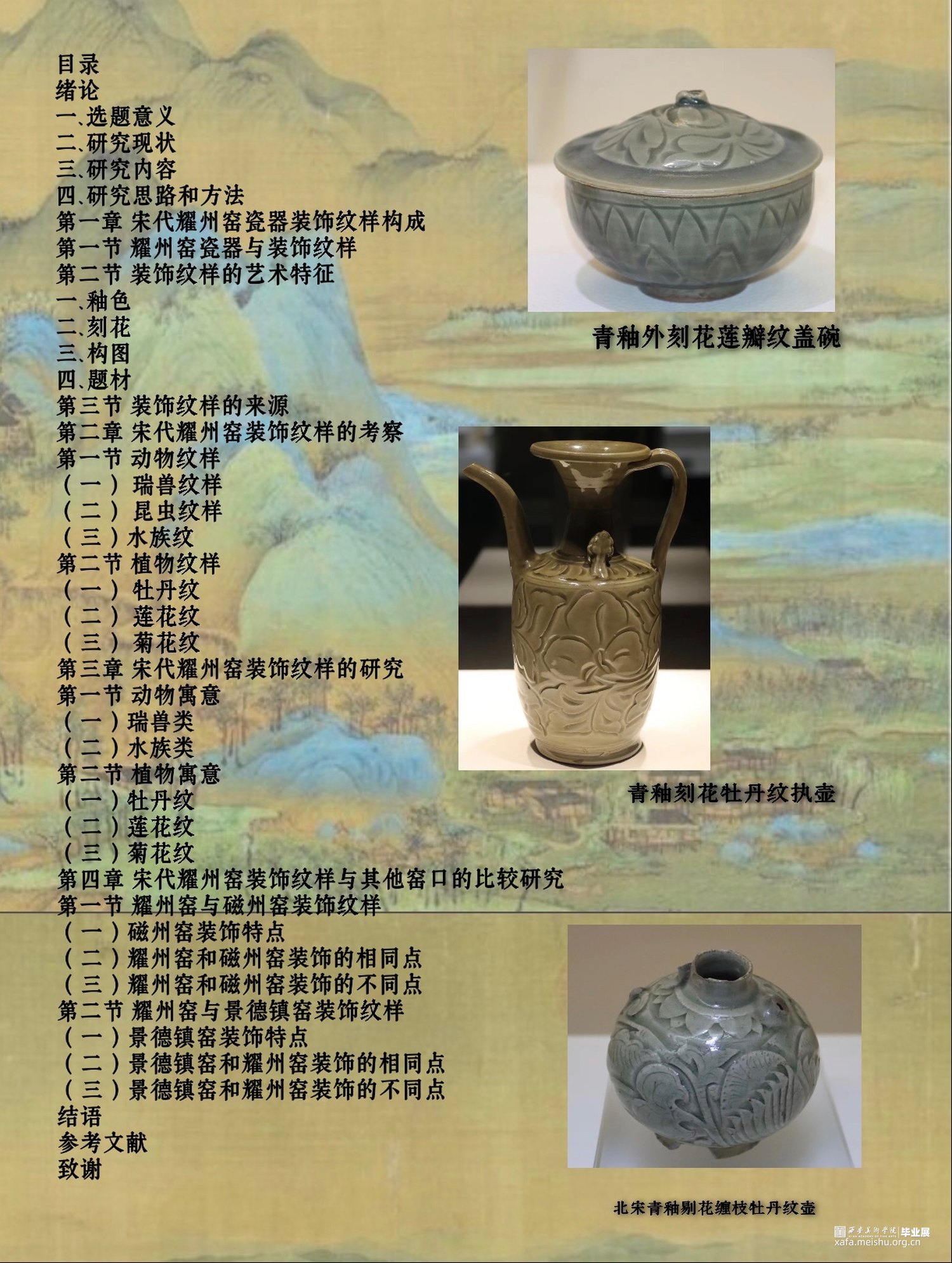 从古至今,以动植物图案作为典型的装饰主题被广泛的运用在各种艺术作品中,这些图案所蕴涵的吉祥含义受到人们推崇,成为人们日常生活中必不可少的一部分,并一直到今天也是流行的趋势。随着时代的进步,动植物纹样在工艺美术上的运用似乎更高。宋代耀州窑青瓷刻花装饰艺术,亦可视为中国古代装饰纹样艺术发展的一个典型,它的胎质细密、釉色柔软、釉层肥厚、釉层光亮,为刻花的装饰创造了良好的环境,使耀州青瓷得到了更多人的喜爱。其中丰富多样的装饰图案,也使耀州青瓷更加展现了古典文化的艺术魅力。耀州窑的装饰图案和关中人的个性一样,简单、