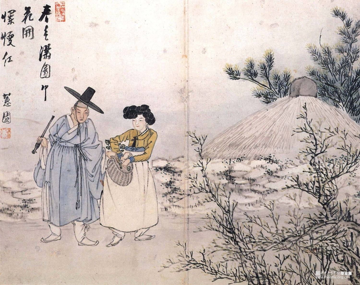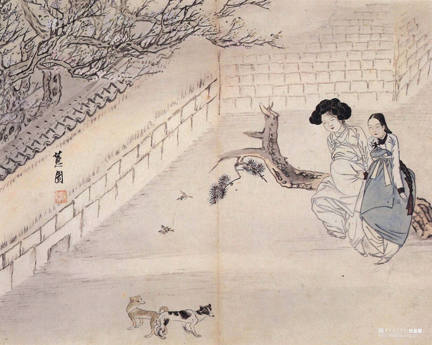 18世纪朝鲜半岛风俗画发展兴盛,金弘道、申润福、金得臣并称为朝鲜“三大风俗画家”。其中李氏朝鲜后期画家申润福的作品与同时代其他风俗画相比,不单表现平民日常劳动生活,更主要表现女性日常生活以及描绘两班贵族与妓生享乐的场景。《蕙园传神帖》正是他“善表现女色情趣”的代表作。《蕙园传神帖》虽然是以情色题材为主的风俗画,但在画风上却有一种清新淡雅的士人风趣,体现了申润福风俗画独特且富有书卷气的风格。