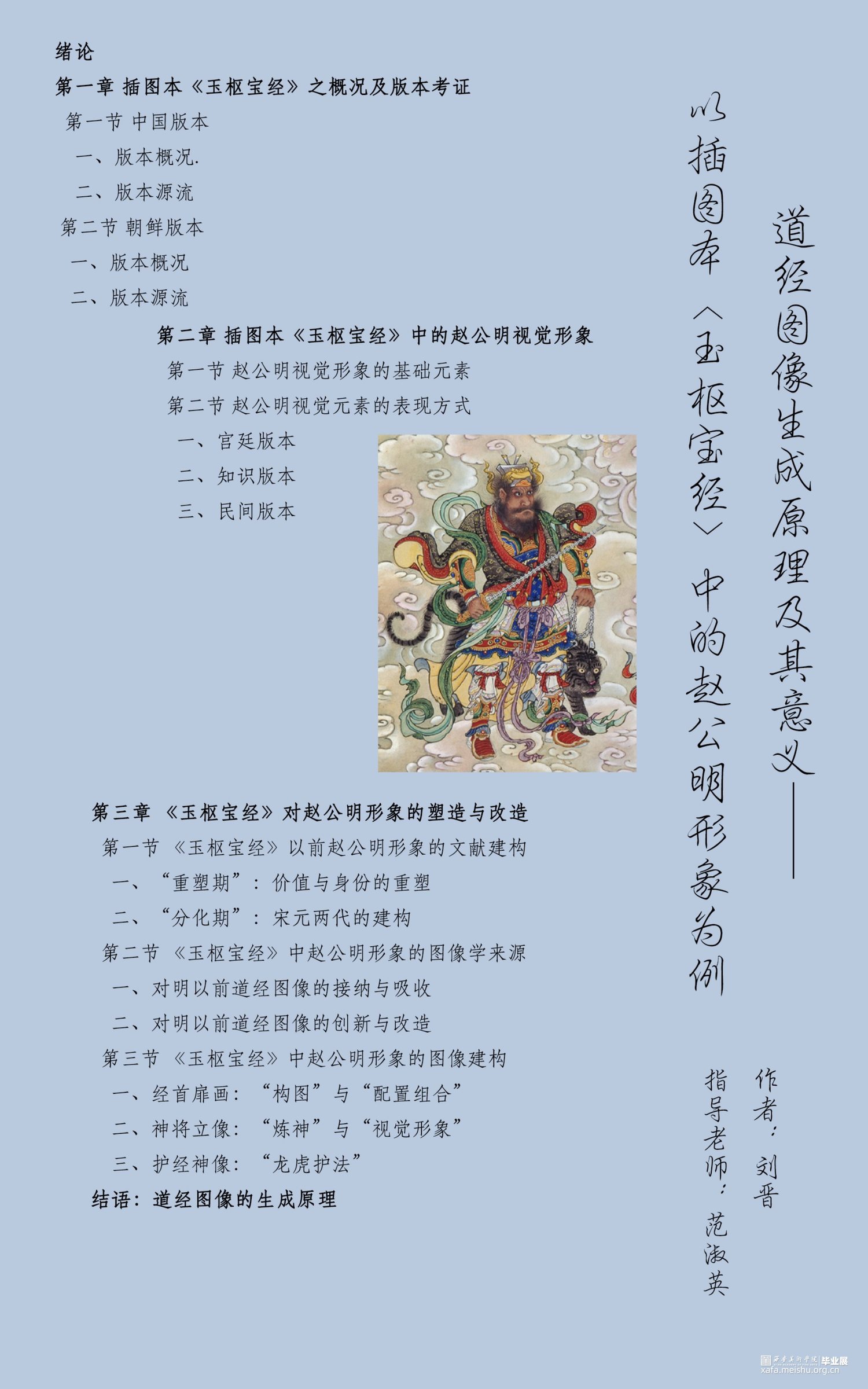第三部分,首先从文献出发,论述赵公明之文献形象,此为其被纳入《玉枢宝经》视觉体系之基础。其次查询、分析其时道经图像,认为《道子墨宝》所绘“都督赵公明”等道经图像为《玉枢宝经》赵公明形象之图像学来源。然后分别论述赵公明为何被纳入经首扉画、神将立像、护经神像等三种图像类型,探究其原因。