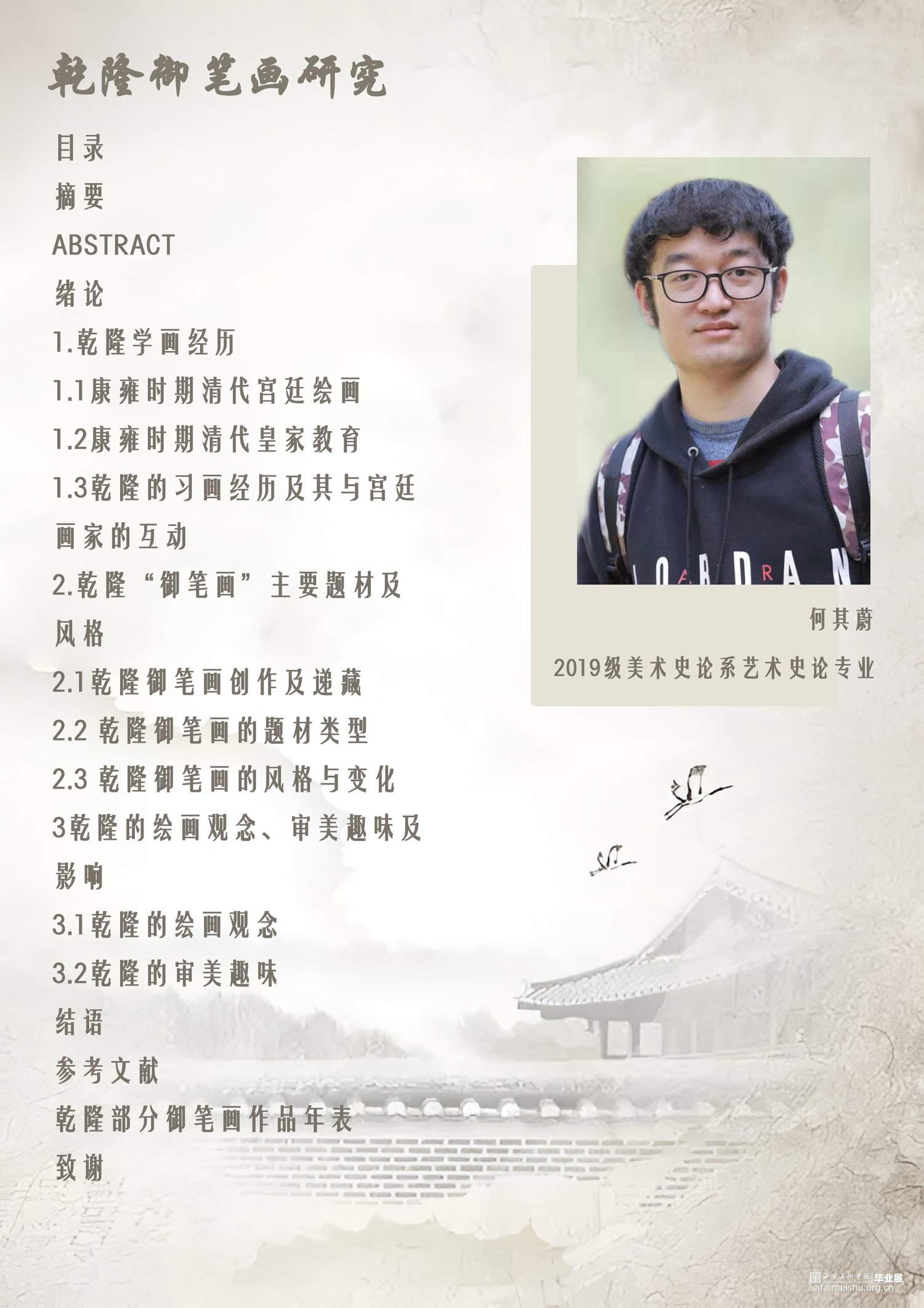 乾隆皇帝作为清朝的第四位皇帝,也是清朝皇帝中对于艺术最有兴趣与研究的皇帝,他除了收藏外,自己也亲自画了不少的御笔画。目前学术界对乾隆本人的习画经历、主要题材及风格、绘画观念的研究仍然很薄弱,乾隆御笔画的整体面貌仍较为模糊,有进一步探讨的空间,故本文主要围绕以上这几点进行讨论。康雍时期以及清朝前期对于皇子的教育都是十分严格的,这也使得皇子们的艺术修养和文化修养都有比较高的水平。乾隆皇帝与当时著名的画家允禧、允禄、西方画家郎世宁等都有比较密切的联系,他的御笔画风格也间接受到他们的影响,尤其是郎世宁的绘画深得乾隆皇帝喜爱。乾隆皇帝的绘画中《双清图》最多,主要是传达出乾隆皇帝对未来的向往之情。乾隆皇帝起初是学习黄筌风格的花鸟画,但是由于过于吃力,也就转向了“古意”的文人画派,尤其是临摹前朝的山水画。乾隆皇帝在不同的阶段一共创作了一千多幅御笔画,山水、花鸟、人物都有所涉猎。其绘画作品在早期略为稚拙,中晚期则逐渐成熟,重视画面细节的表现同时也注重色彩的变化,也充分吸收借鉴前朝优秀画家的作品,他的作品不仅具有艺术价值,也是文化历史的重要遗产。目前对于乾隆的御笔画仍然存在作品记录不完整的问题,据记载乾隆皇帝一共创作了一千多幅御笔画,但笔者找到的图像资料只有百来幅,有很多虽然见于历史记载,但是却没有图像资料的御笔画,仍然需要今后不断整理搜集。